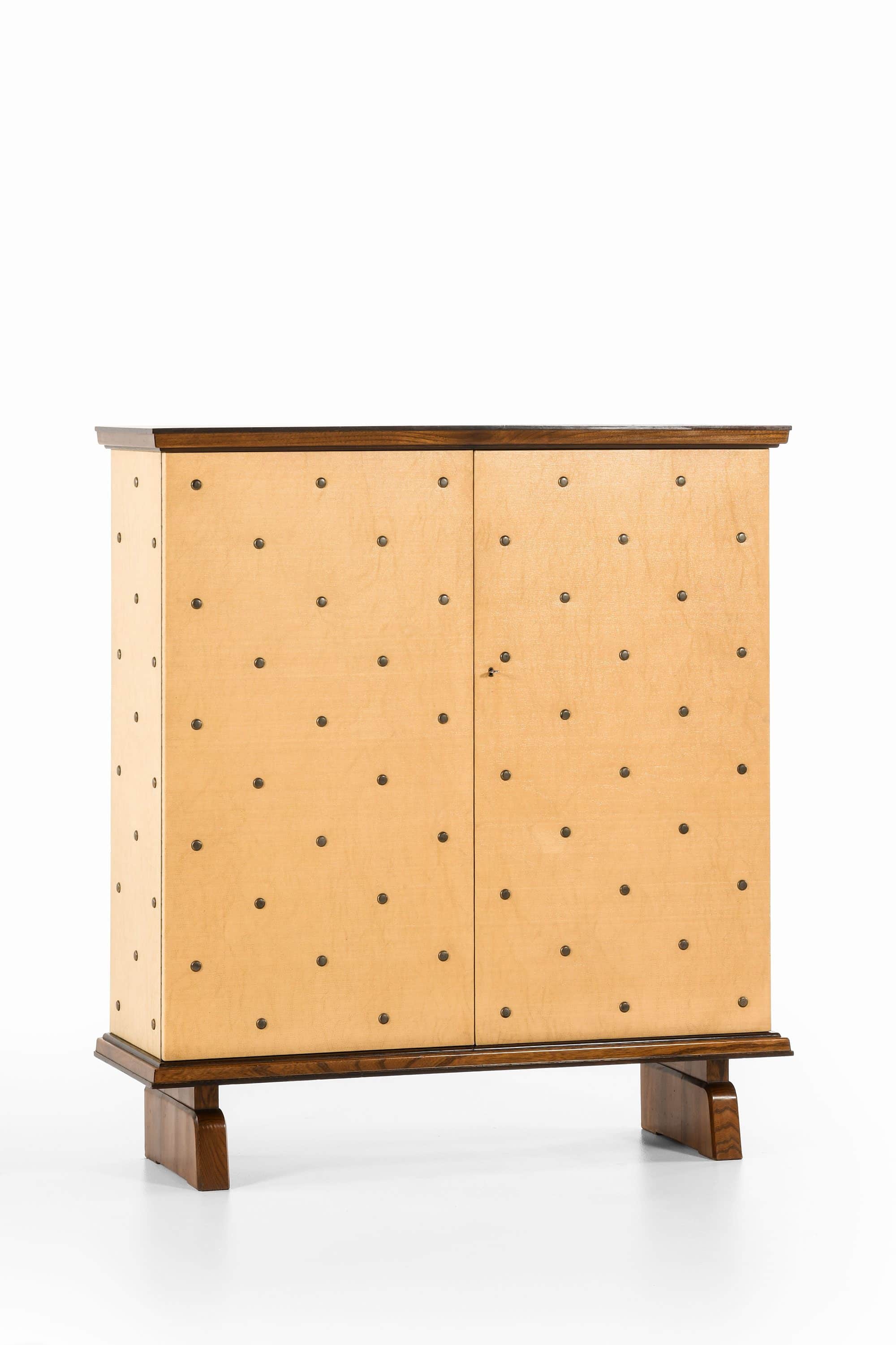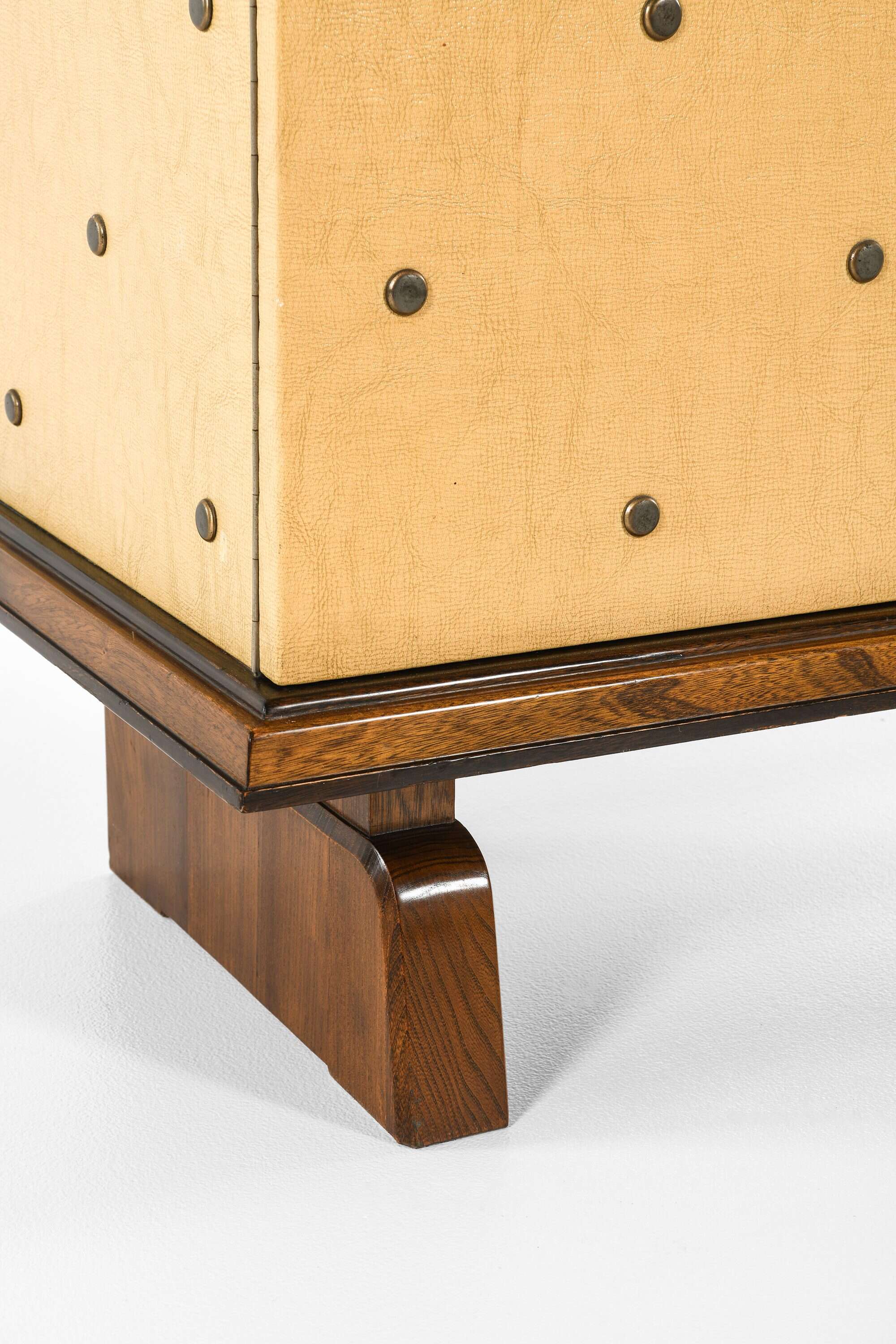 Otto Schulz, the German-born Swedish designer and founder of BOET, occupies a singular place in the evolution of Scandinavian modernism. His work merges geometric clarity with a refined sense of ornamentation, often expressed through innovative surfaces and carefully considered material contrasts. The rare cabinet shown here exemplifies this approach. Constructed from elm and oak, some sections stained for tonal depth, its rectilinear form is fronted with light-colored imitation leather that introduces a soft, tactile counterpoint to the structure.
