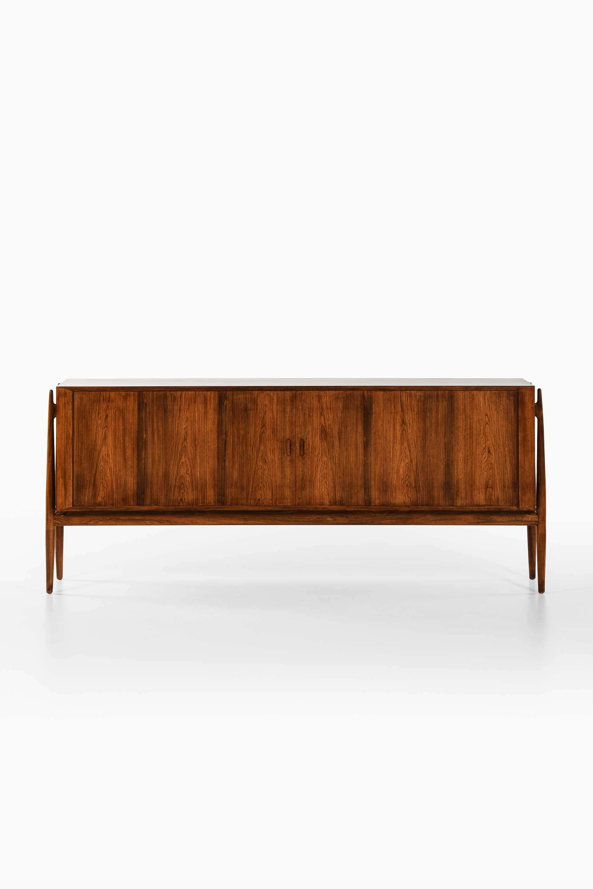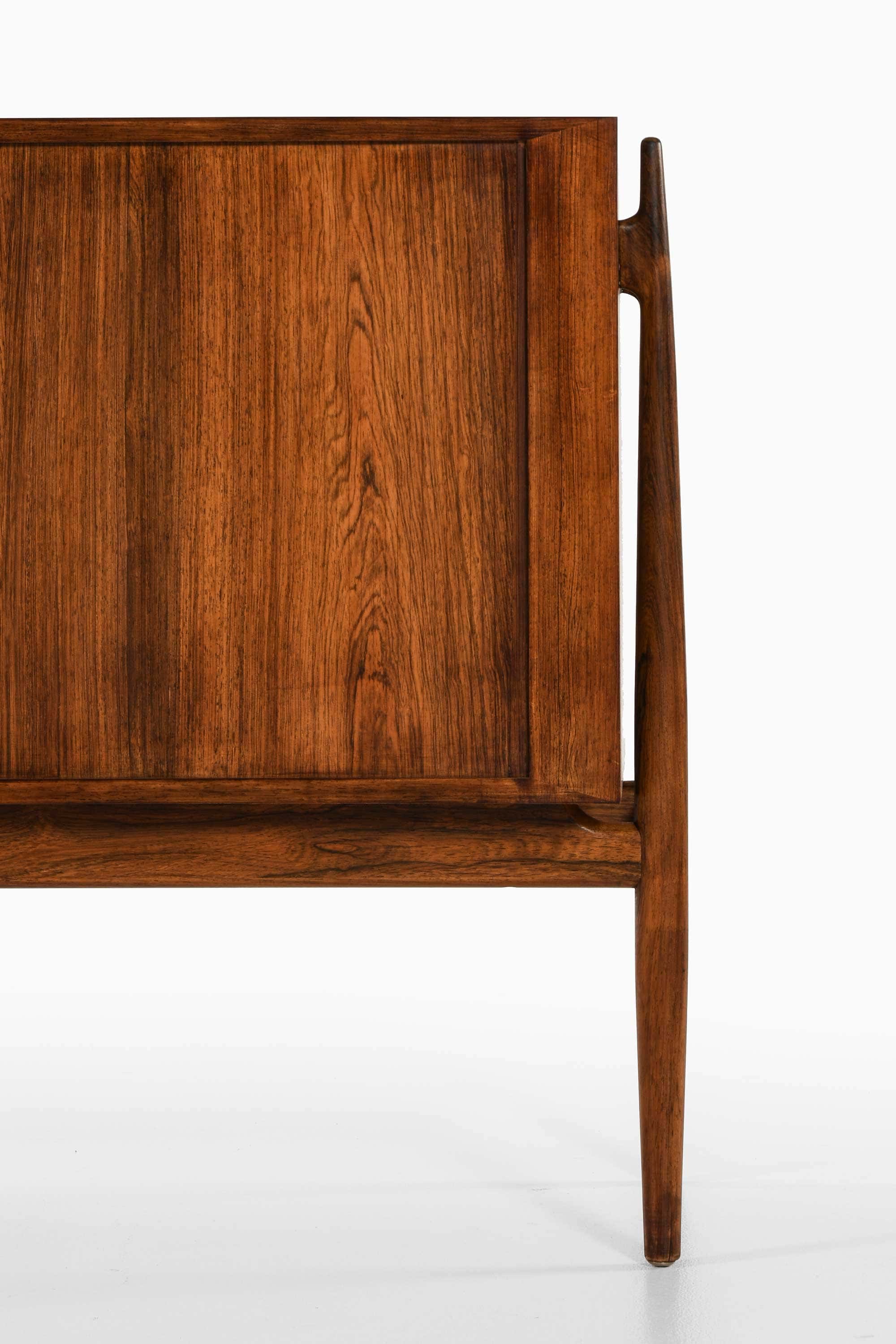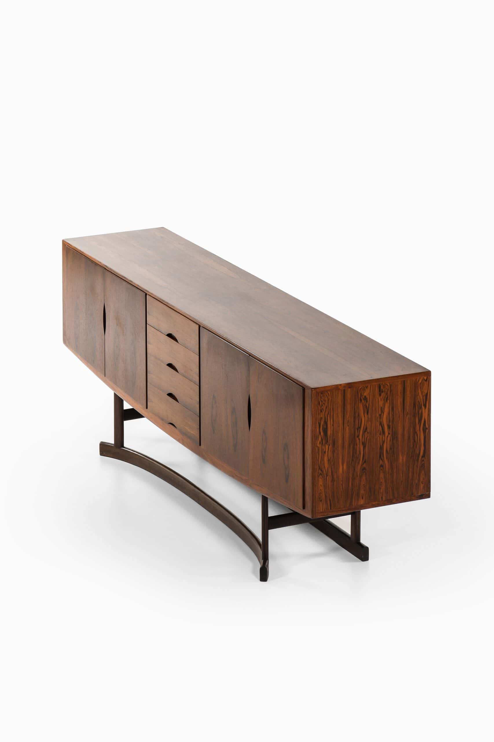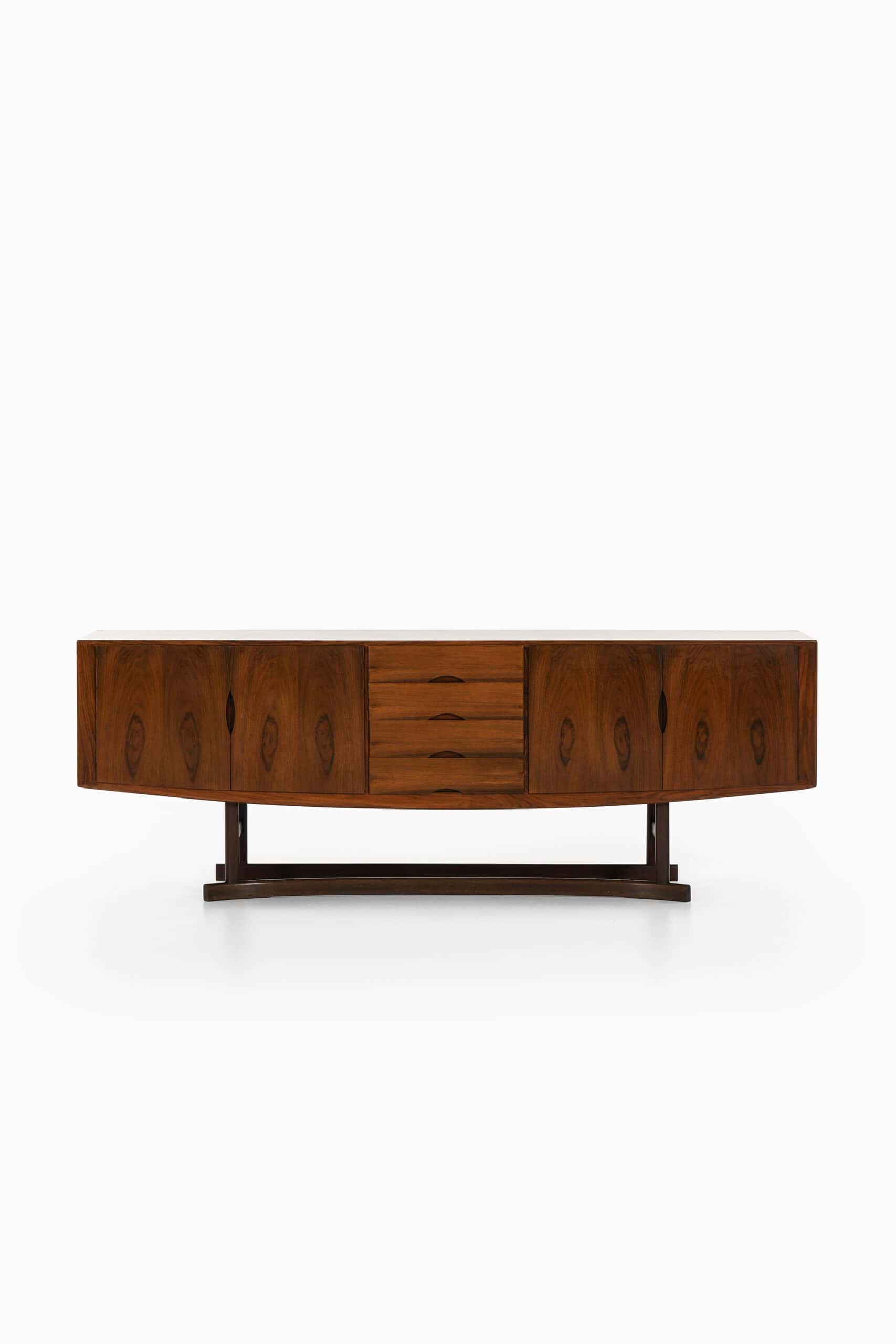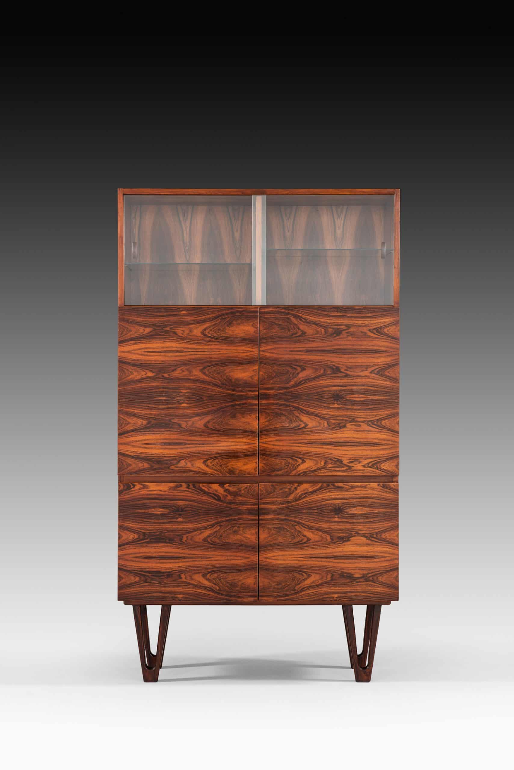 The lower cabinet opens to a grid of small, meticulously crafted internal drawers with recessed pulls, each constructed with precisely matched veneers. The entire structure rests on four U-shaped rosewood legs carved with oval cut-outs, reducing visual weight through negative space. The design reflects Kofod-Larsen’s mastery of proportion and Seffle’s celebrated craftsmanship in exotic hardwood cabinetry.