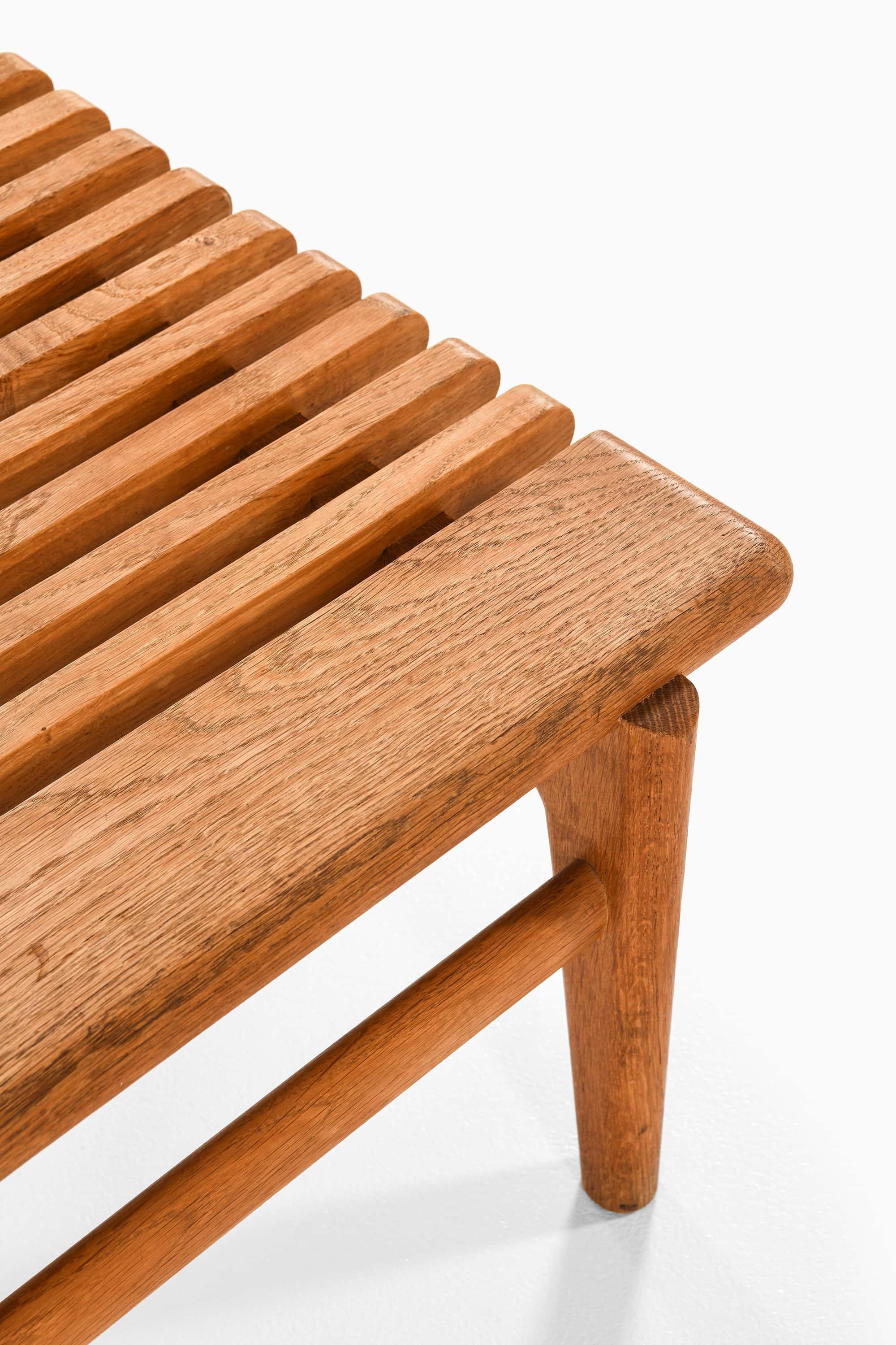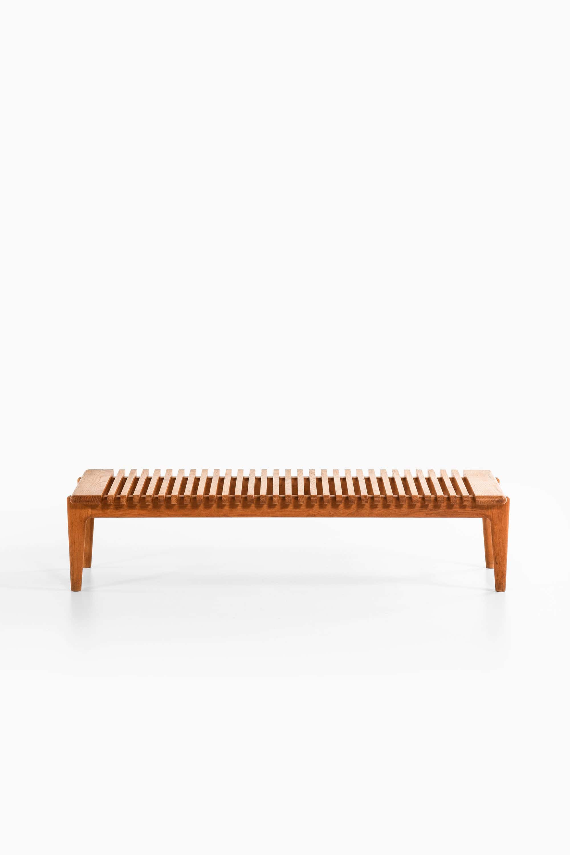 Smaller pieces often allowed Wegner to explore proportion with particular clarity. The side table presented here is crafted from solid oak and features a slatted tabletop composed of evenly spaced wooden elements. This construction introduces a sense of visual rhythm and lightness while maintaining structural strength.