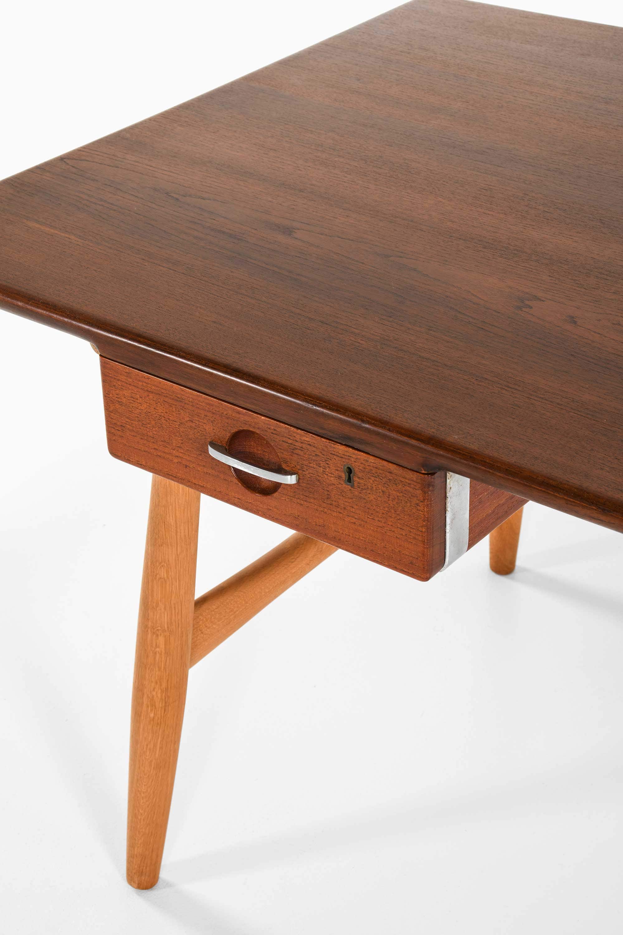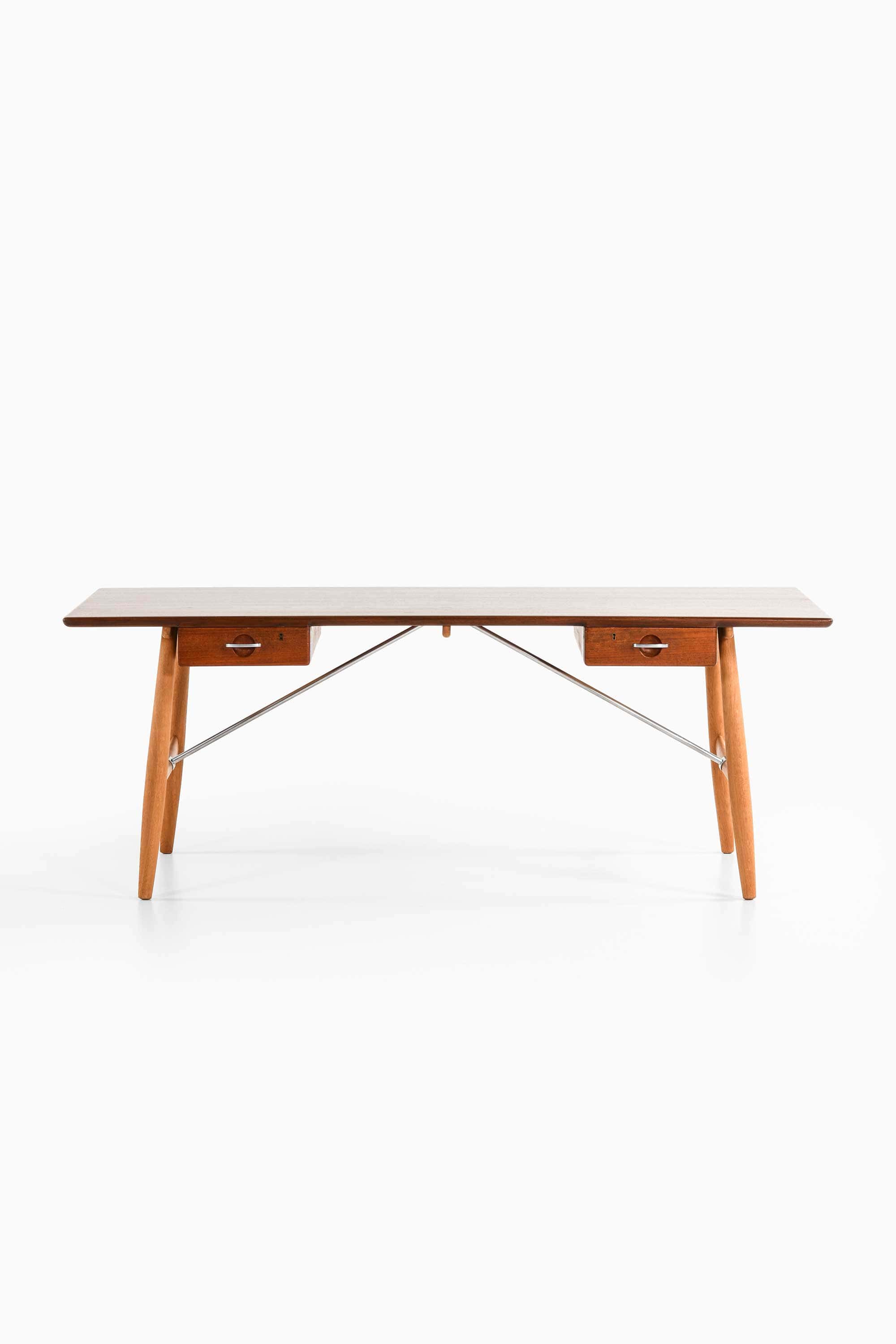 The architect’s desk demonstrates another aspect of Wegner’s design philosophy, combining practical function with refined material composition. The desk integrates a teak veneer tabletop with solid oak legs and slender steel tension rods that stabilize the structure.