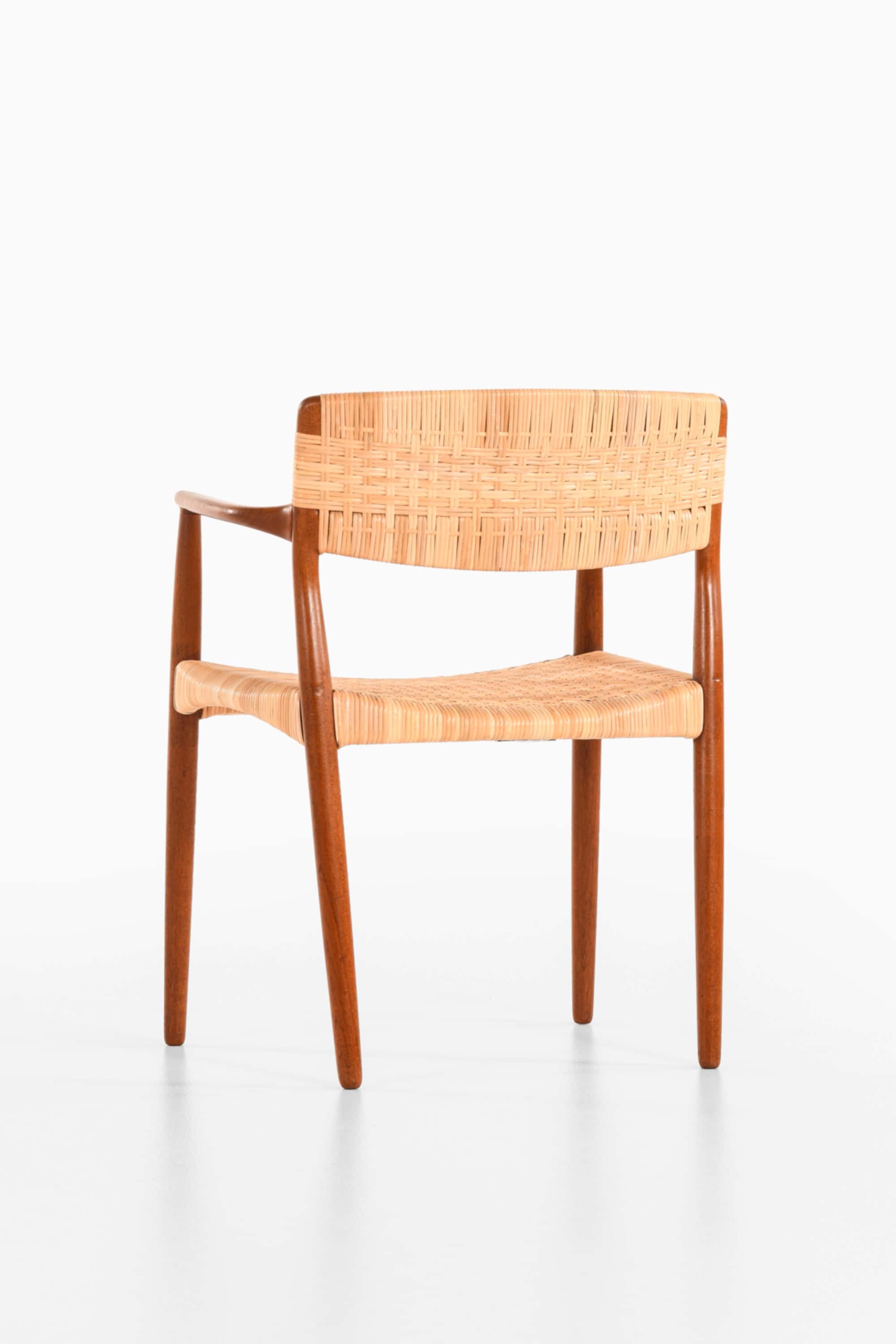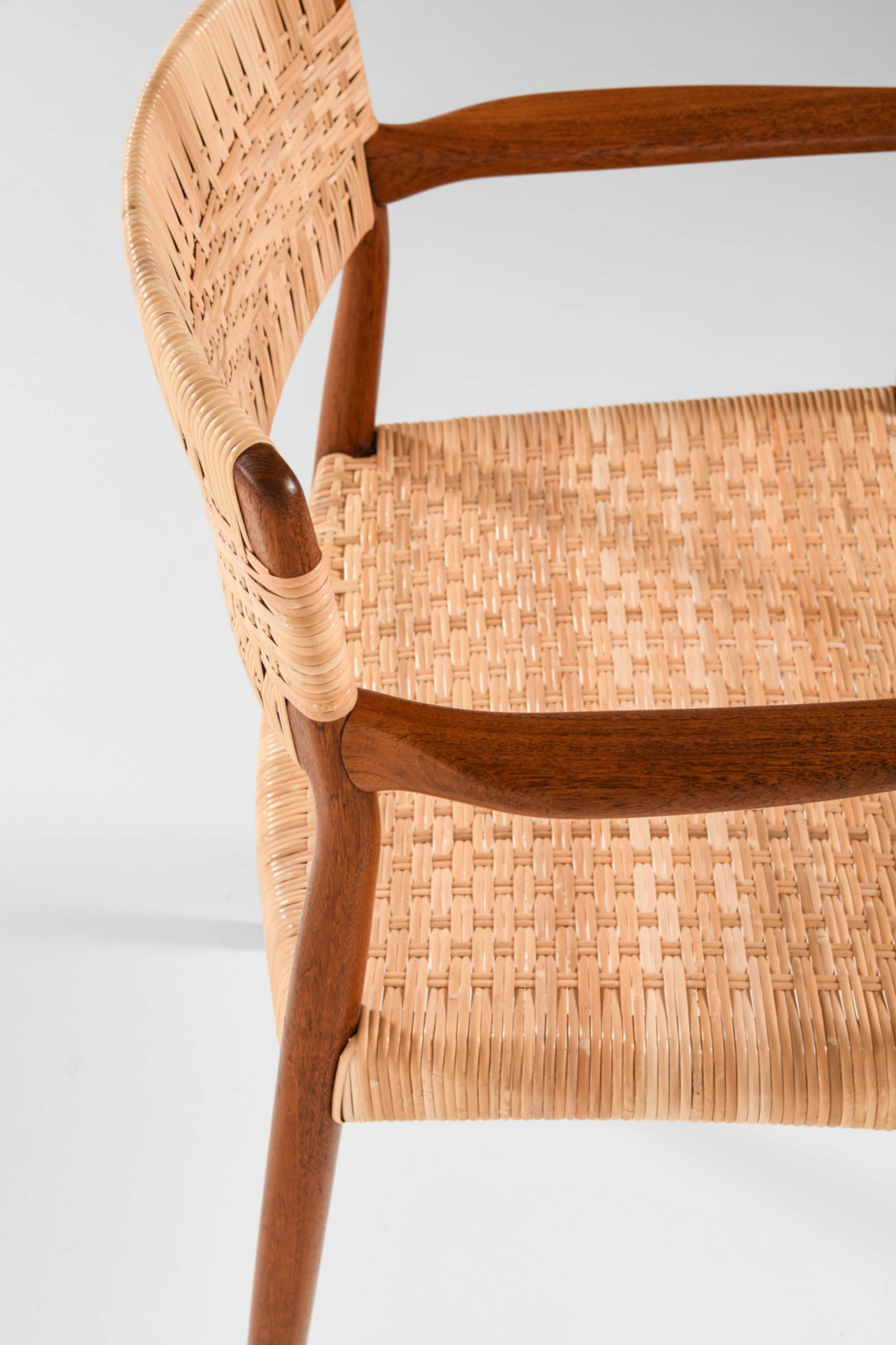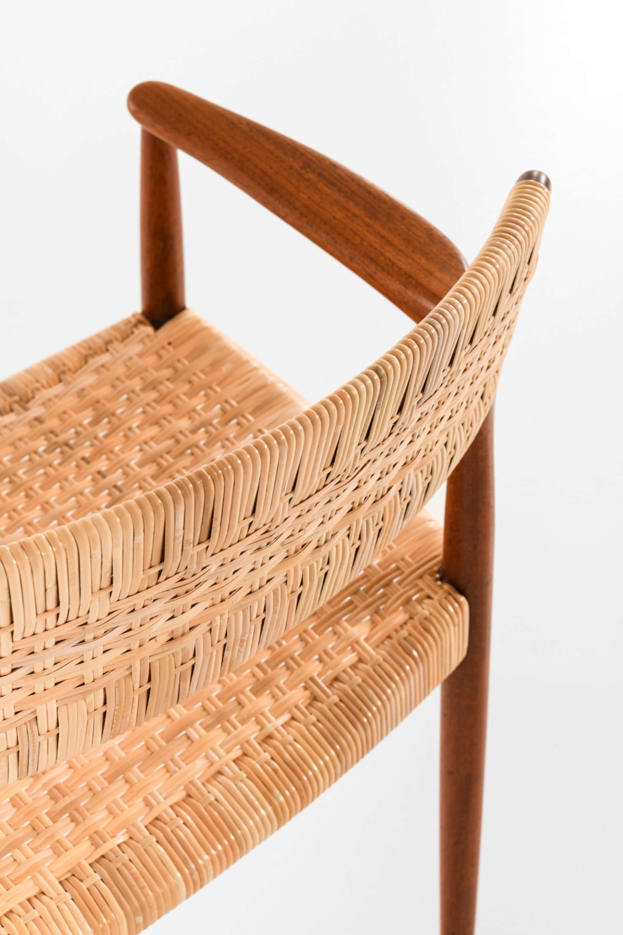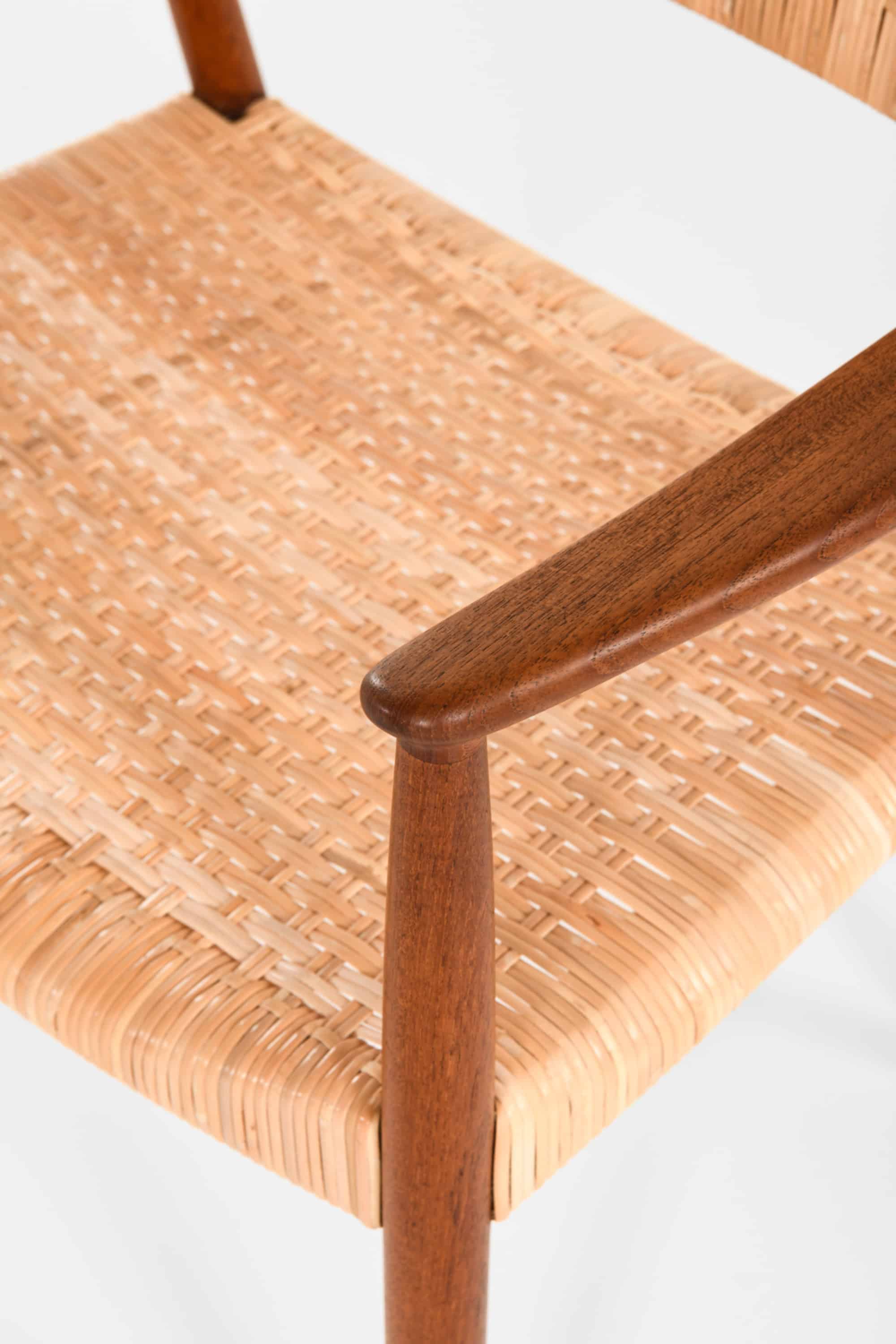 This example remains in excellent condition with small signs of use consistent with age. The cane is intact and recently restored, and the teak frame retains its warm, original finish with only minimal wear. The chair measures 64 cm in width (25.2 inches), 51 cm in depth (20 inches), and 79 cm in height (31.1 inches). The seat height is 43 cm (16.9 inches) and the arm height is 67.5 cm (26.6 inches).