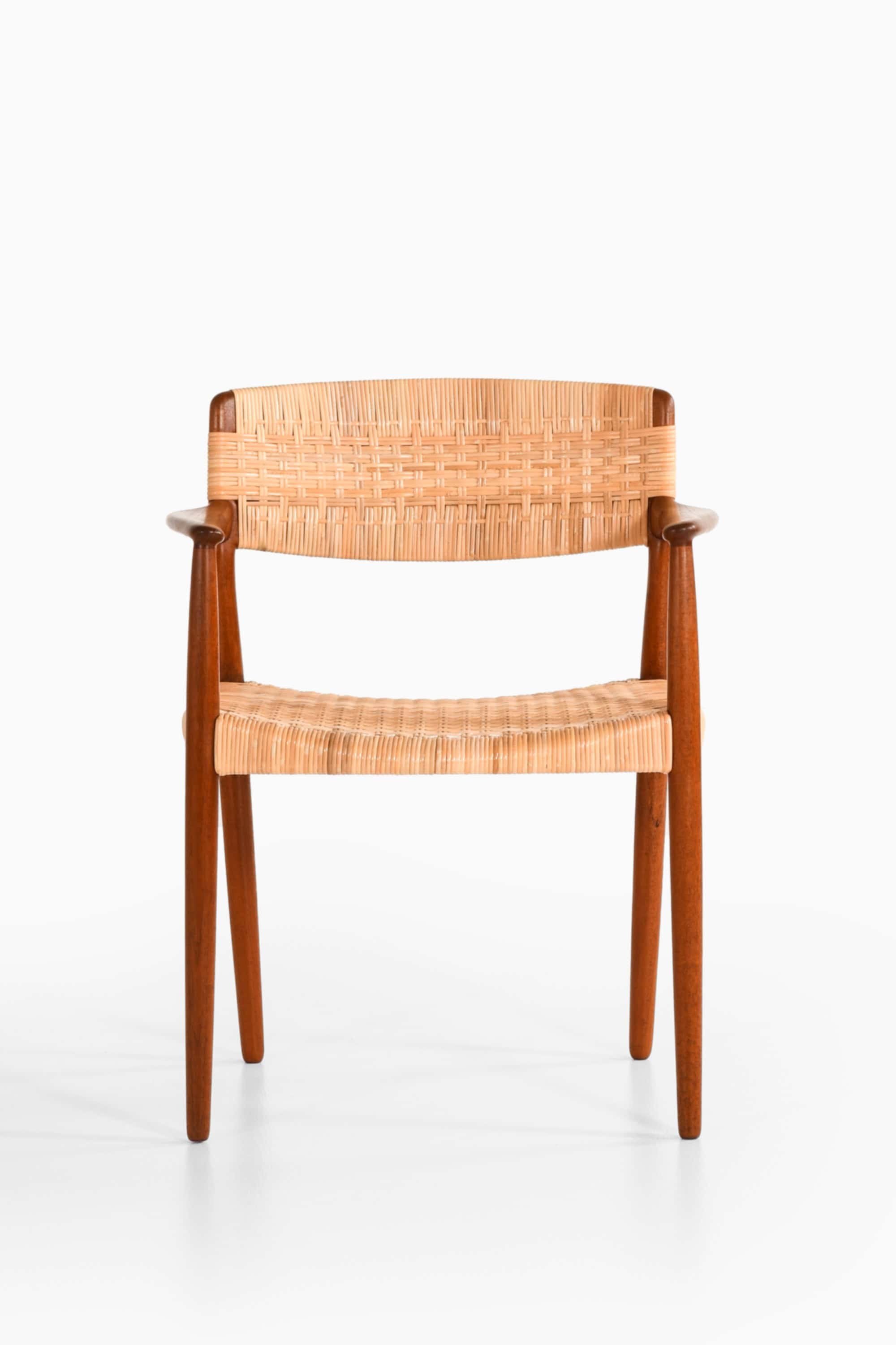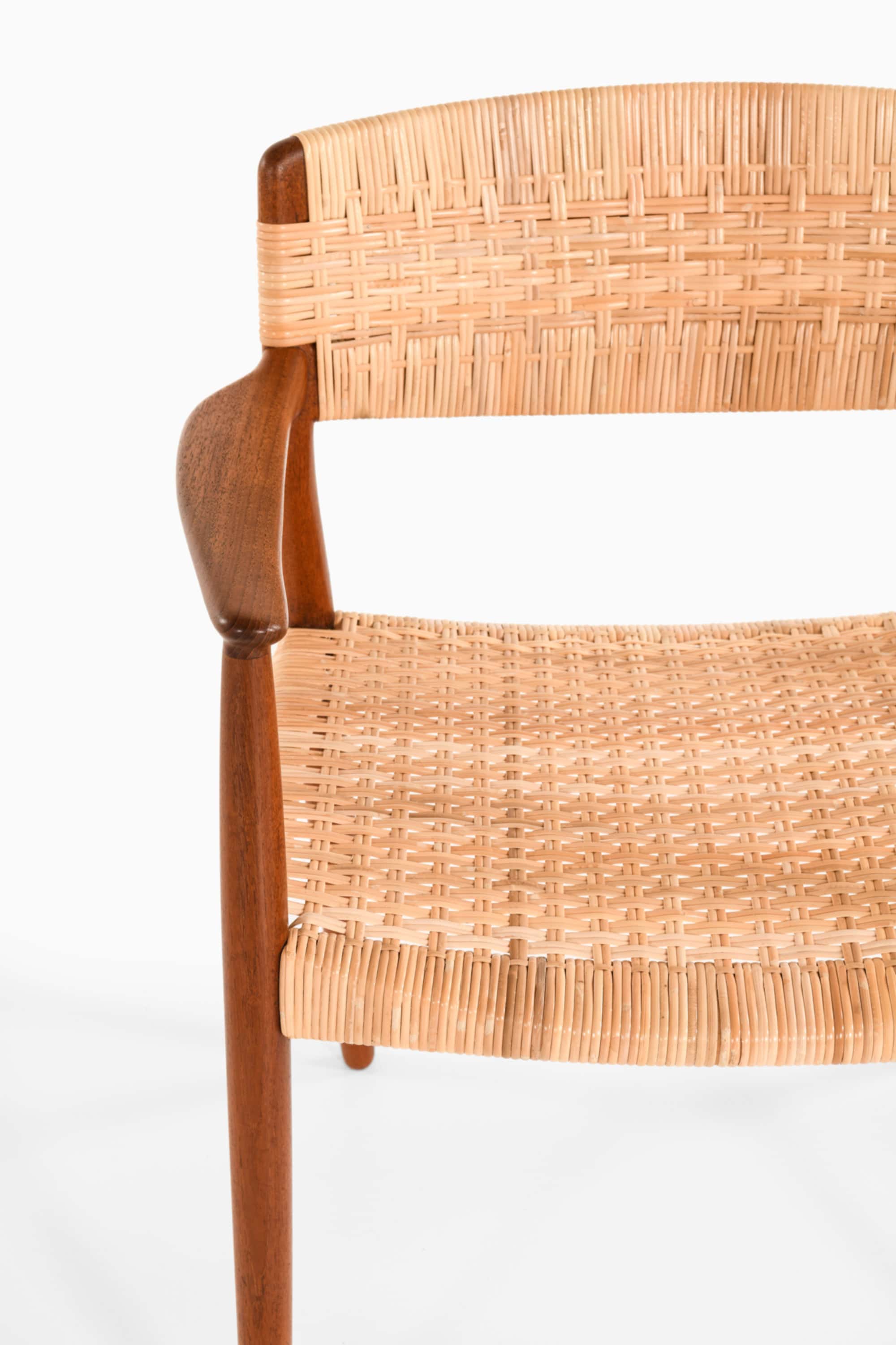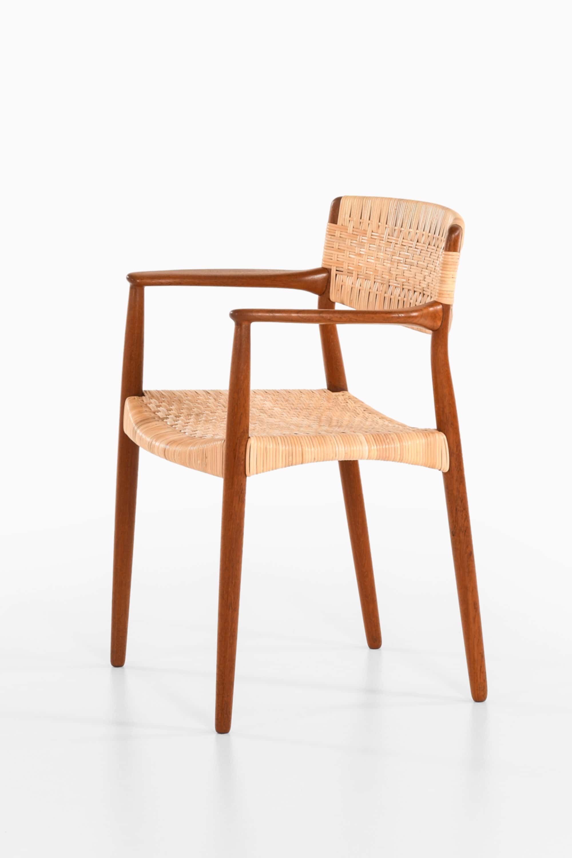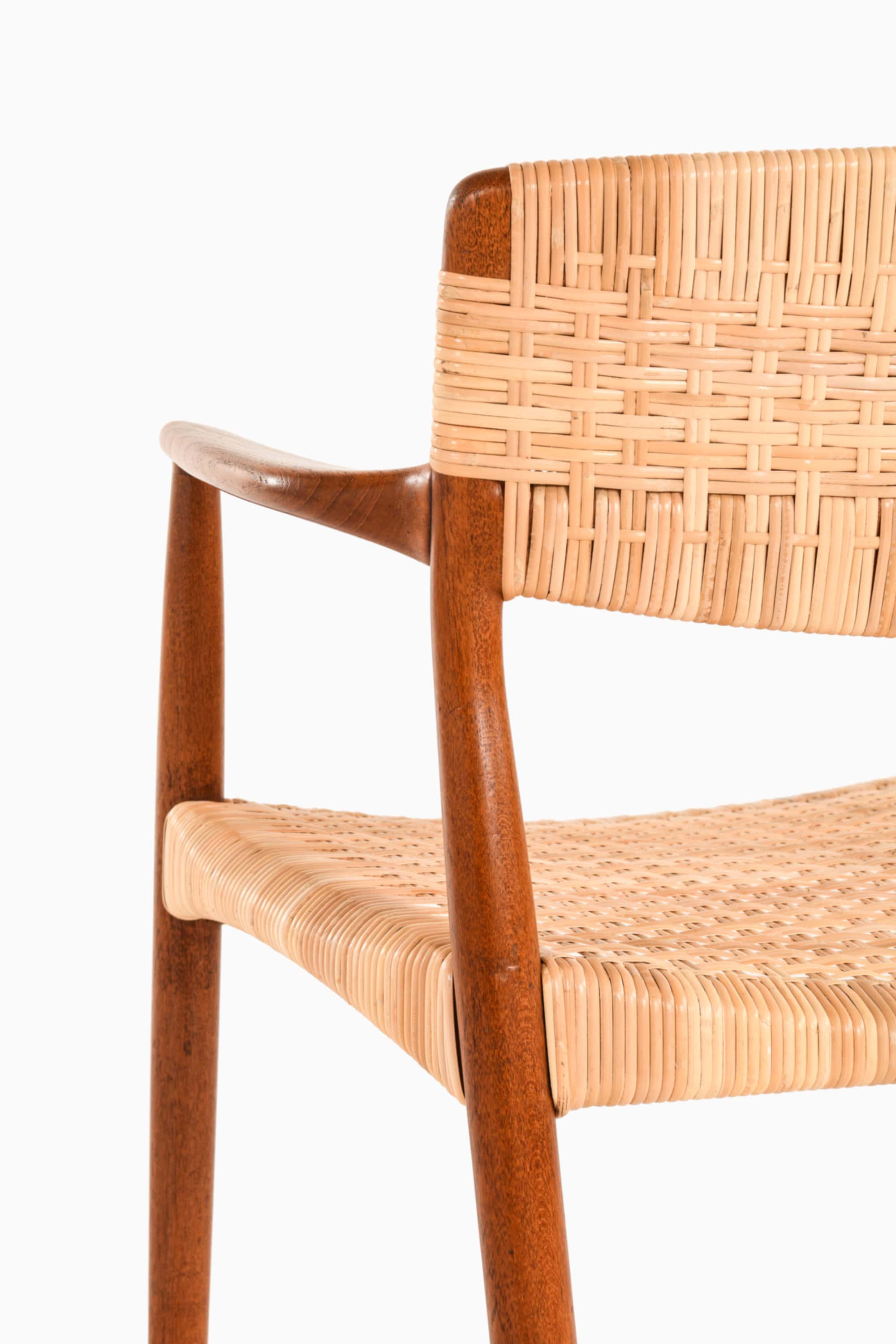 This example remains in excellent condition with small signs of use consistent with age. The cane is intact and recently restored, and the teak frame retains its warm, original finish with only minimal wear. The chair measures 64 cm in width (25.2 inches), 51 cm in depth (20 inches), and 79 cm in height (31.1 inches). The seat height is 43 cm (16.9 inches) and the arm height is 67.5 cm (26.6 inches).
