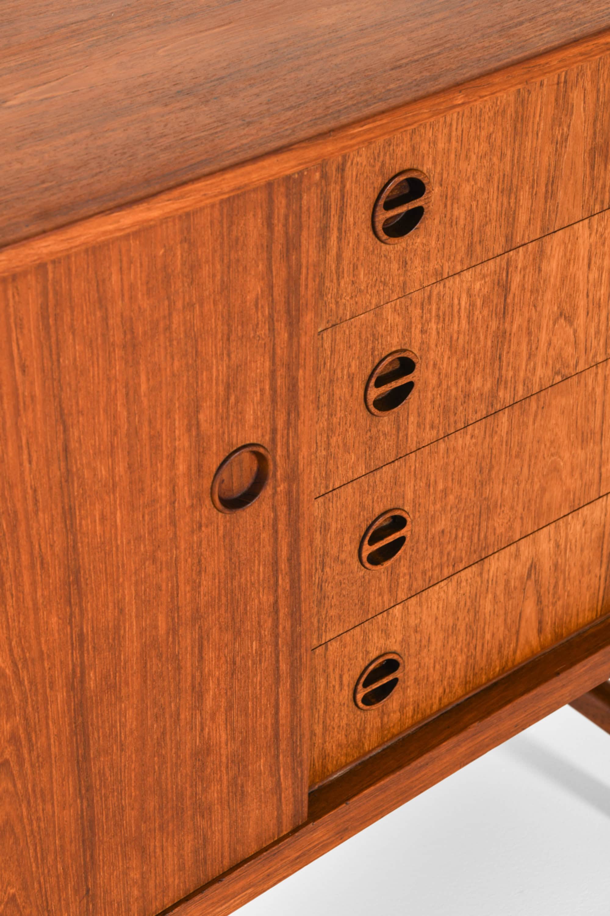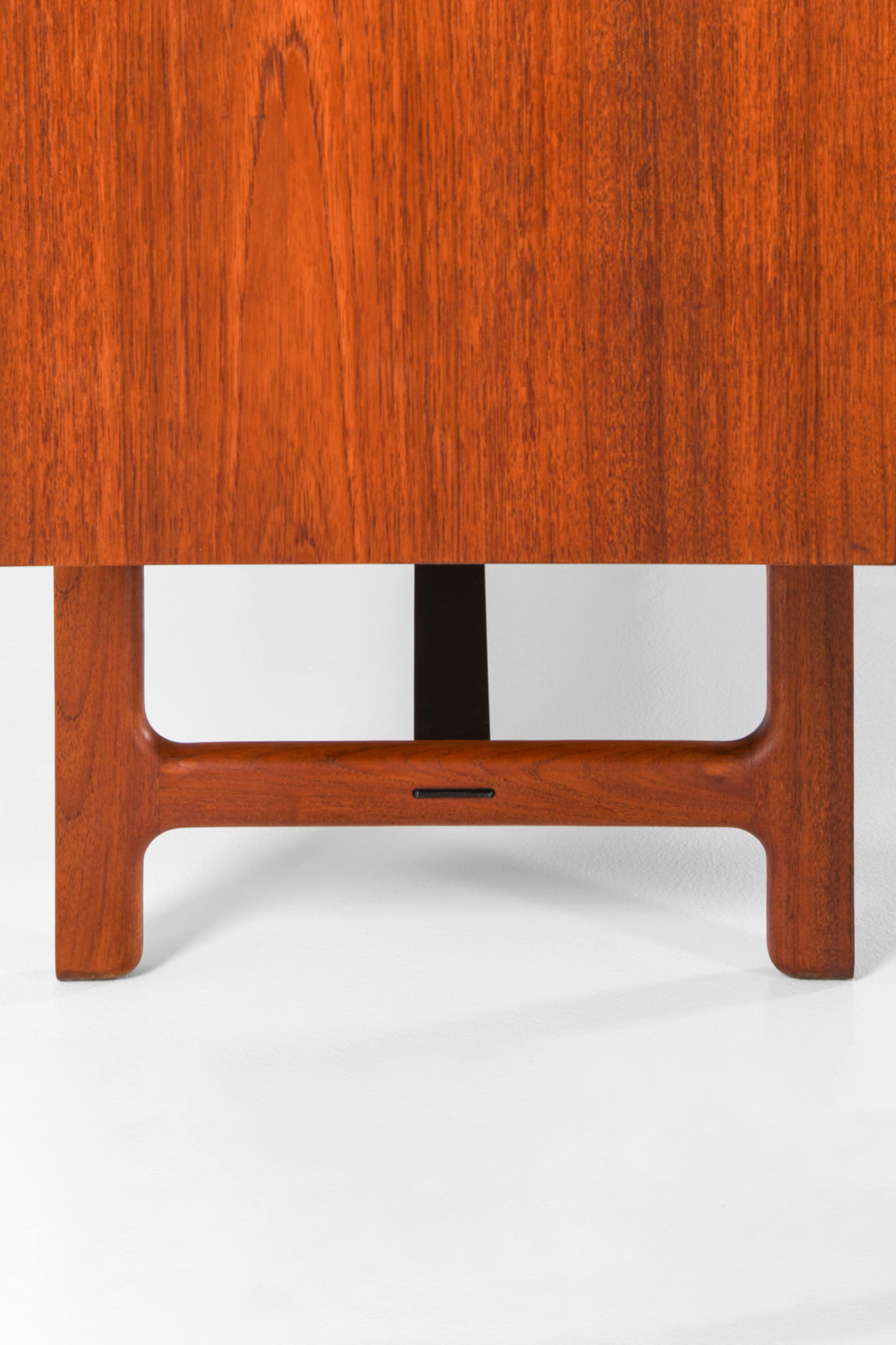 This piece remains in good vintage condition with a uniform surface and rich patina consistent with age and use. The teak retains its natural sheen and warmth, and all components function smoothly, including the sliding doors and drawers. It stands as an exemplary example of Danish mid-century cabinetmaking, harmonizing utility with architectural grace.