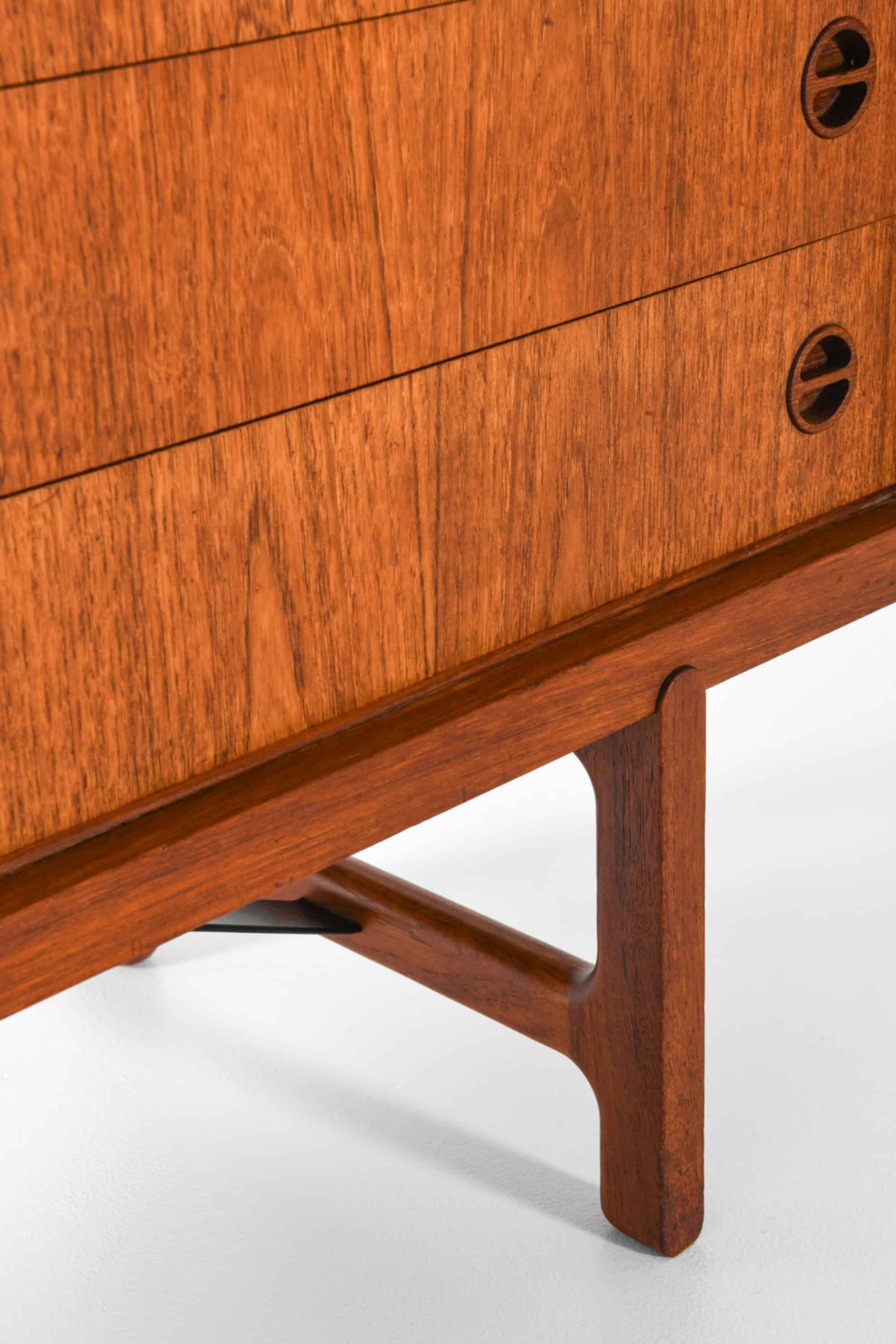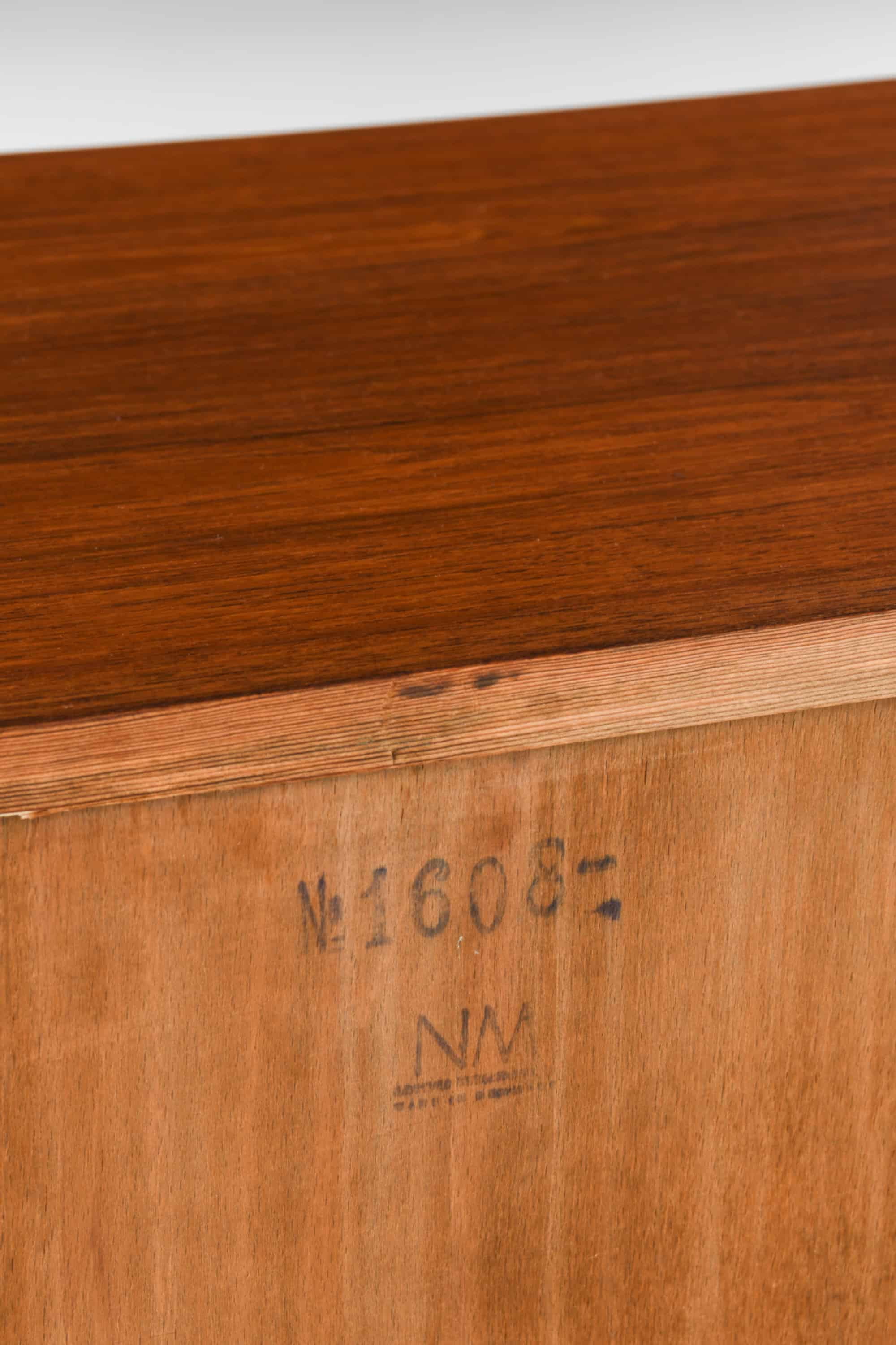 This rare sideboard, model 1608, was designed by Aksel Bender Madsen and Ejner Larsen and produced by Næstved Møbelfabrik in Denmark during the 1960s. It is crafted in teak with subtle steel reinforcement, representing the refined Danish approach to furniture design that emphasized clarity of form, honest material use, and enduring functionality.