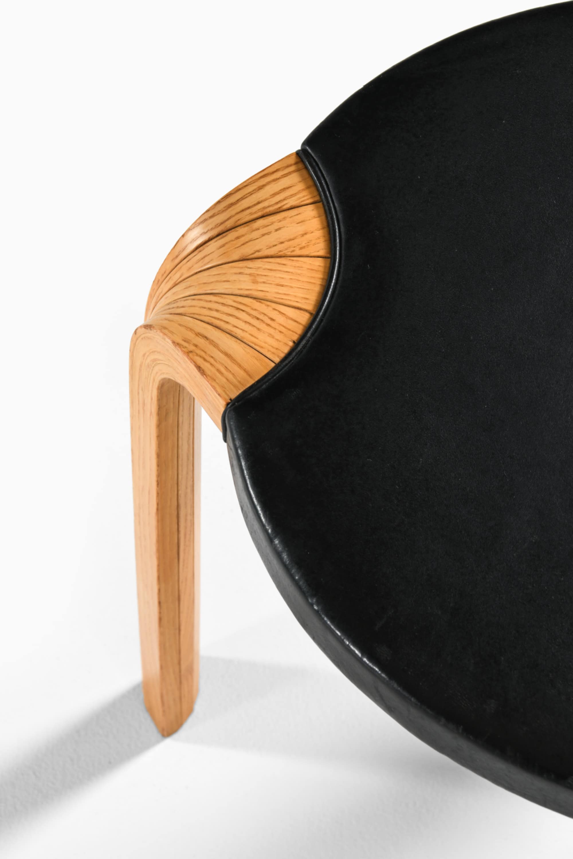 The seat is covered in original black leather, which shows wear and patina consistent with age, contributing to its authentic vintage quality. The round seat is visually softened by the leather’s natural surface, contrasting with the clean, architectural lines of the wooden base. The three legs are made of massive birch, bent to form Aalto’s characteristic curved profile. At their upper joints, the legs expand into fan-shaped sections where they meet the seat, creating both structural reinforcement and a striking visual rhythm.
