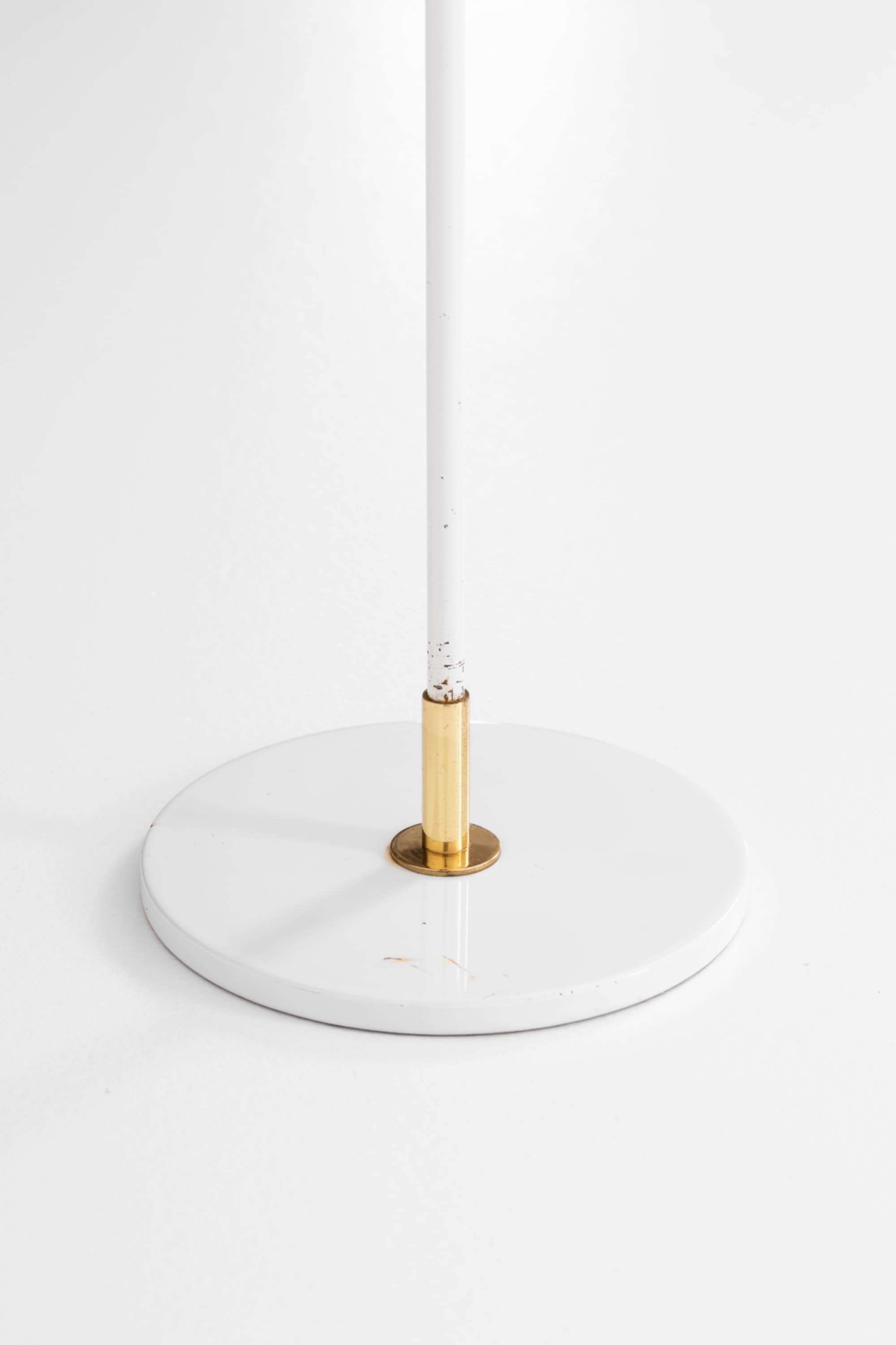 The construction is executed in white lacquered metal, forming a slender central stem from which eight arms extend in a symmetrical, radial configuration. The white finish gives the piece a lighter and more architectural presence, emphasizing its linear geometry while softening the overall visual weight. The composition remains precise and rhythmic, with each arm carefully angled to create both balance and spatial openness.