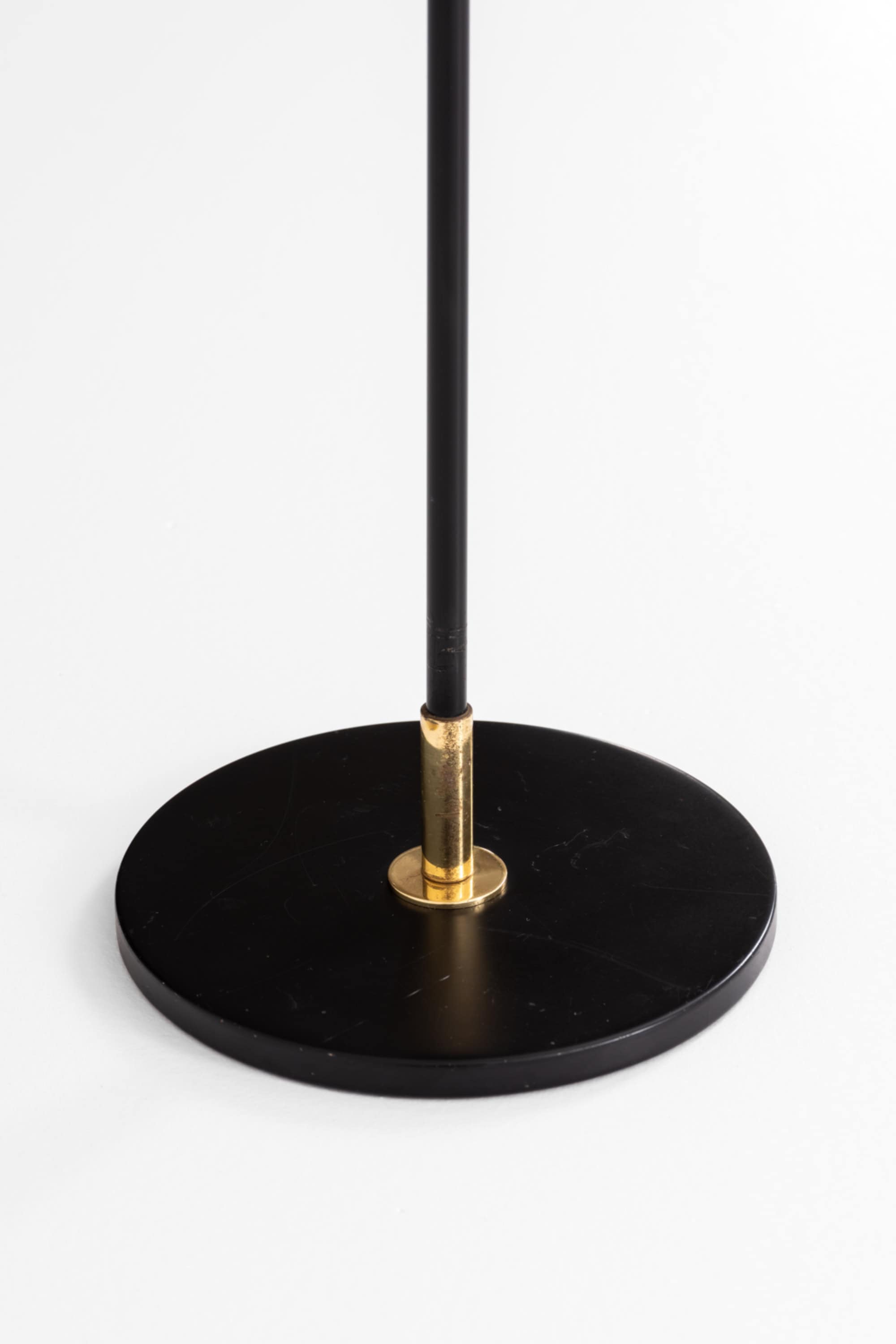 The structure is executed in black lacquered metal, forming a central vertical stem from which eight arms extend in a symmetrical, radial arrangement. Each arm is precisely angled, creating a dynamic yet orderly geometry that gives the piece a strong visual presence while maintaining a sense of lightness. The black finish contrasts with the warm brass elements, emphasizing the graphic quality of the construction.