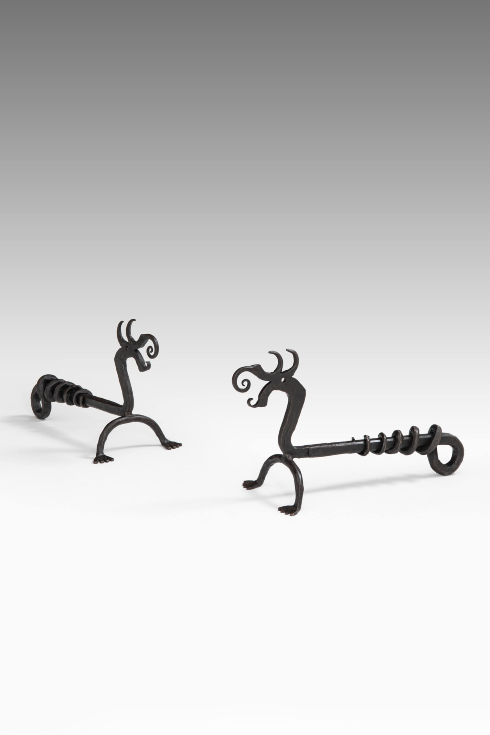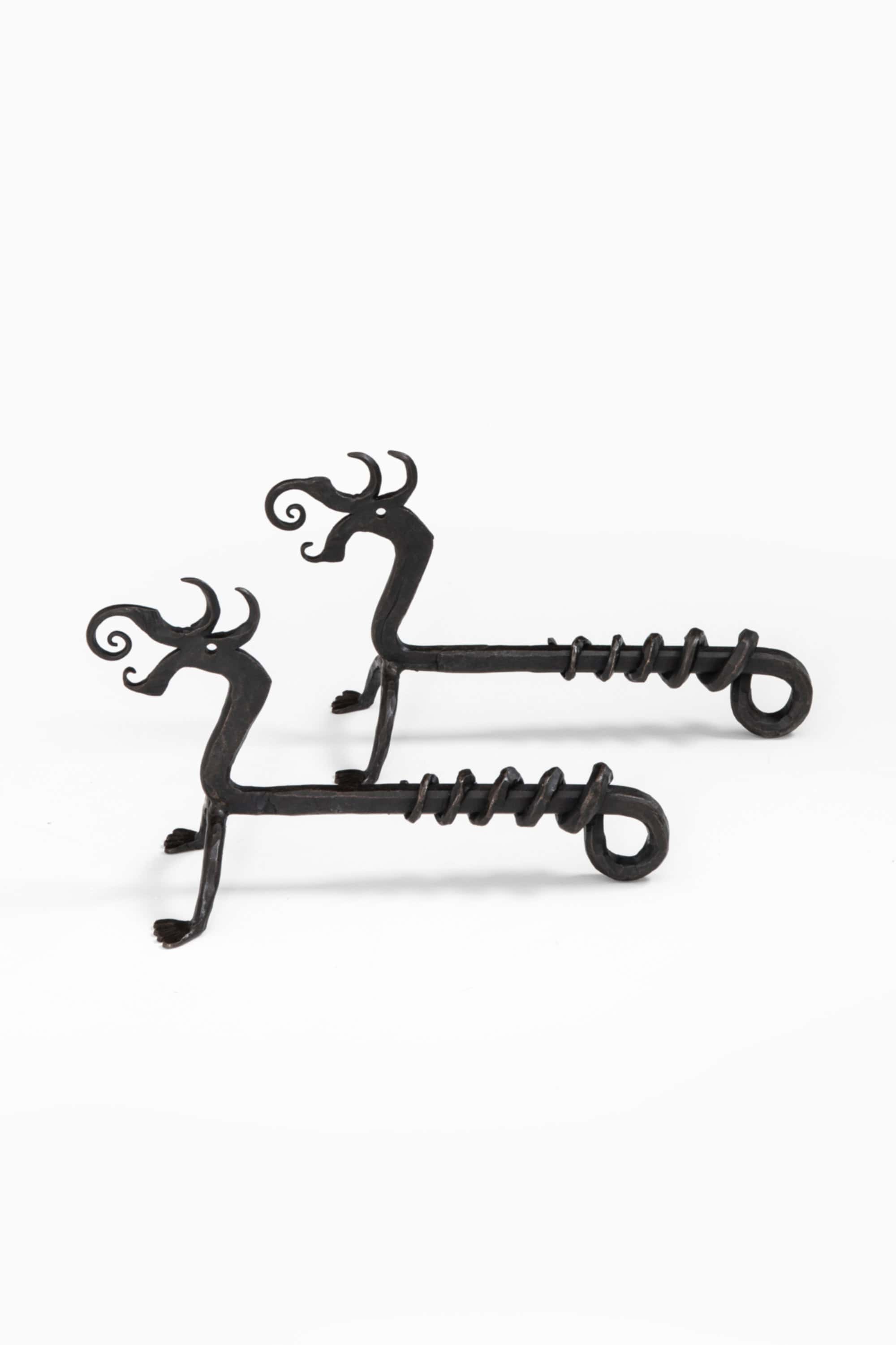 This rare pair of Swedish andirons was produced during the 1960s and executed in wrought iron. Each element is formed as a stylized dragon, combining a sculptural animal motif with a clearly functional construction intended for use in an open fireplace. The pieces are finished in a dark, almost black tone, with a matte surface that emphasizes the forged character of the material.