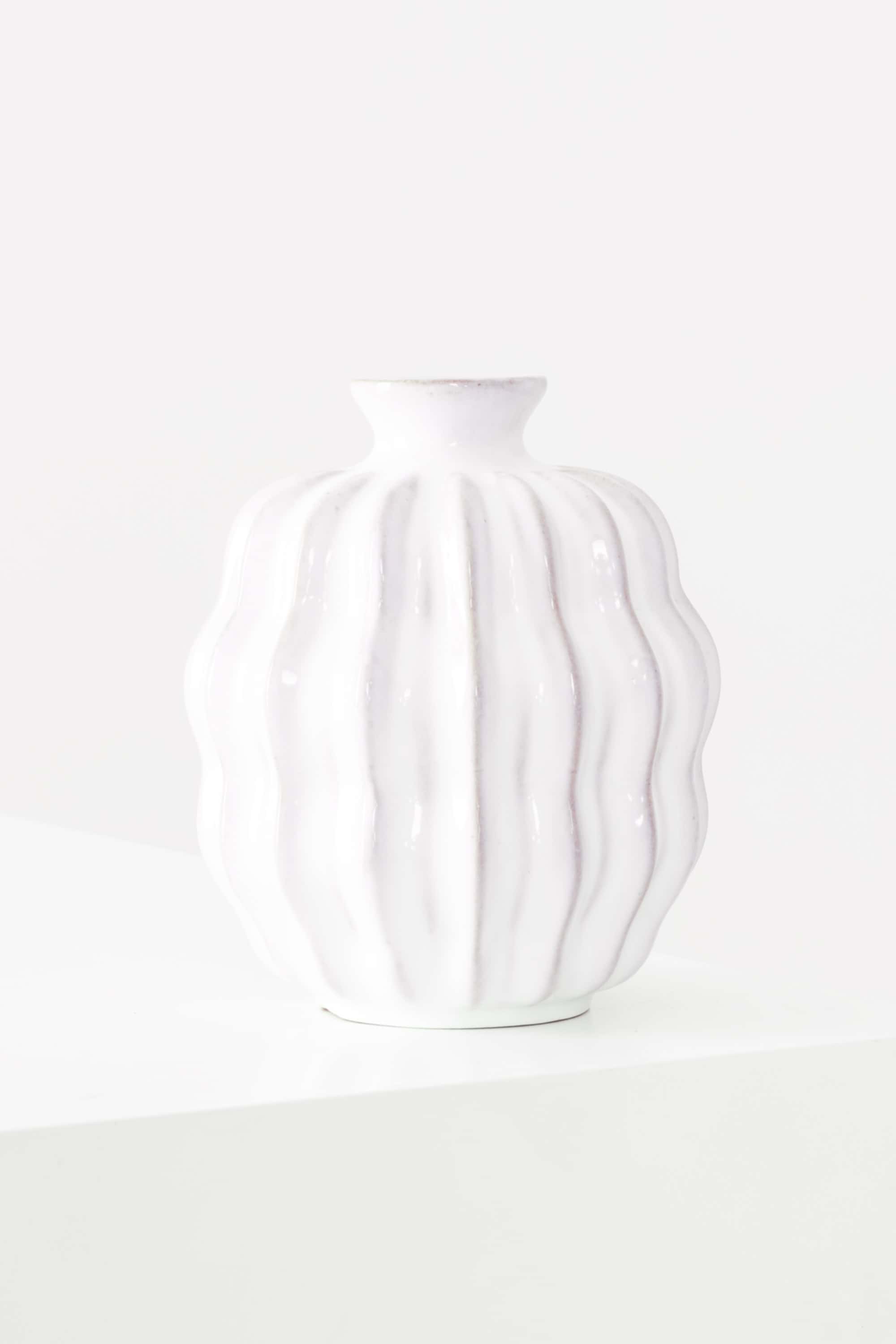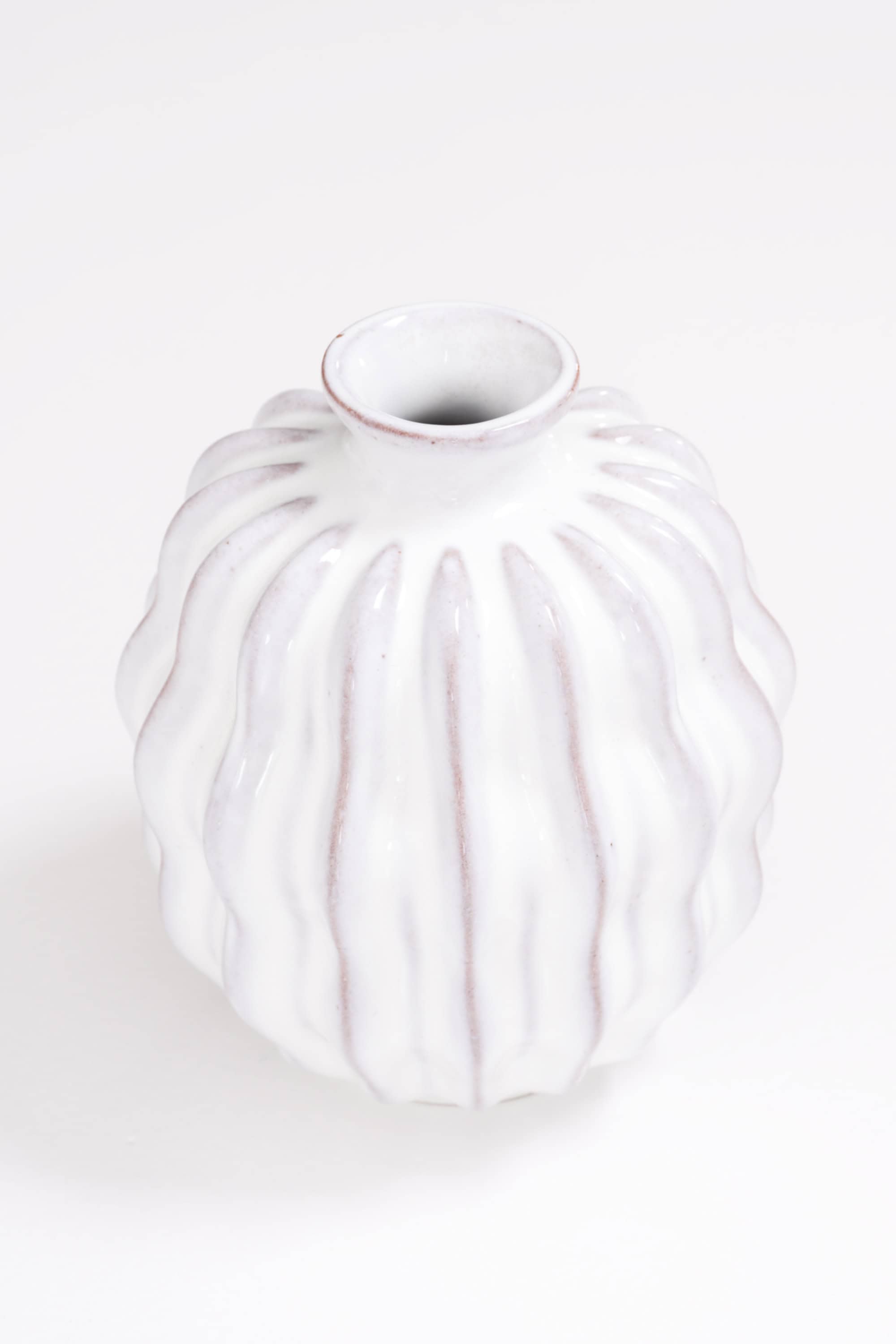 The vase is compact in scale with a softly rounded, almost bulbous body that tapers gently towards a short, slightly flared neck. The exterior is defined by evenly spaced vertical fluting, creating a rhythmic, undulating surface that gives the form both structure and softness. The sculptural quality is emphasized by the way the contours catch light, accentuating the depth of each rib.