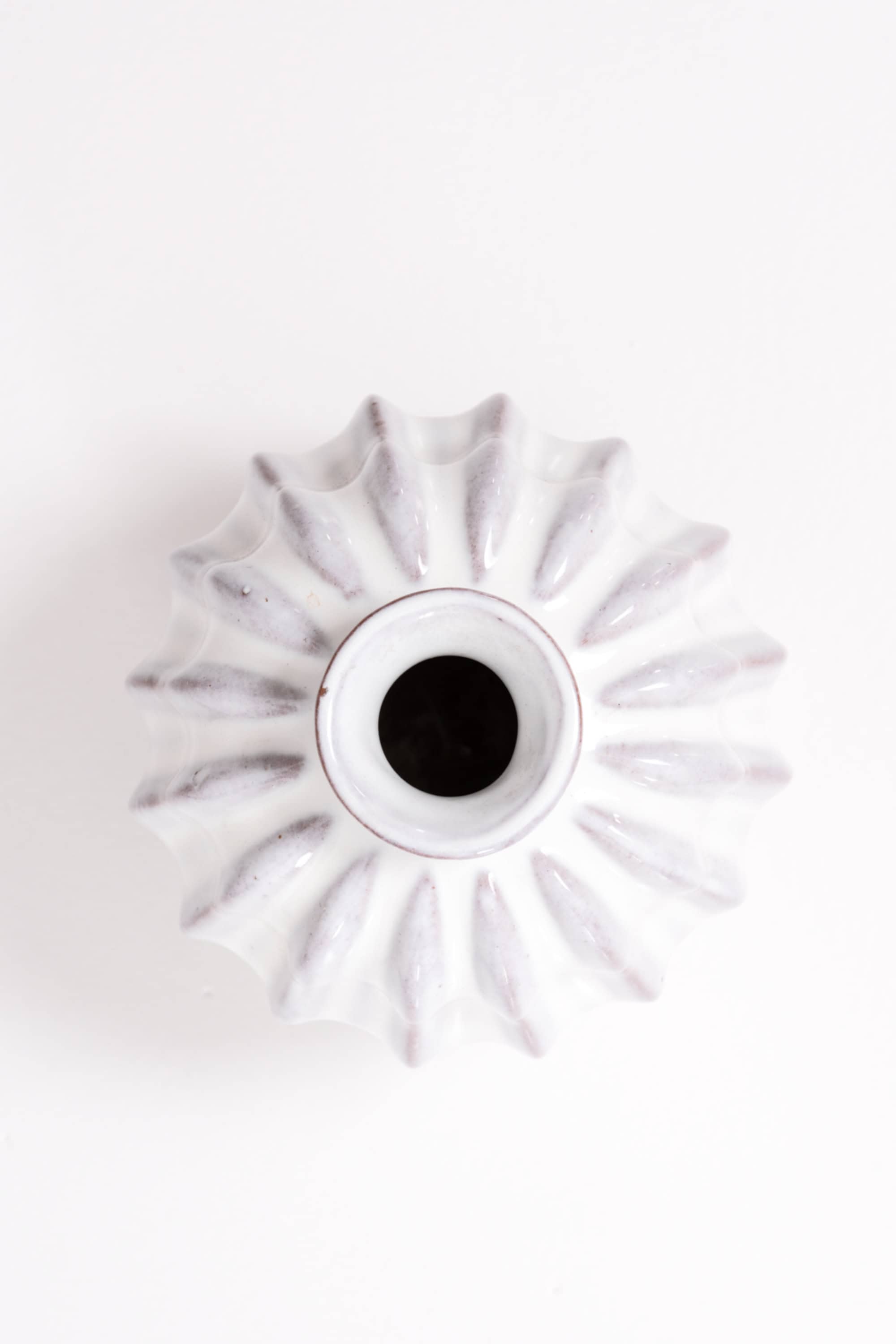 The glaze is a milky white with delicate tonal variations, where faint lilac-grey hues settle into the recessed areas of the fluting. This creates a nuanced contrast between the raised and recessed surfaces, adding depth without interrupting the calm, monochrome appearance. The finish is smooth and slightly lustrous, typical of Upsala Ekeby’s refined glaze work of the period.