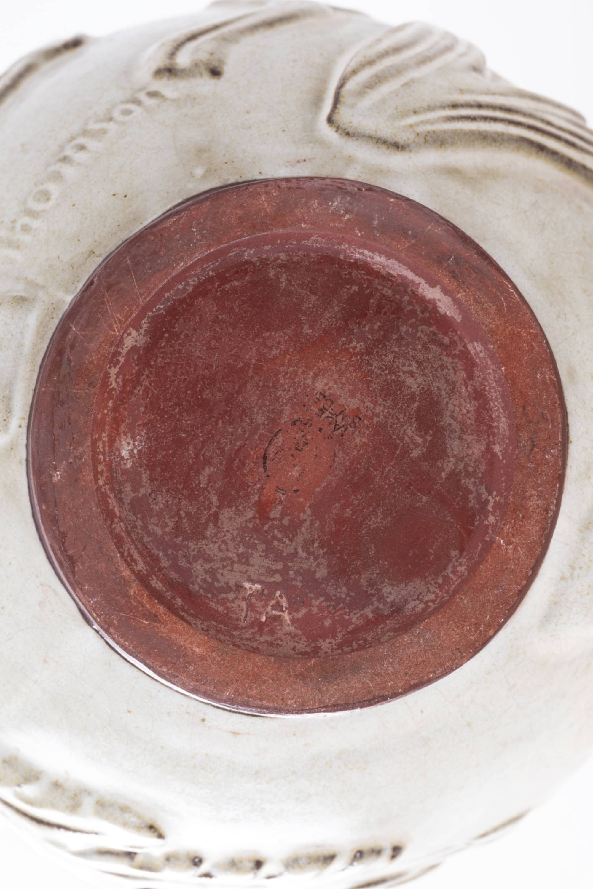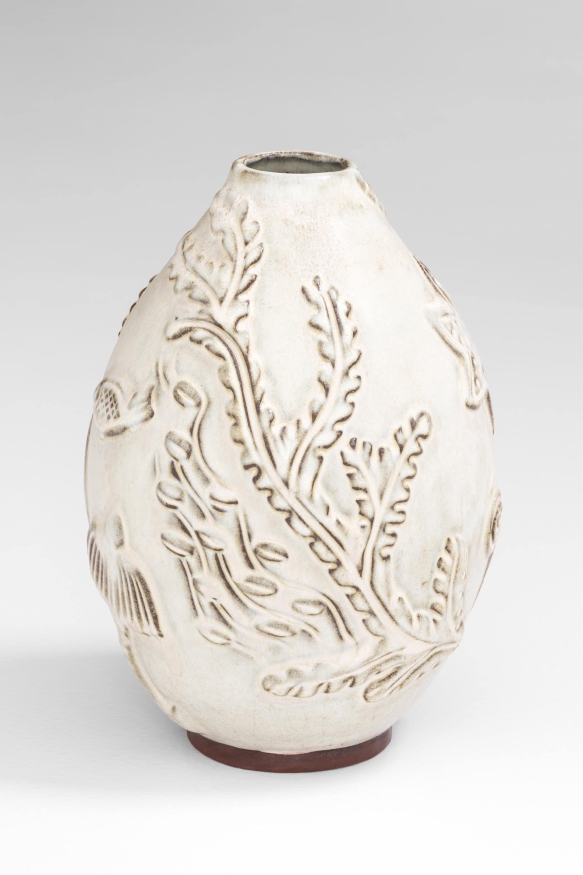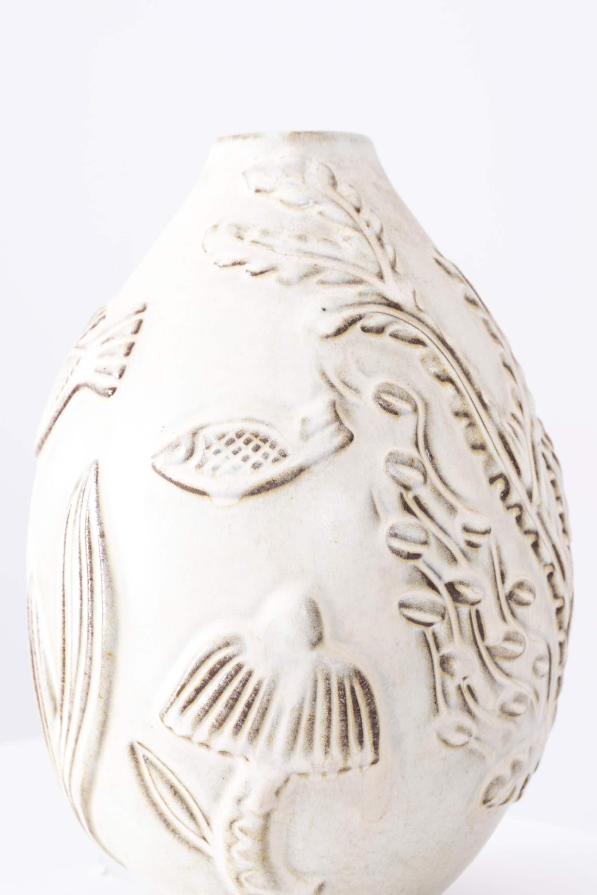 The glaze is a warm, creamy off-white with subtle tonal variation, pooling slightly darker in the recessed details and along the carved lines. This creates a soft contrast that highlights the relief work without overpowering the surface. The base is left in a contrasting reddish-brown tone, typical of Upsala Ekeby’s earthenware, and stamped with model markings.