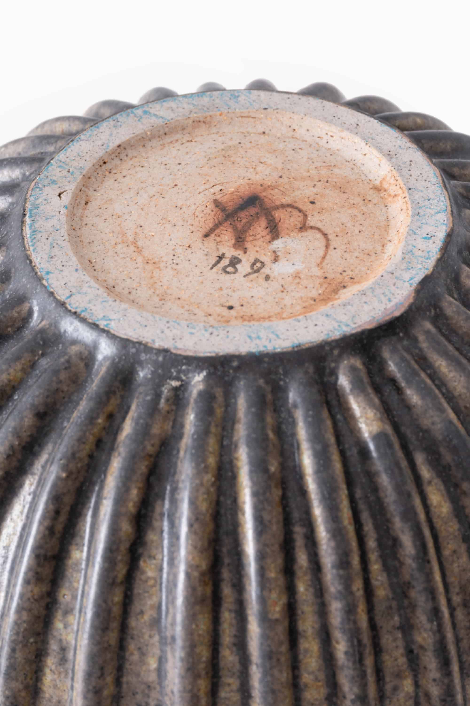 The underside retains the natural stoneware body within the foot ring and is marked with the artist’s monogram along with the model number “189” confirming its origin and authorship.
