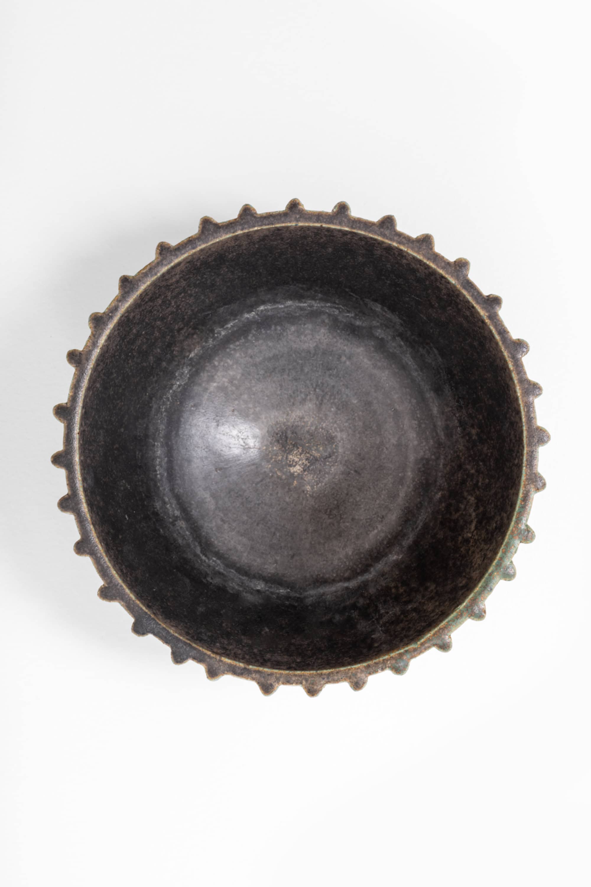 The glaze is a nuanced greyish-brown with variegated tonal shifts, enriched by subtle green undertones that emerge along the edges and high points of the relief. The surface has a slightly mottled, almost metallic character, typical of Bang’s stoneware, where firing conditions produce depth and variation. The interior is finished in a darker, more uniform tone, creating a quiet contrast to the textured exterior.