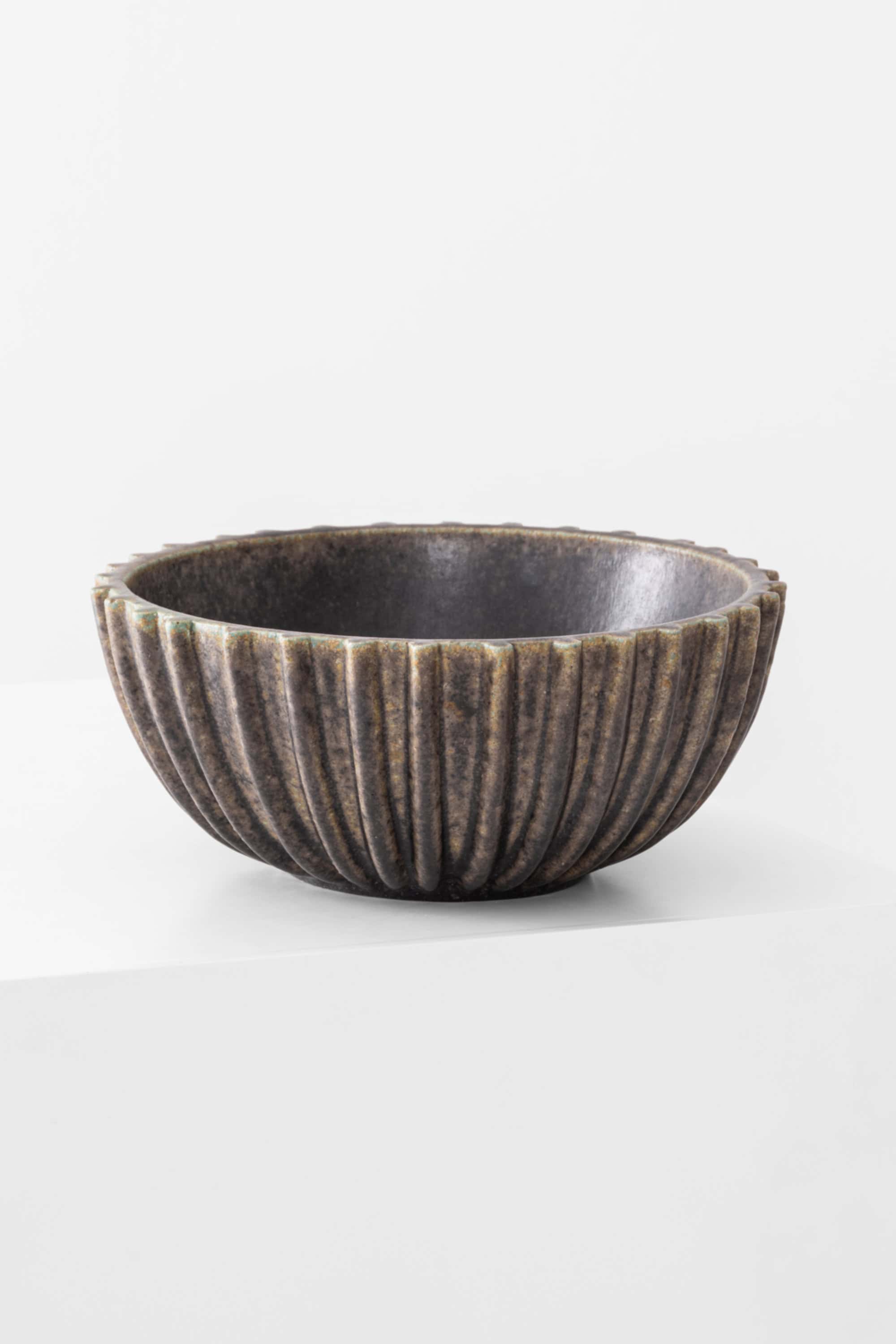 The bowl is circular in form with a wide, open mouth and gently rising sides, resting on a subtly defined foot. The exterior is articulated with a rhythmic series of vertical flutes, creating a structured relief that wraps around the entire body. This repeated pattern gives the piece a tactile quality and a sense of movement, while also emphasizing the symmetry and weight of the form. The rim is finished with a softly crenellated edge, echoing the underlying fluted structure.