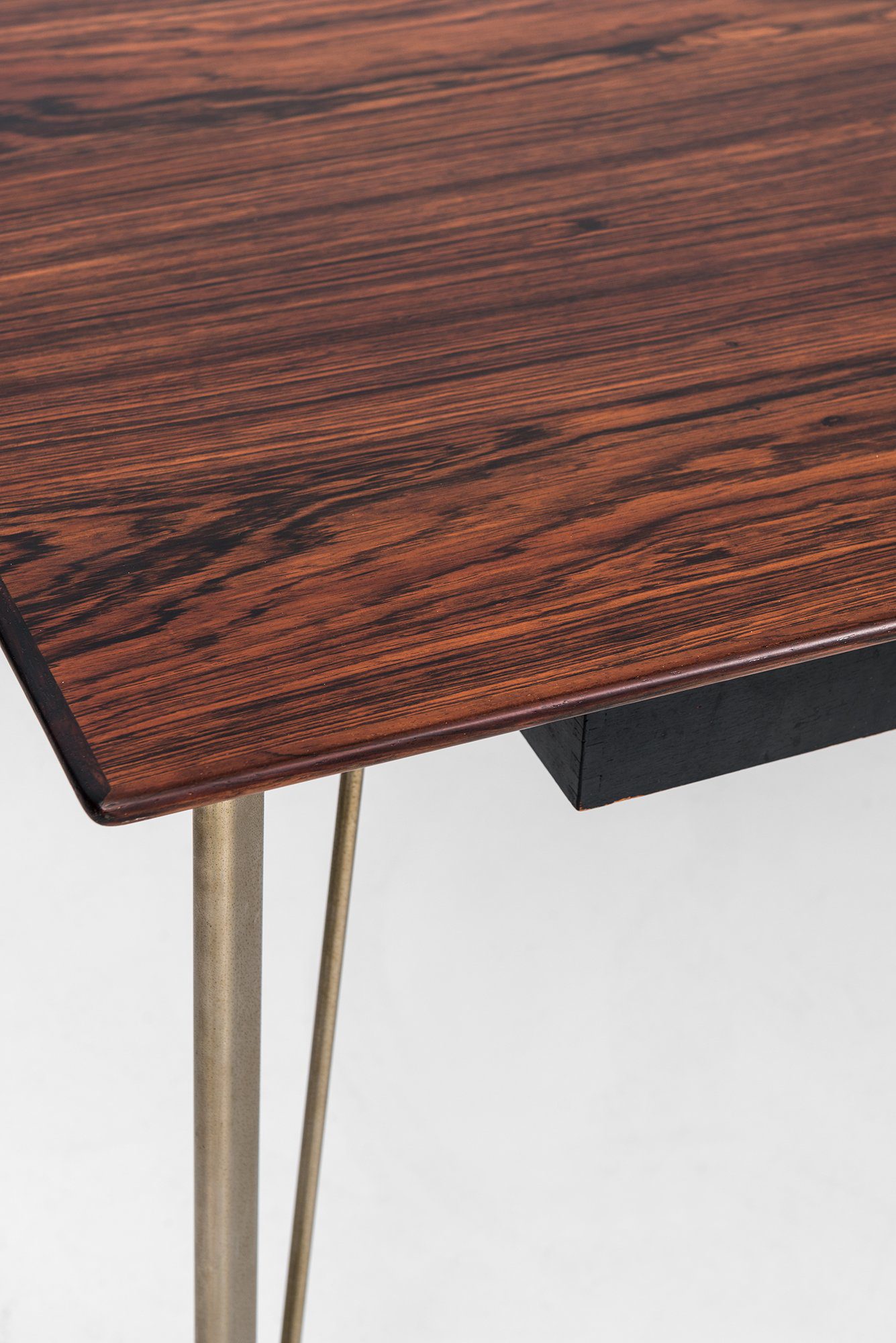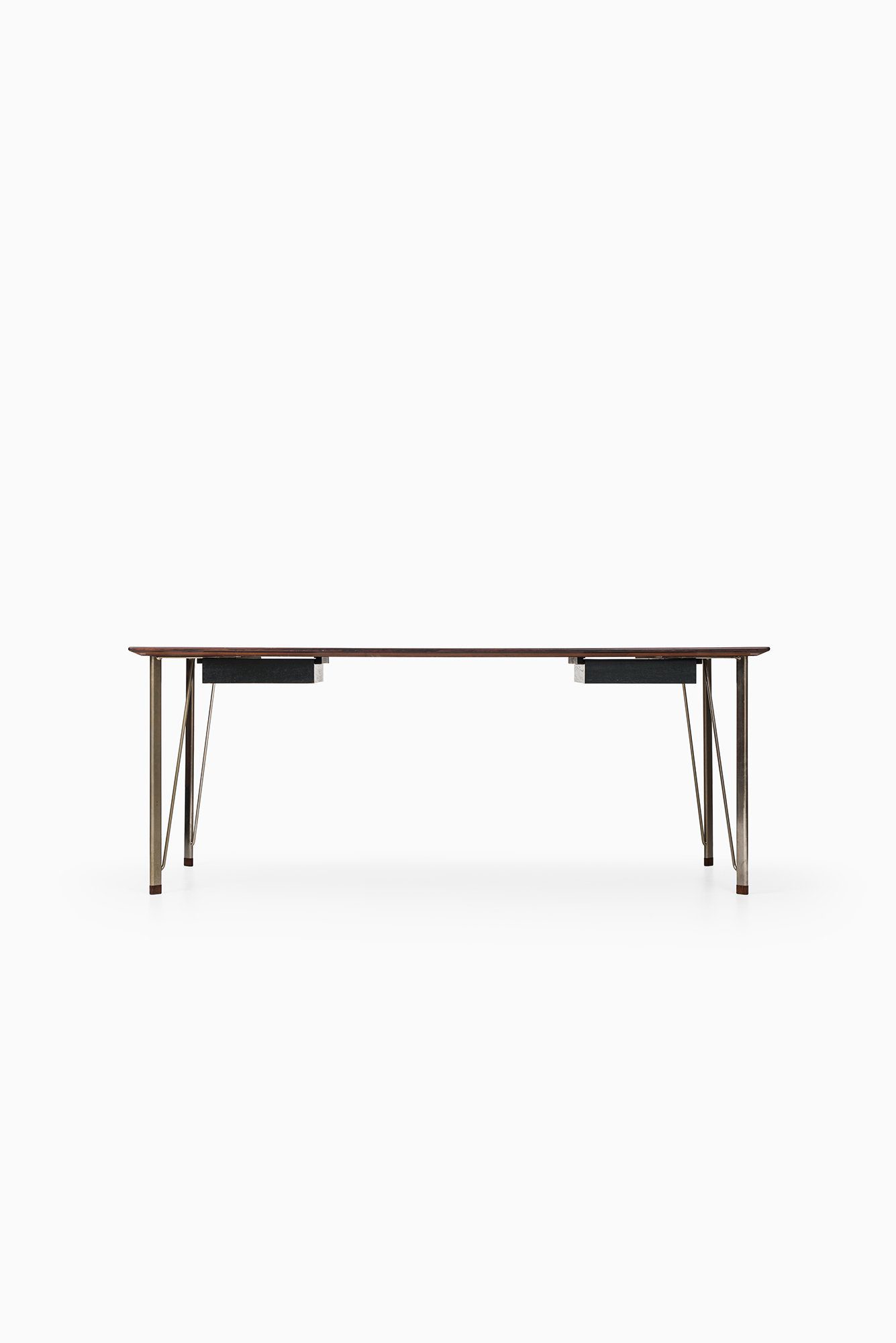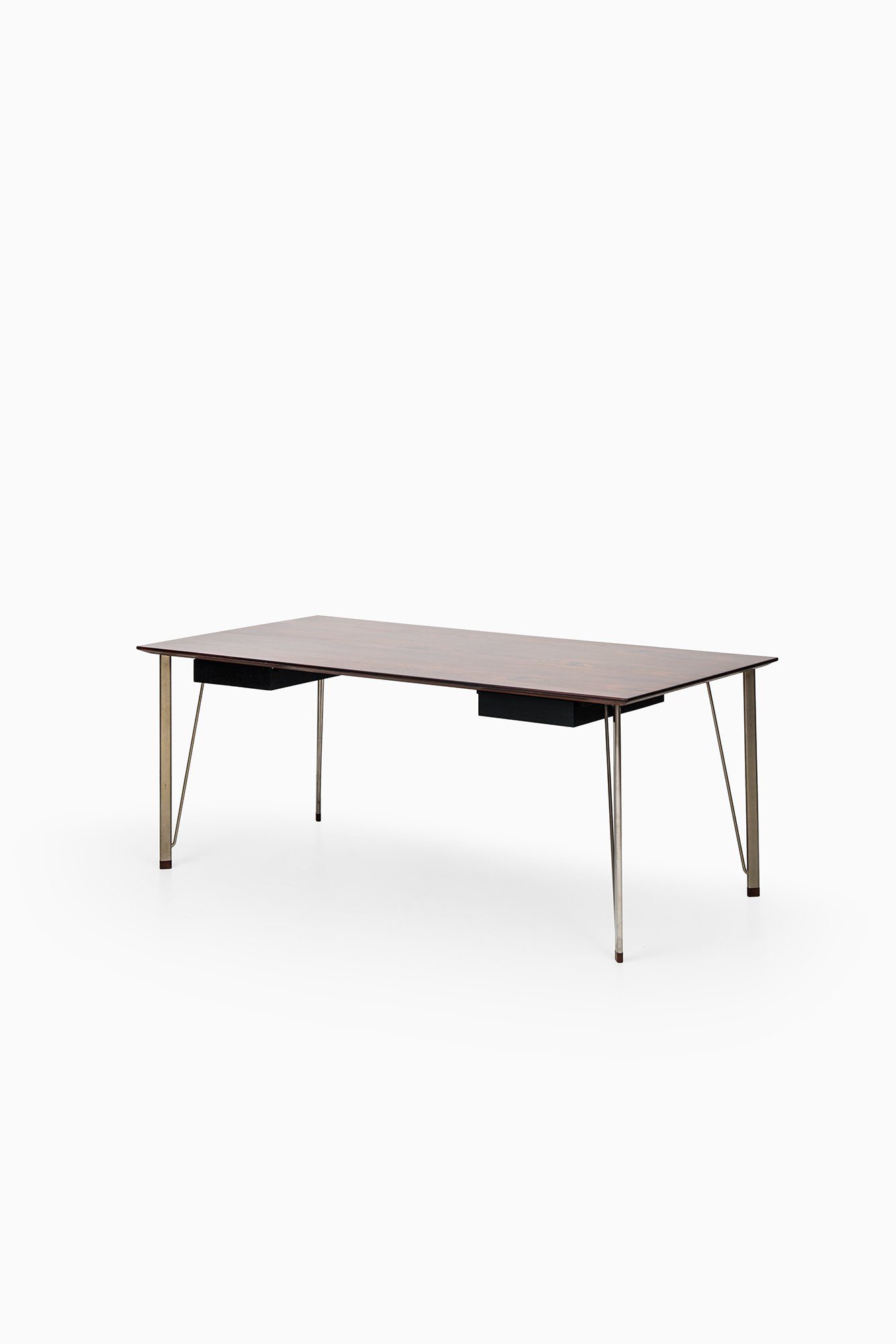 This rare desk was designed by Arne Jacobsen and produced by Fritz Hansen in Denmark in 1955. The piece combines a striking rosewood top with a minimalist steel base, exemplifying Jacobsen’s refined approach to modernist furniture design. The rosewood surface is beautifully grained, with a rich pattern that emphasizes the natural character of the wood, framed by softly rounded edges that give the top a subtle elegance.