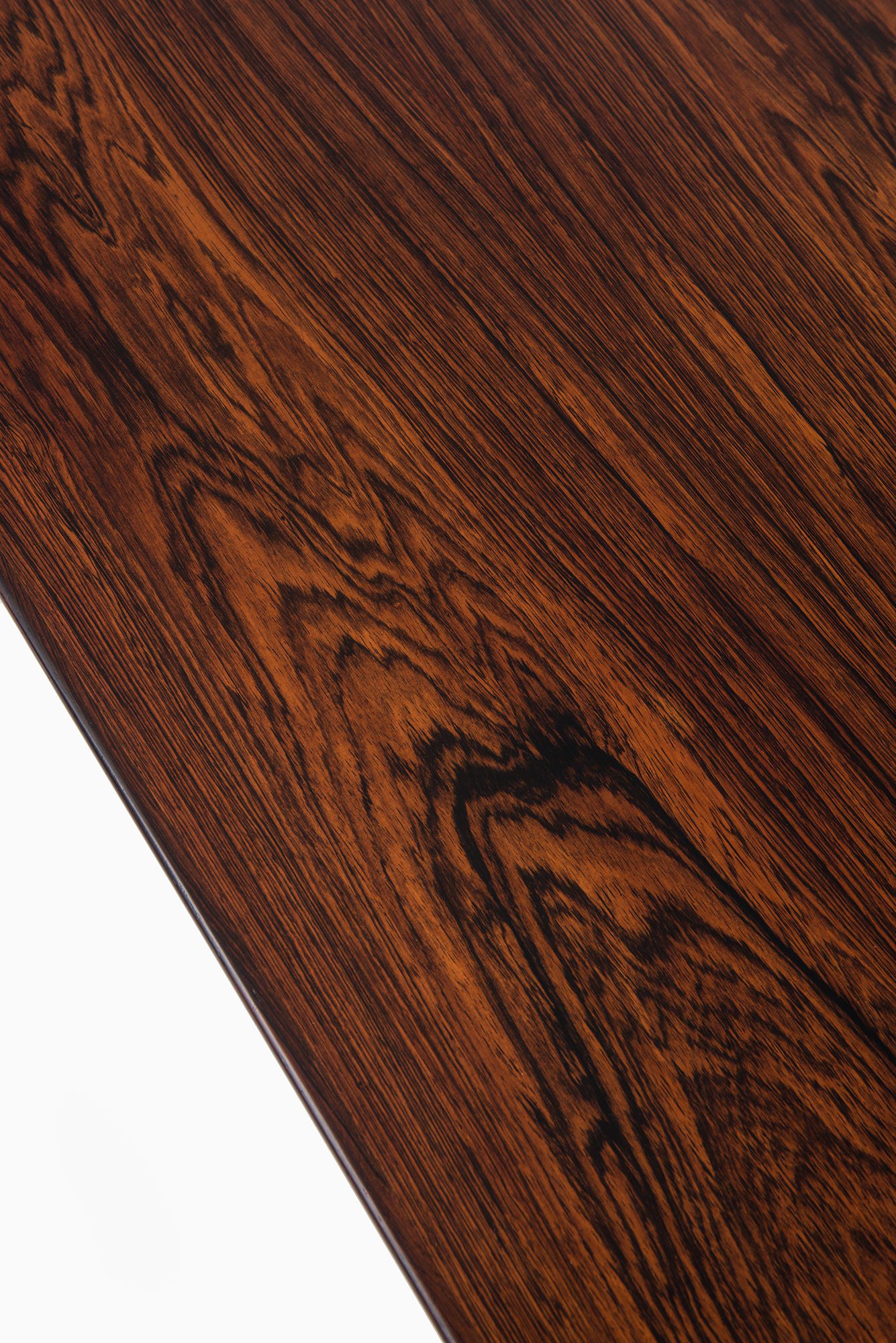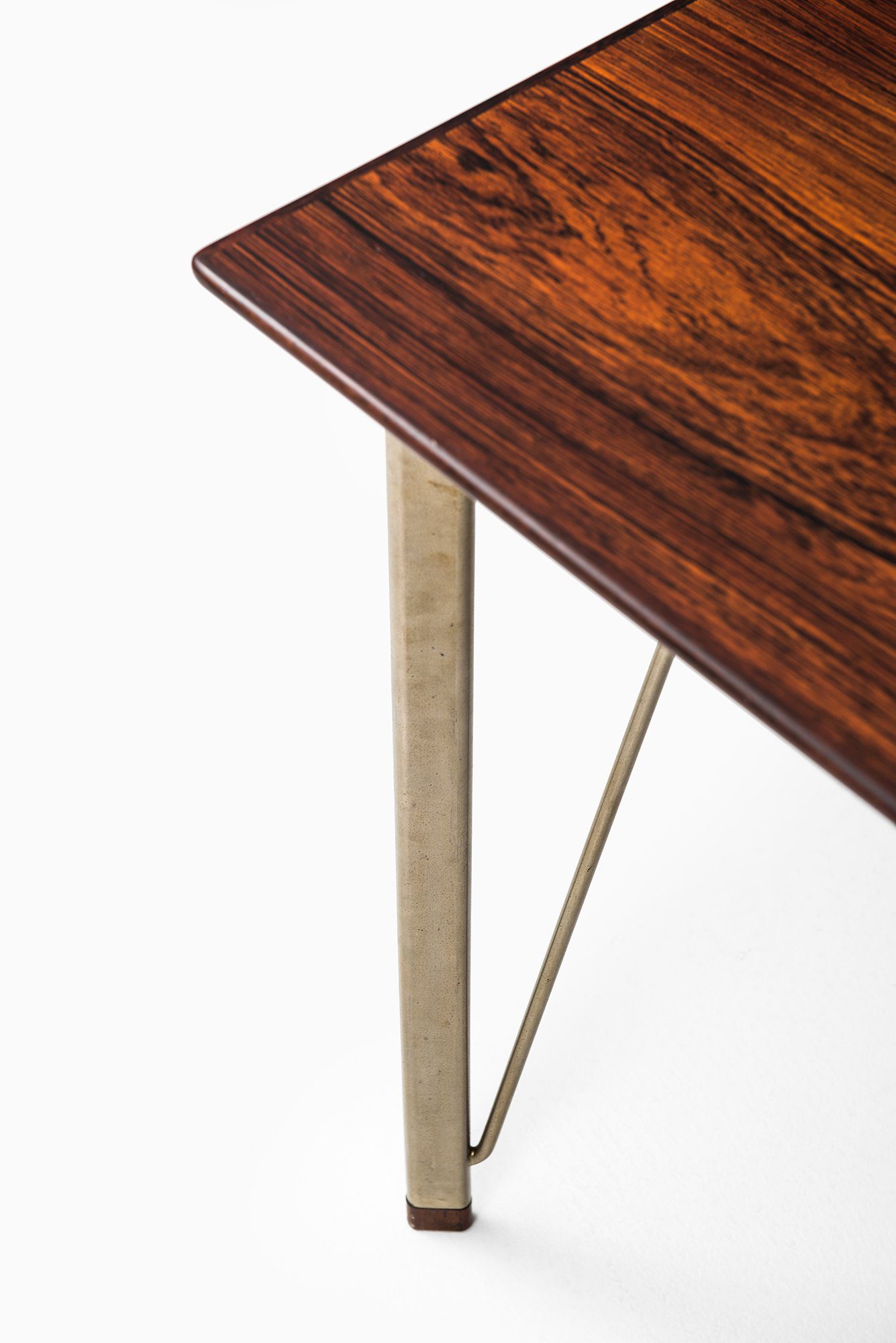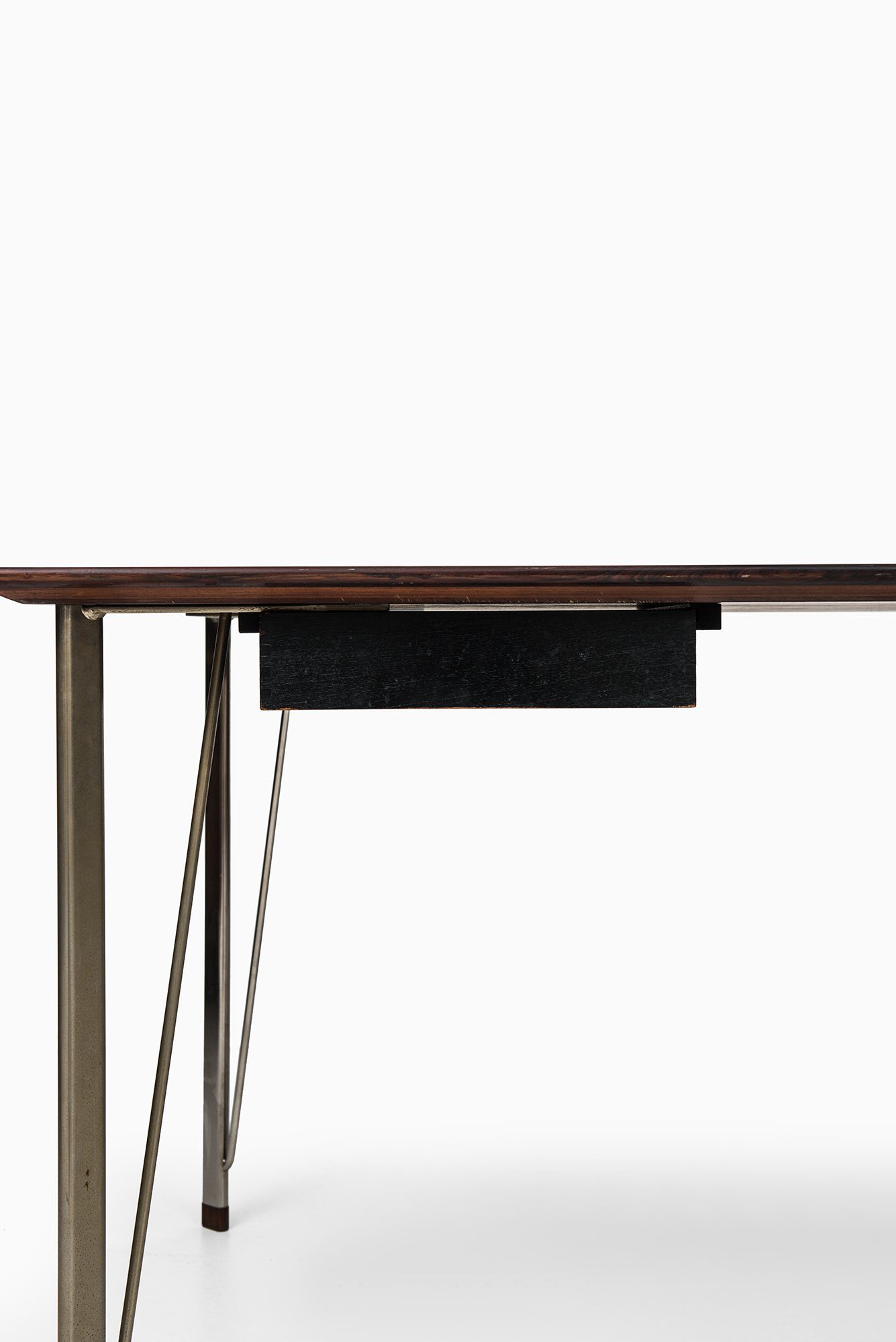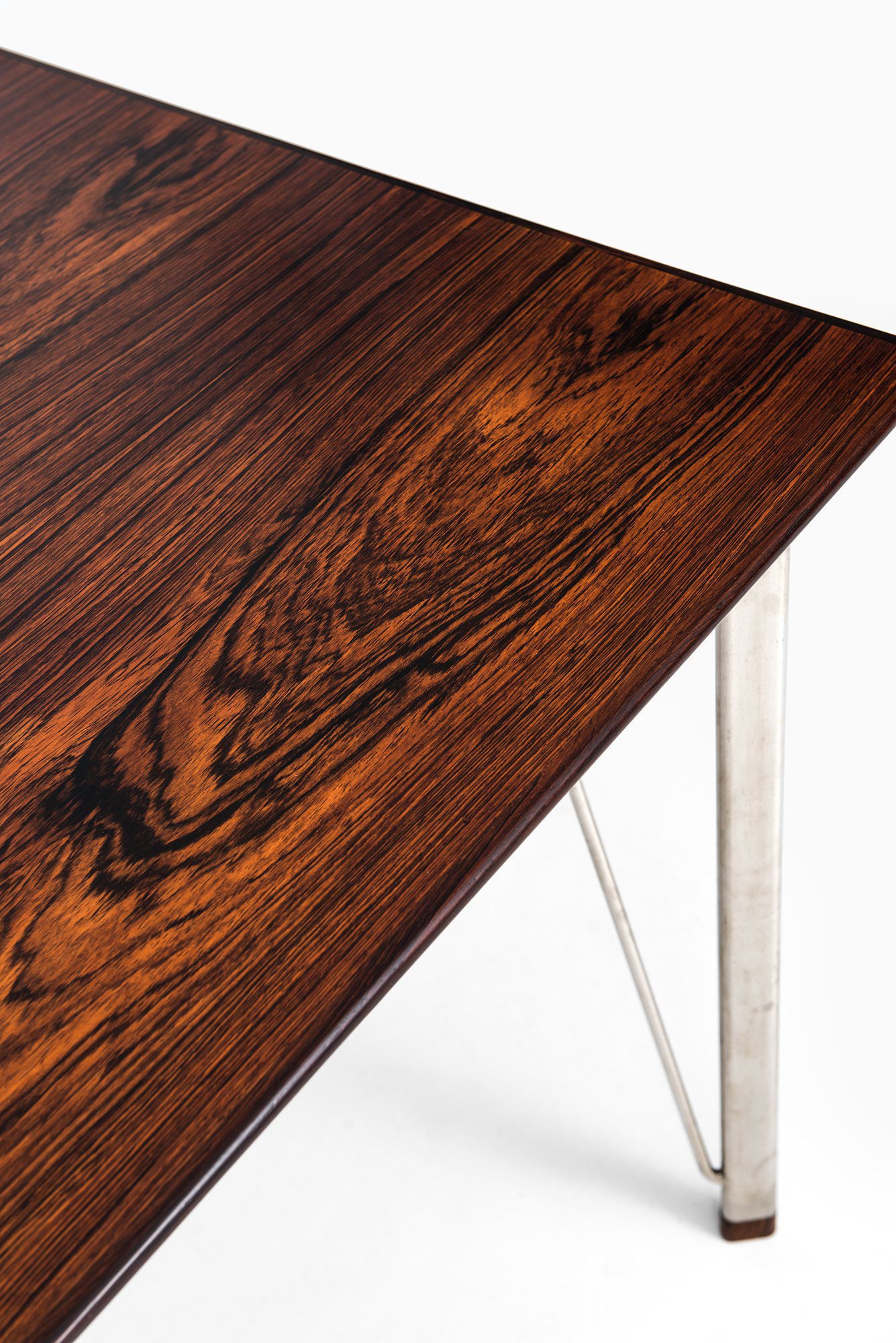 This rare desk was designed by Arne Jacobsen and produced by Fritz Hansen in Denmark in 1955. The piece combines a striking rosewood top with a minimalist steel base, exemplifying Jacobsen’s refined approach to modernist furniture design. The rosewood surface is beautifully grained, with a rich pattern that emphasizes the natural character of the wood, framed by softly rounded edges that give the top a subtle elegance.