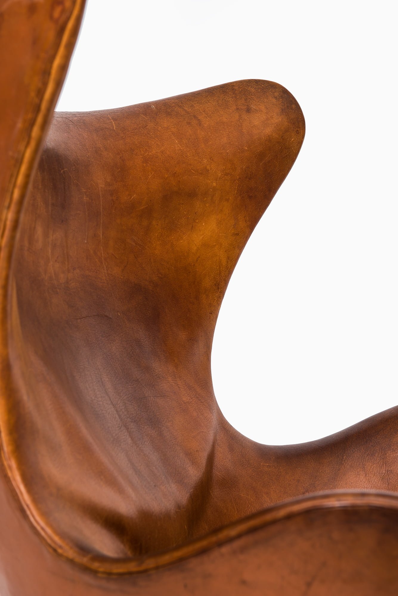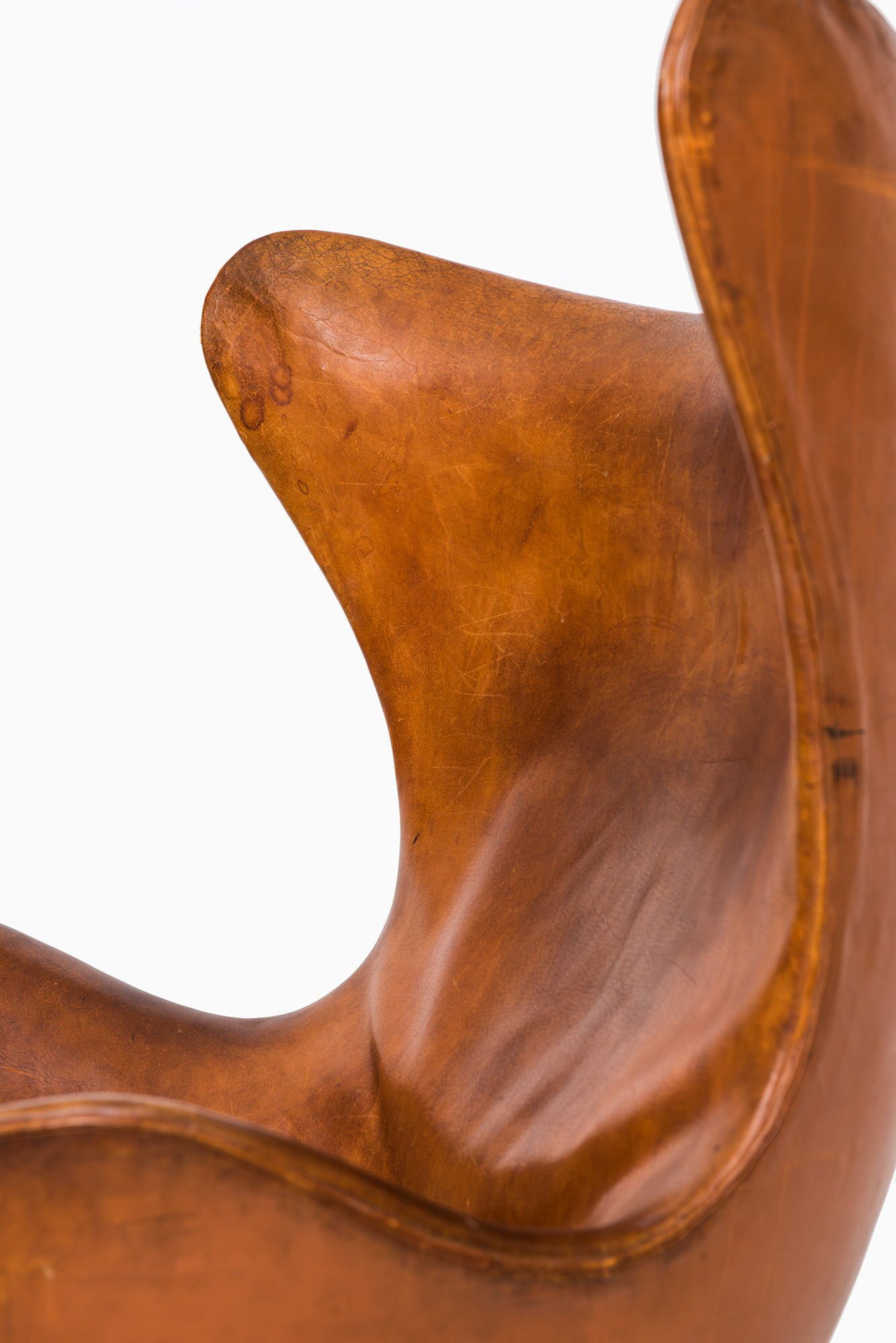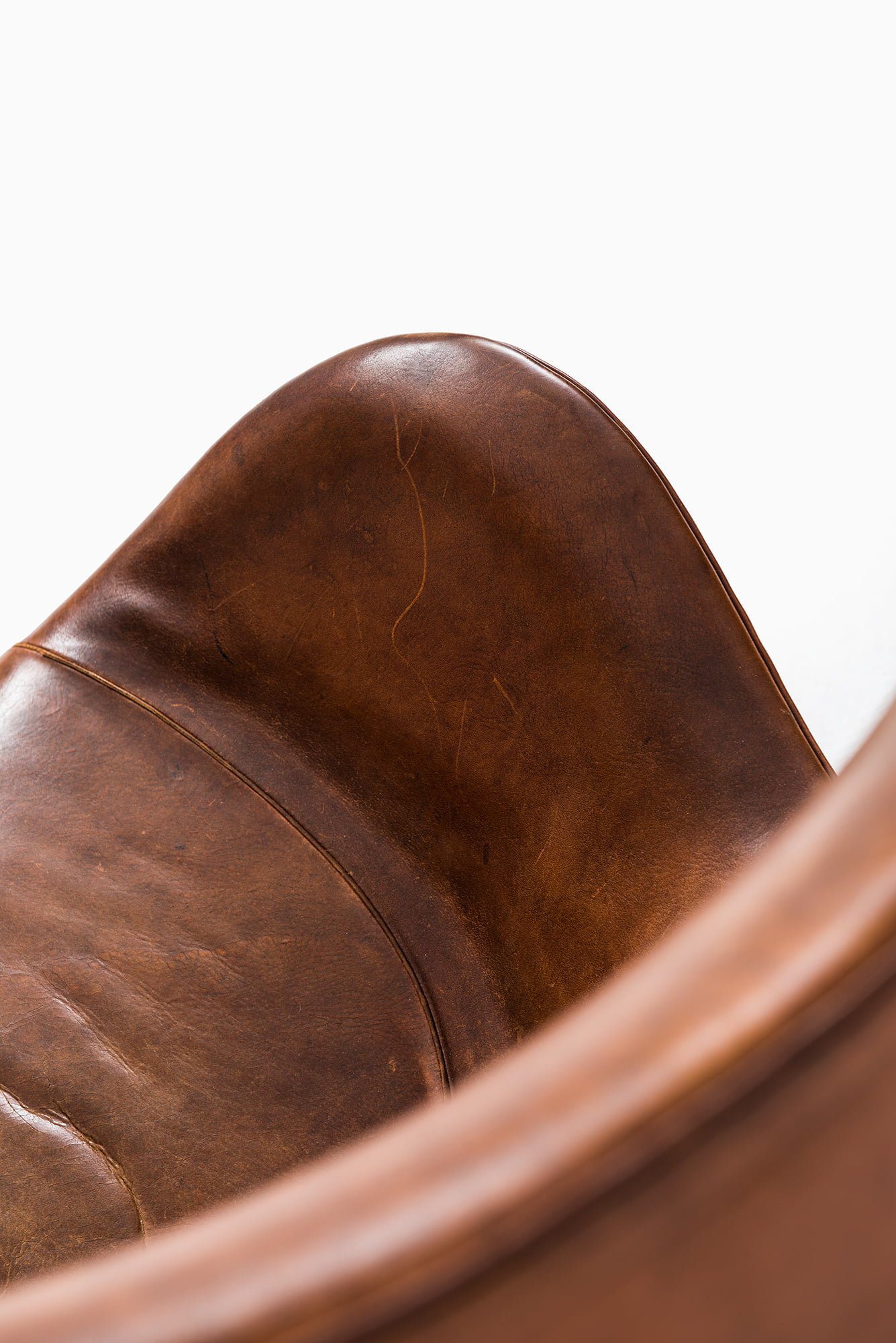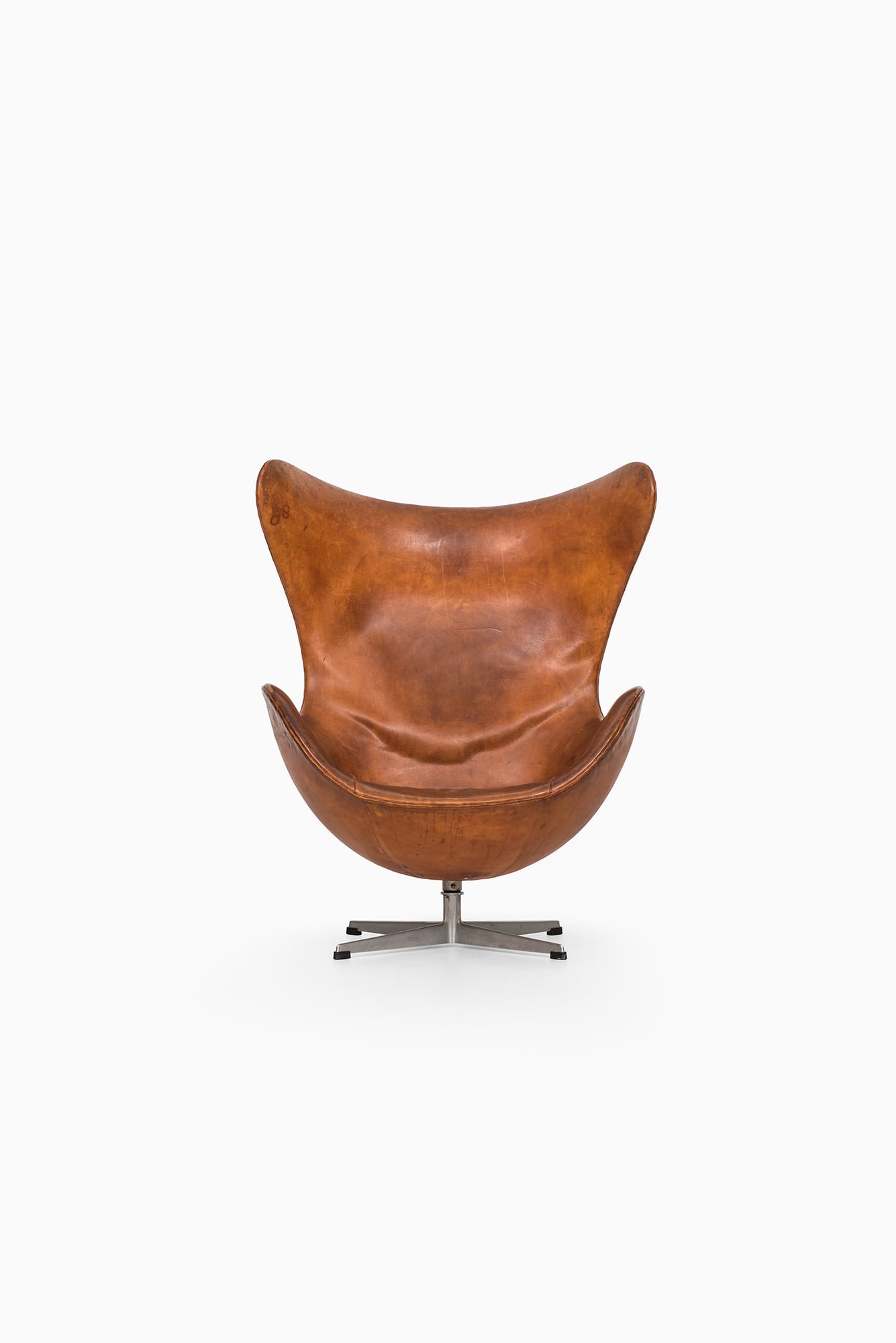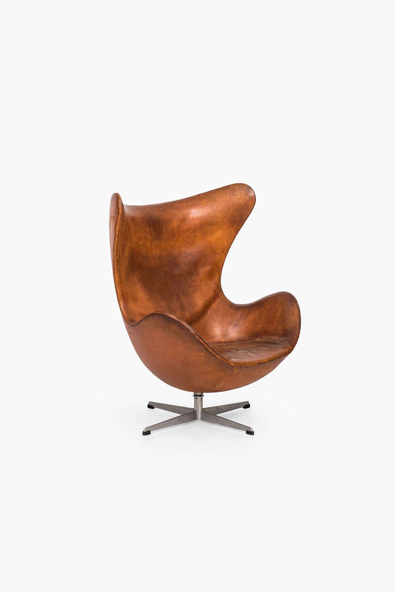 The chair features a sculptural, organic shell made from a strong fiberglass frame, fully upholstered in its original cognac brown leather, which has developed a rich patina over time. The leather shows natural wear, creases, and surface marks consistent with age, adding depth and character to the piece. The chair is mounted on a four-star base in cast aluminium with a swivel function, emphasizing its combination of comfort and mobility.