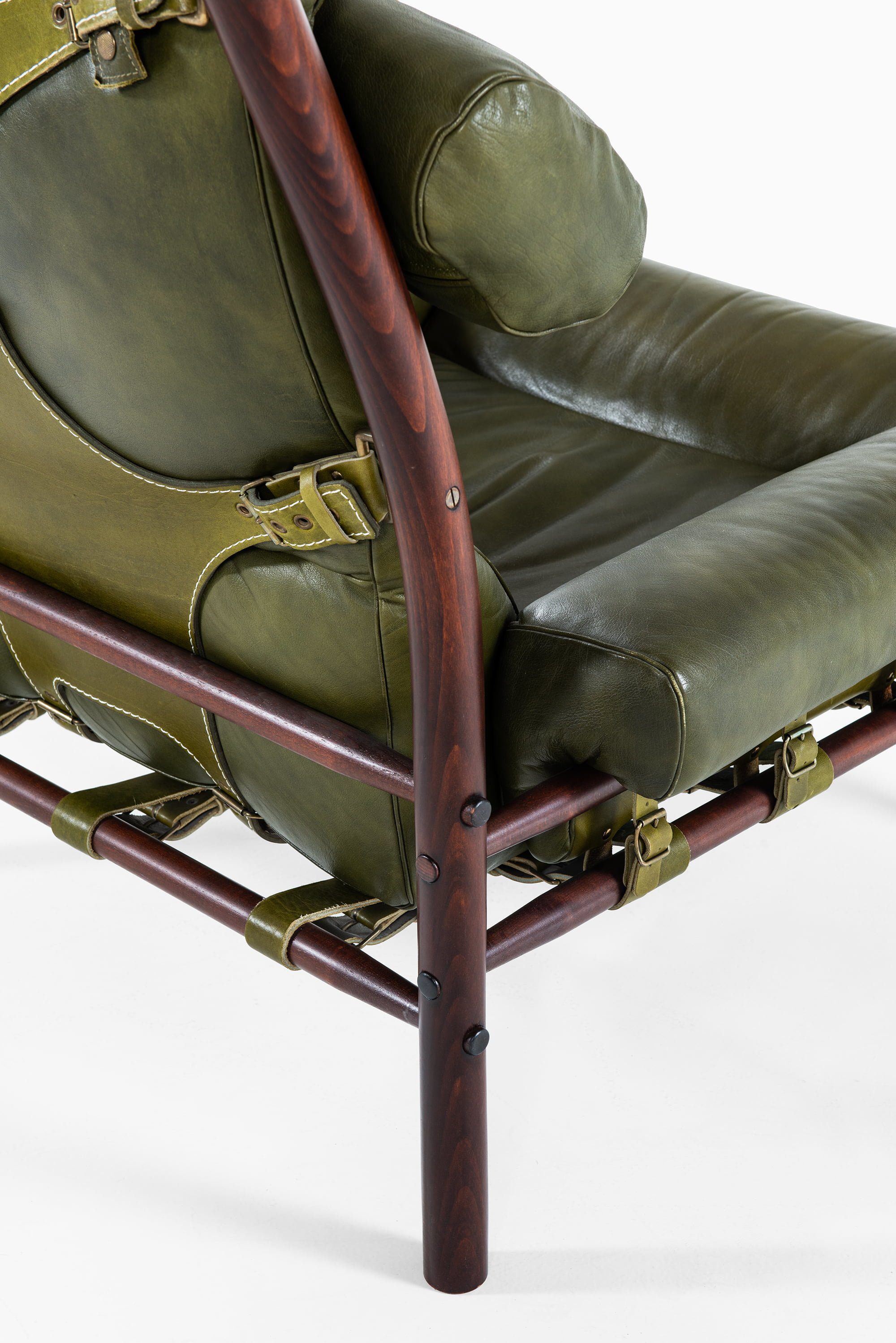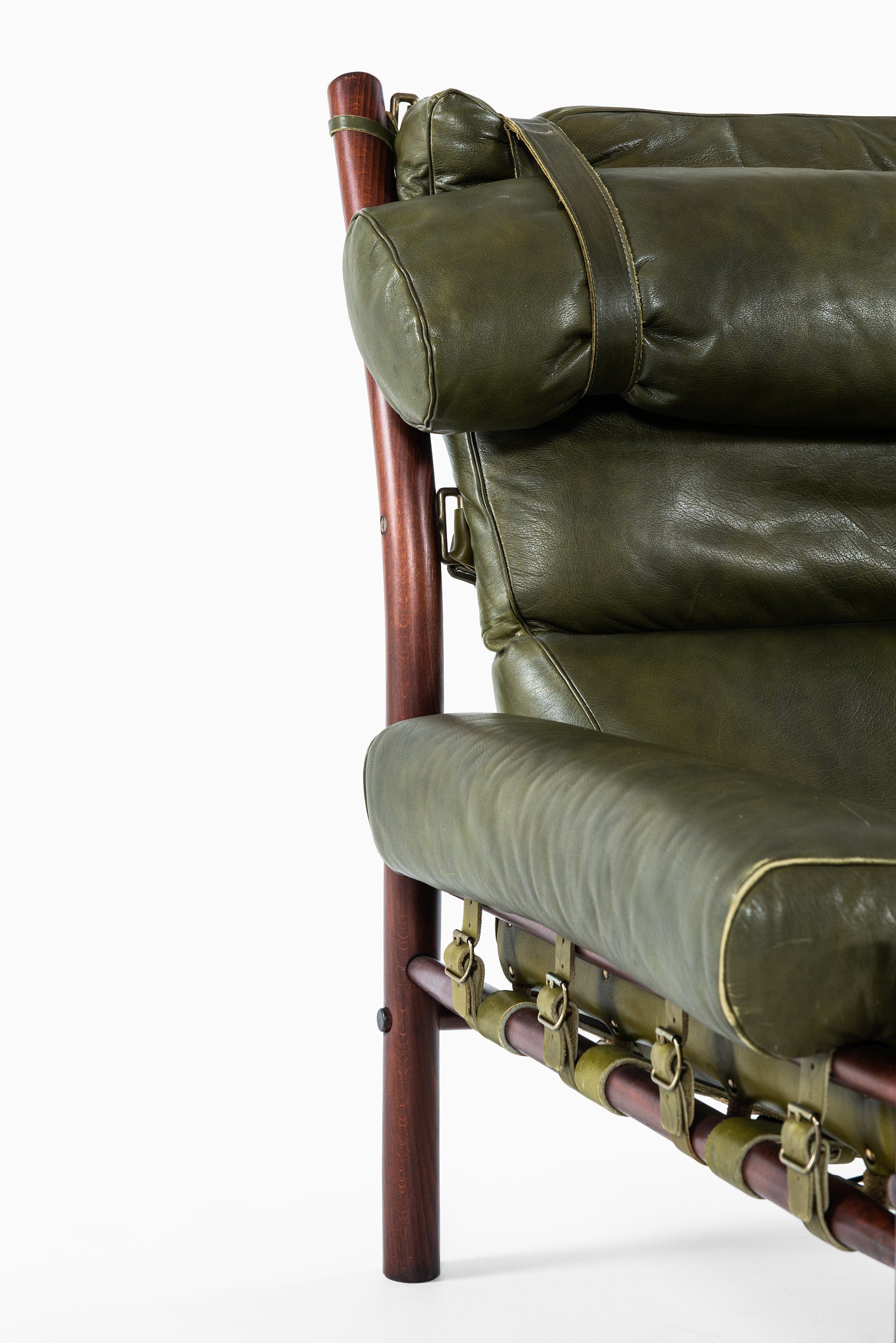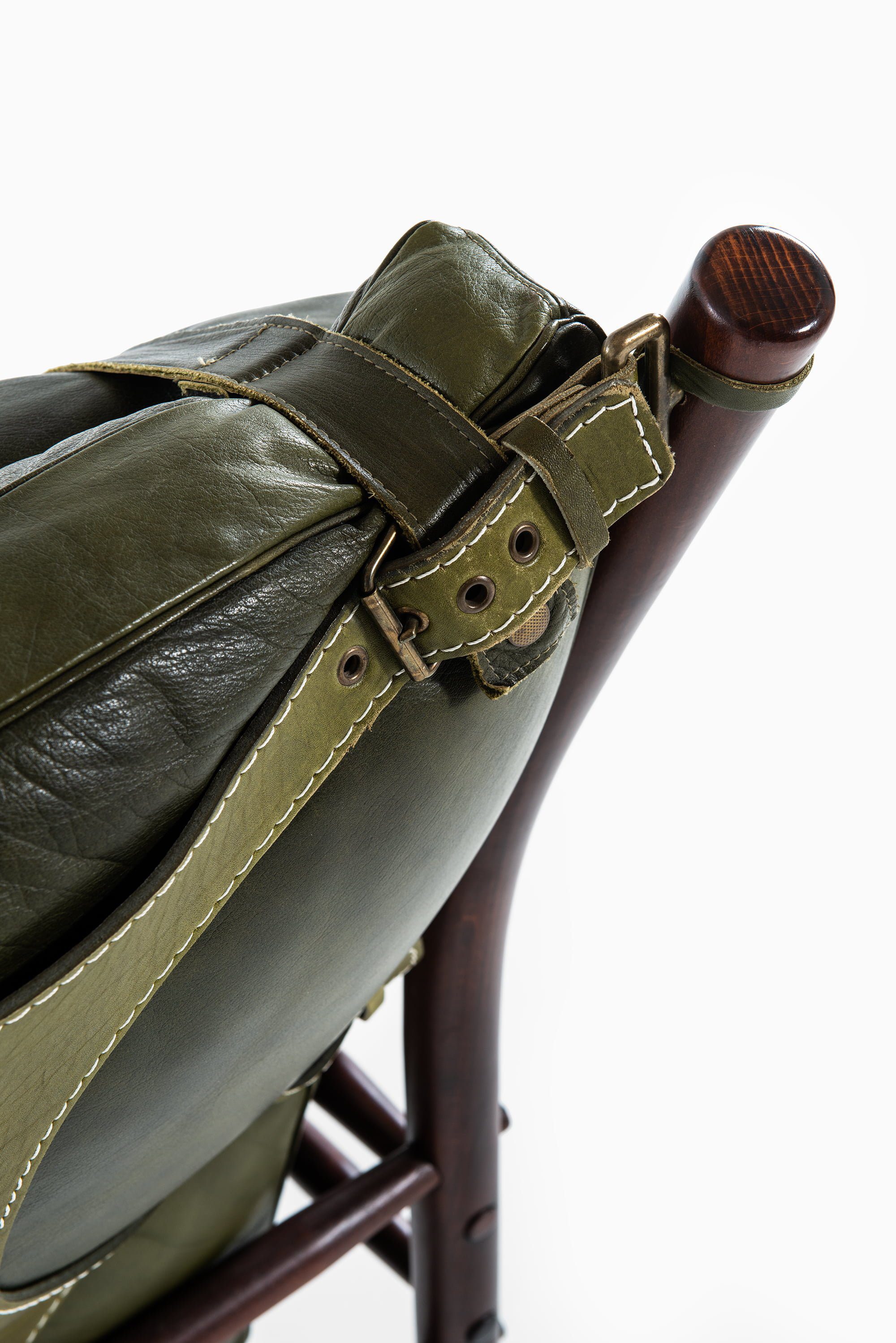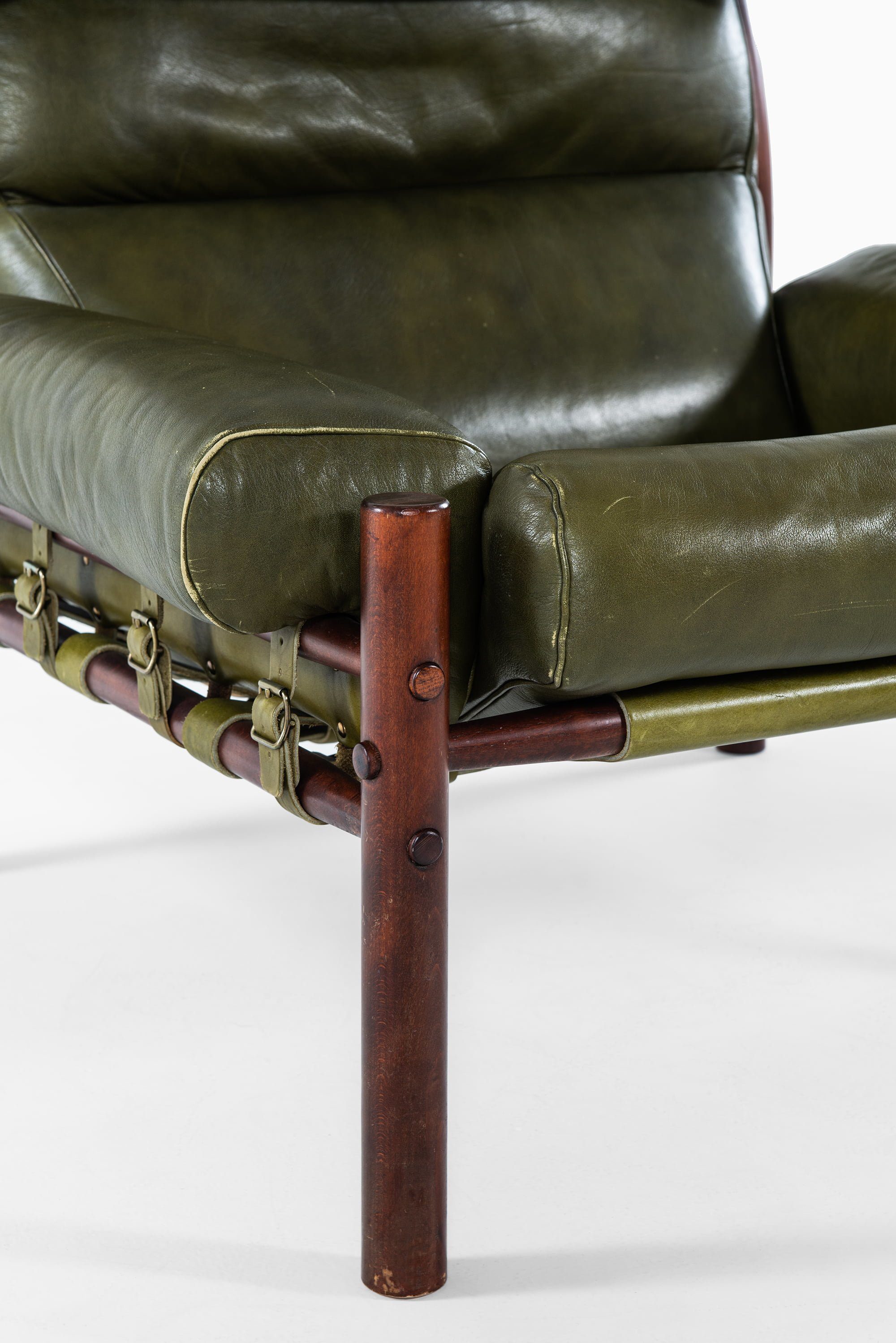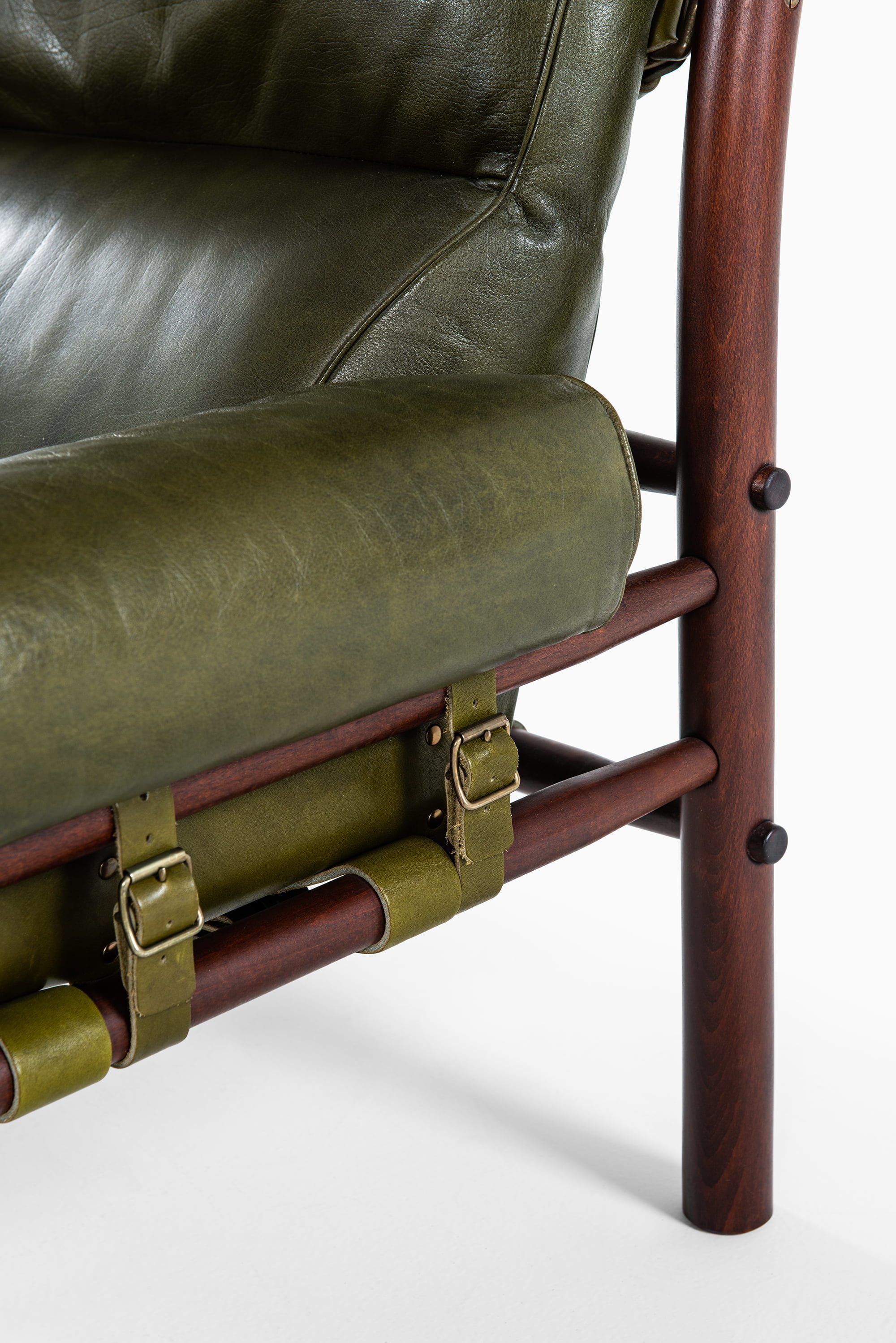 Easy chair model Inca designed by Arne Norell and produced by Arne Norell AB in Sweden during the 1960s. This piece is one of Norell’s most iconic and sought-after designs, combining structural clarity with exceptional comfort and high-quality materials. The chair is constructed from a solid beech frame stained to a deep, dark tone, forming a strong yet elegant support structure. The linear frame is contrasted by the soft, voluminous cushions in original green leather, creating a balanced composition that is both visually striking and highly functional. The leather upholstery shows a rich patina that has developed over time, highlighting the chair’s age and authenticity while adding character and depth to the material.