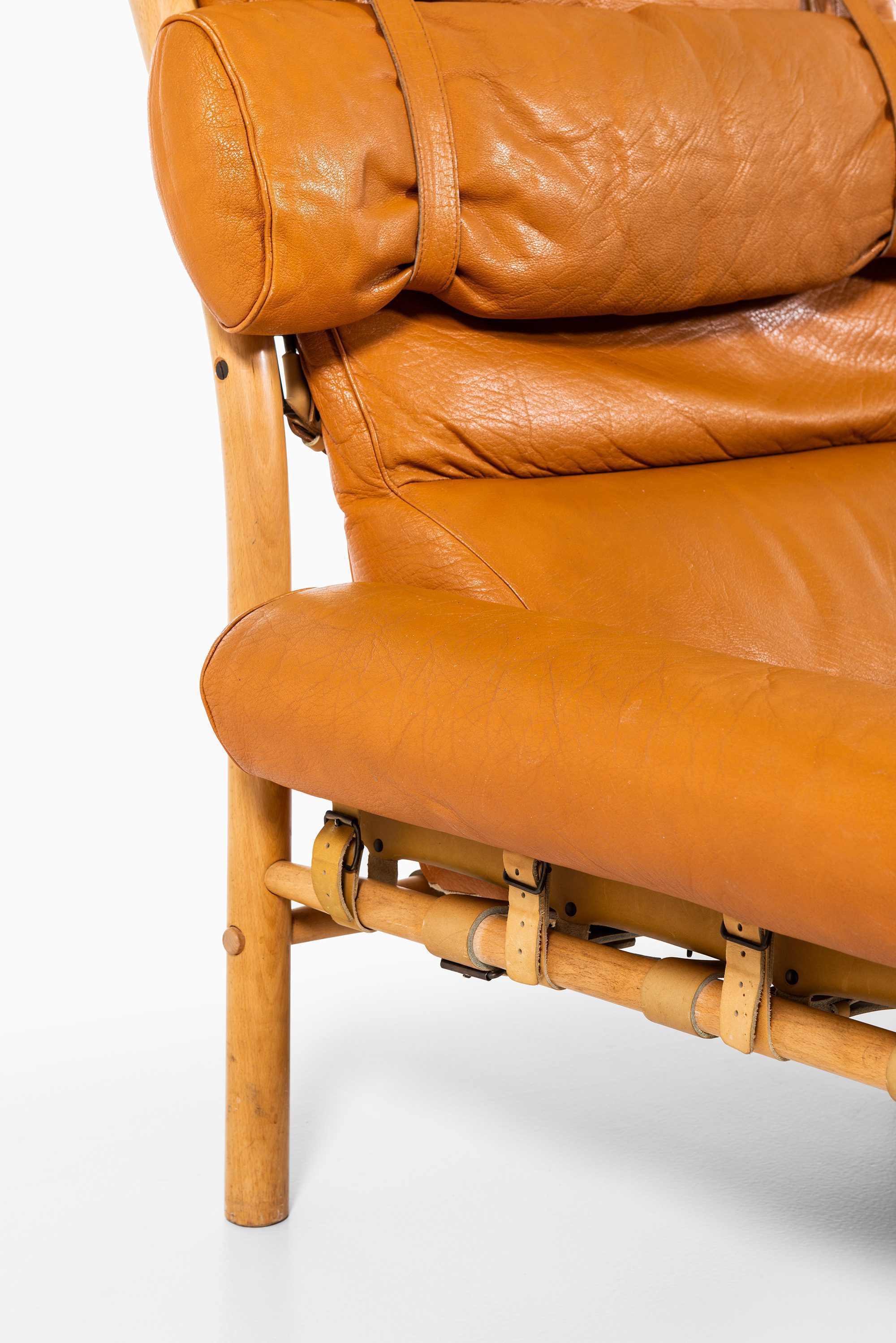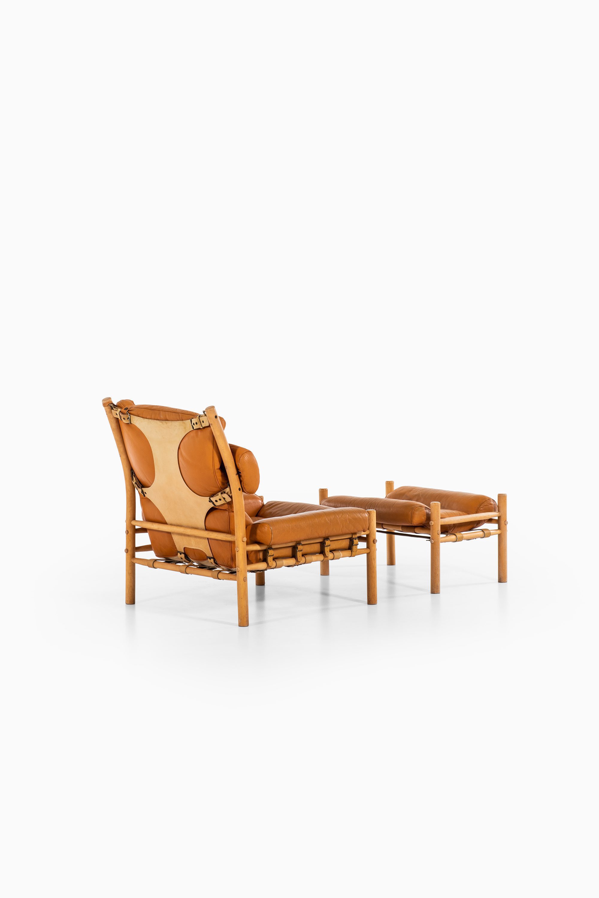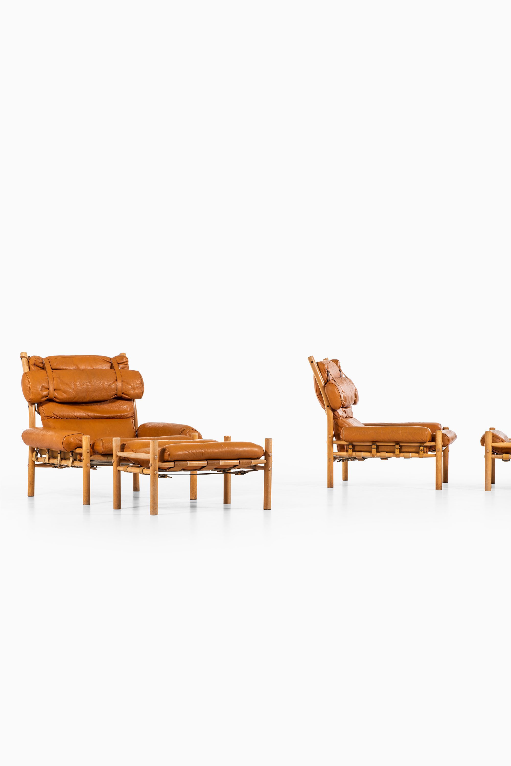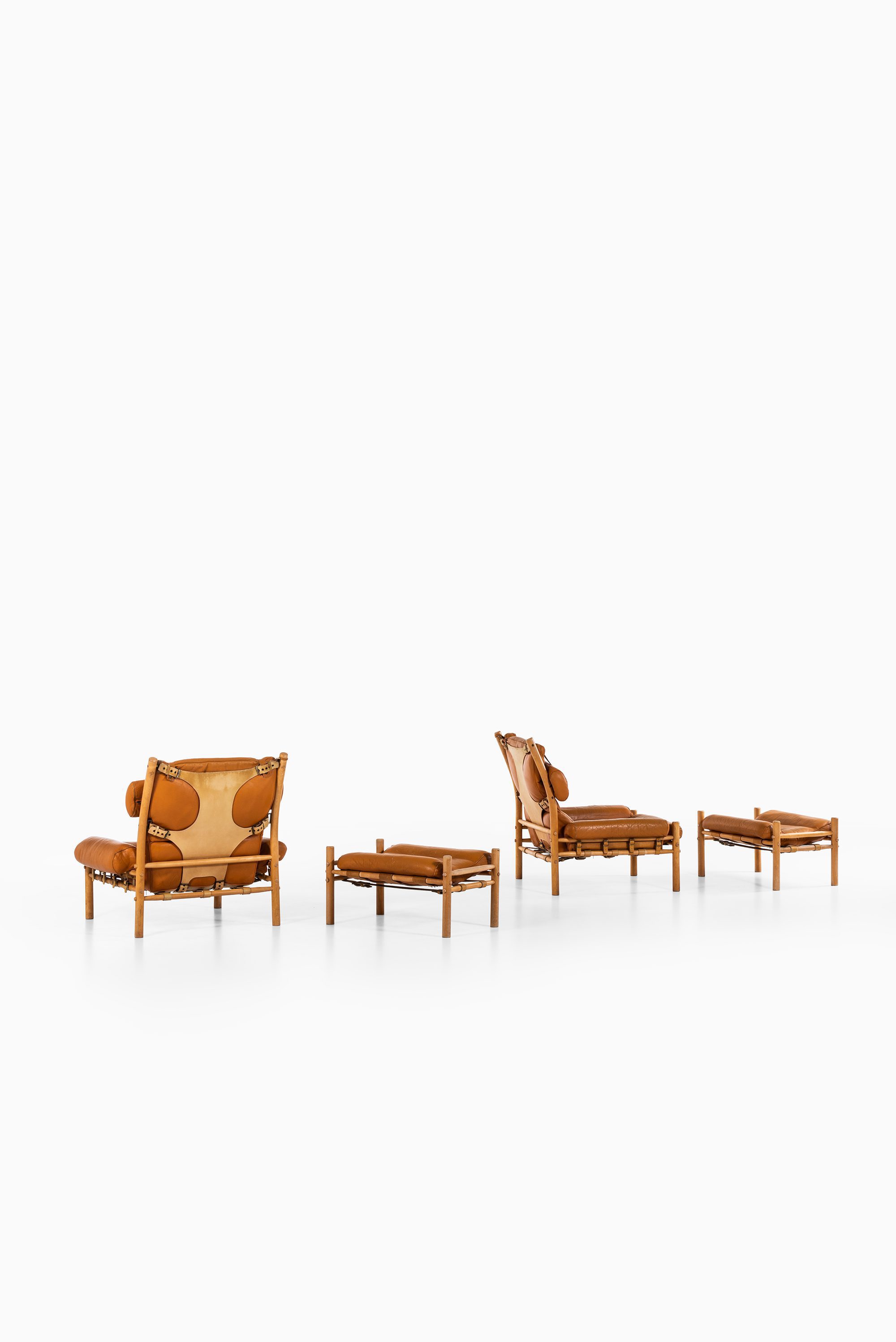 The Inca model, designed by Arne Norell in the 1960s, is one of his most recognizable and enduring furniture designs. This pair of easy chairs with matching stools was produced by Arne Norell AB in Sweden and demonstrates his characteristic approach of combining generous comfort with robust yet elegant construction.
