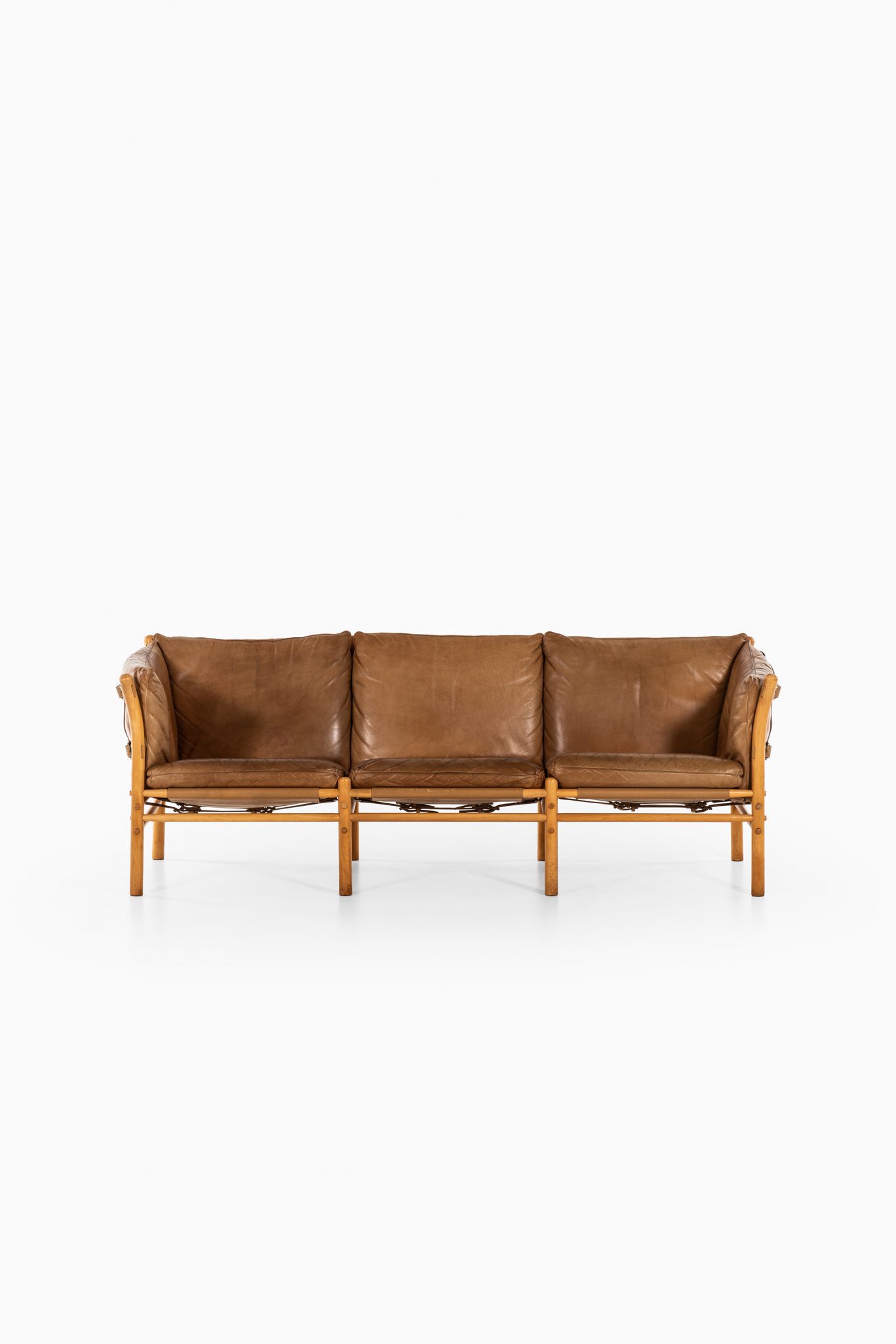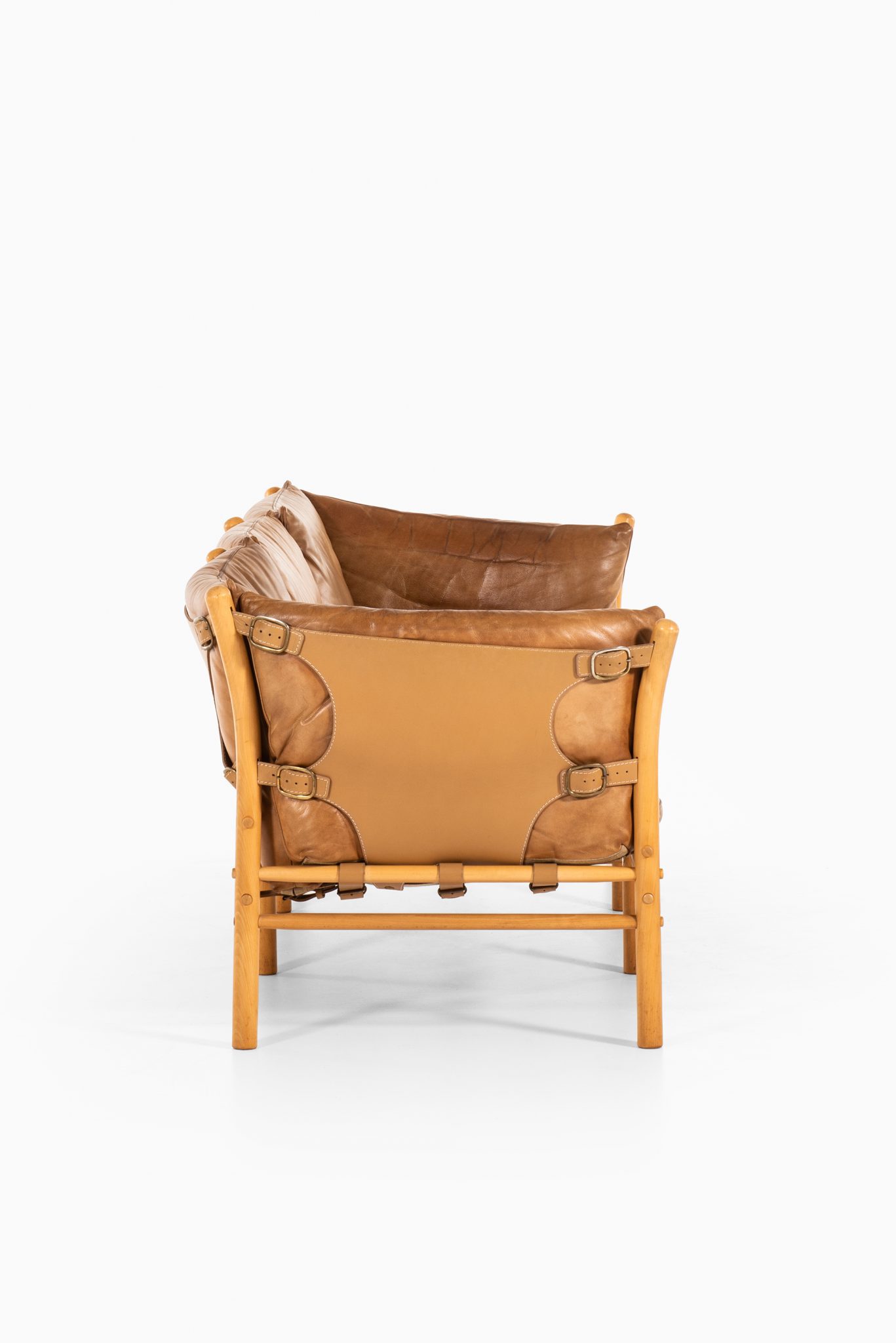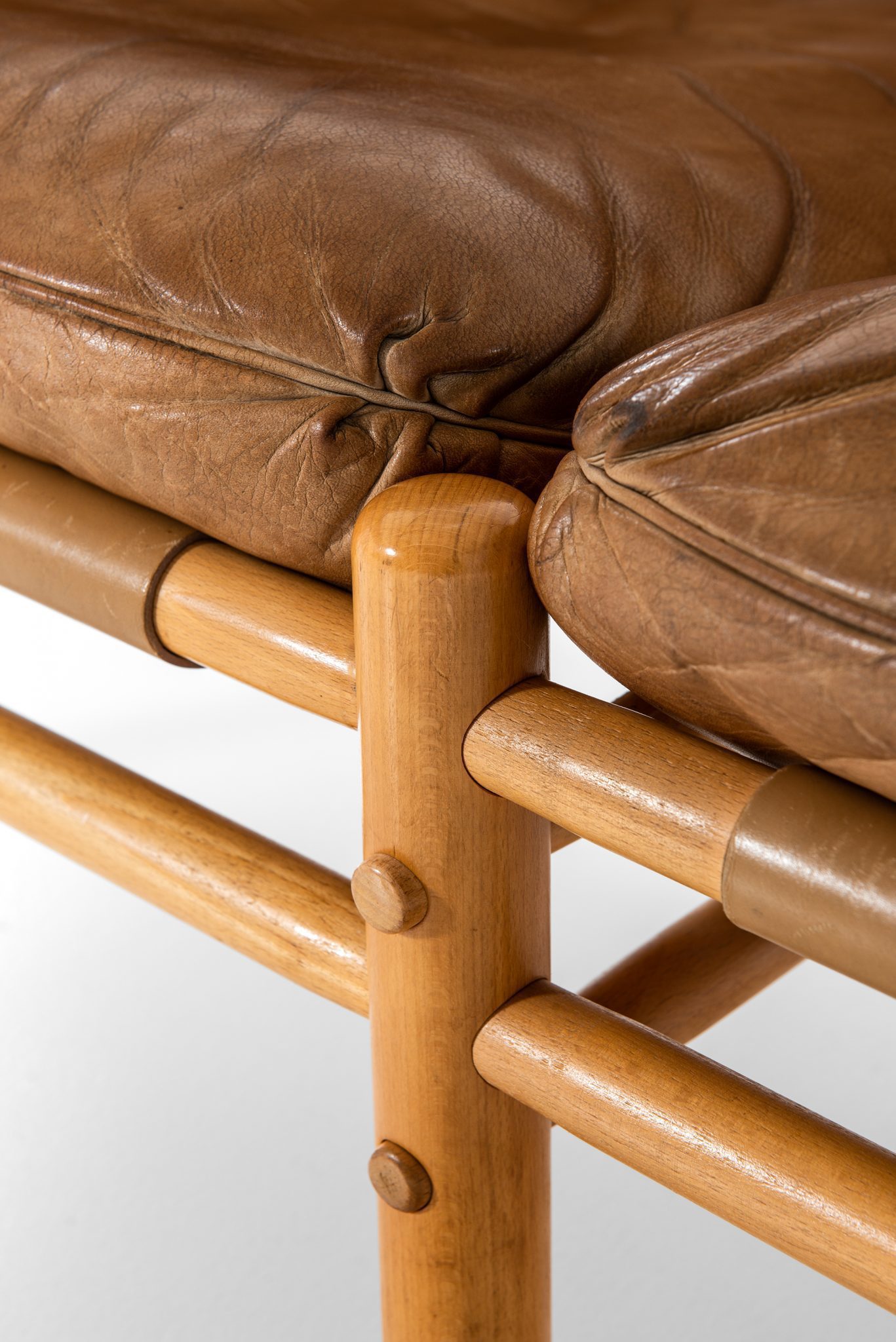 This three-seat sofa, model Ilona, was designed by Arne Norell and produced by Arne Norell AB in Aneby, Sweden, during the 1960s. The sofa embodies a refined expression of Scandinavian modernism, characterized by its combination of high-quality natural materials, visual transparency, and structural elegance. The exposed beechwood frame provides a light and rhythmic skeleton for the upholstered elements, featuring rounded edges and turned components that offer both tactile softness and precise construction.