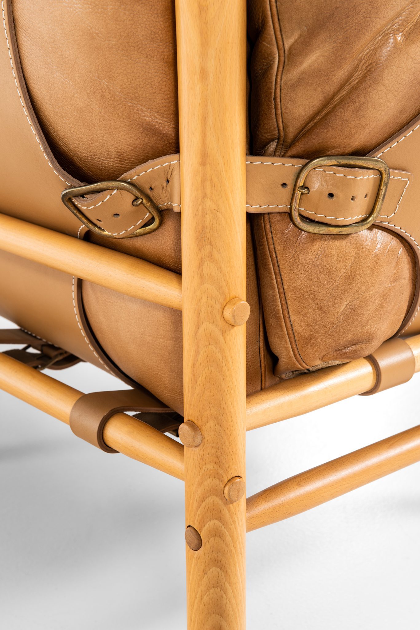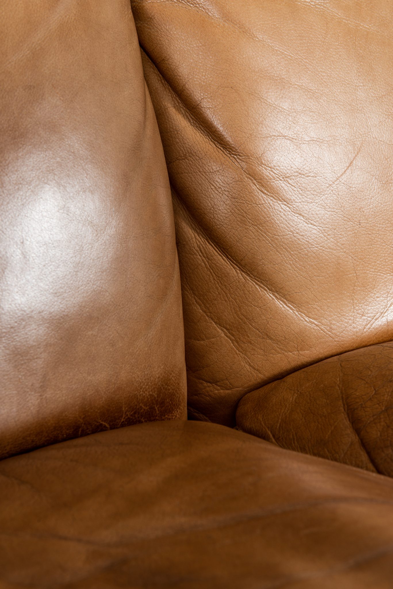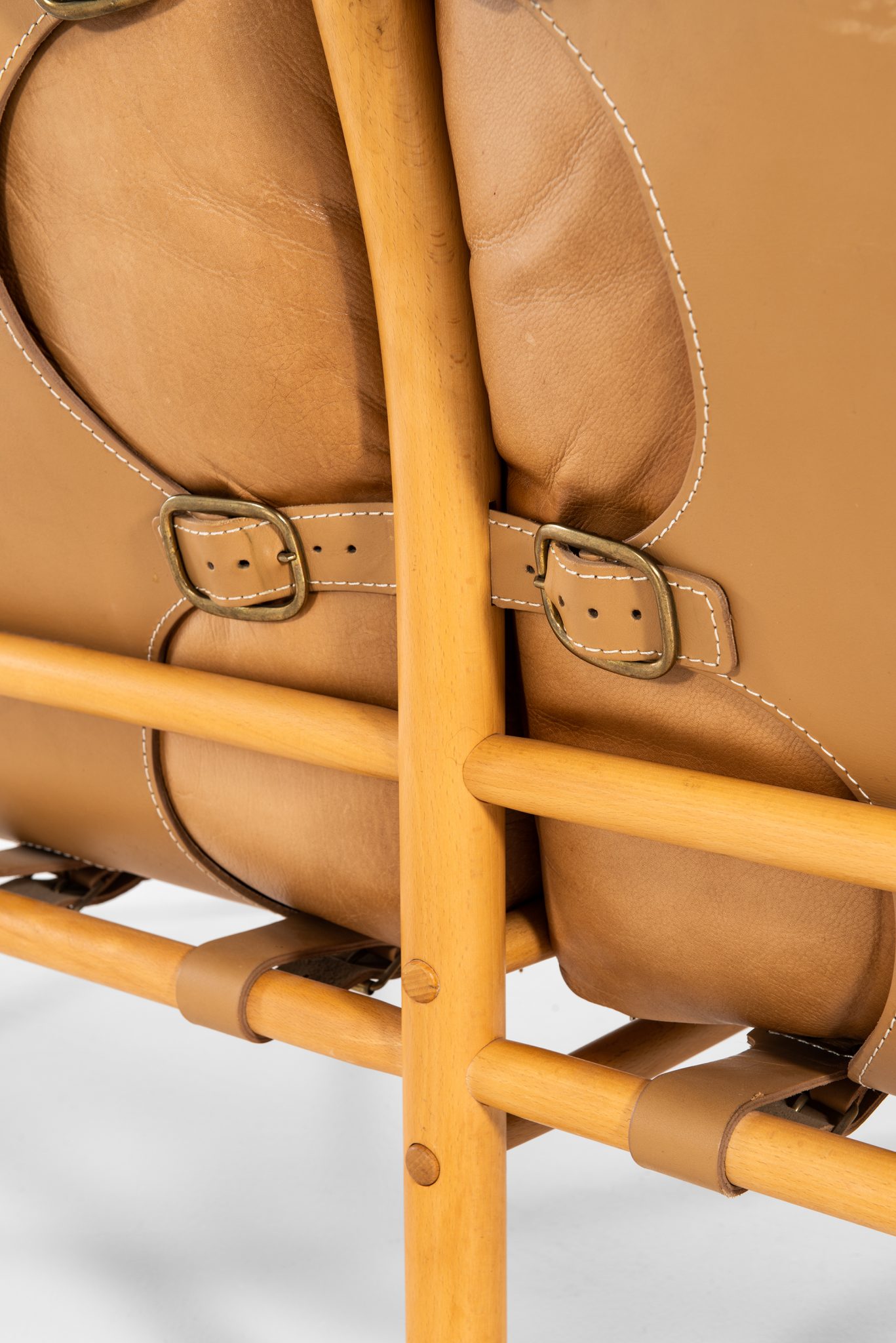 The sofa’s structure is constructed entirely of solid beech, finished in a warm tone that contrasts with the natural cognac-colored leather used for the cushions. The seating elements are suspended within the frame via a system of leather support straps and brass hardware, a hallmark of Norell’s designs that prioritizes both comfort and architectural integrity. The seat and back cushions are generously proportioned, with a soft and lived-in patina developed over time. The back of the sofa reveals circular cushion forms with visible stitching and leather buckle straps, contributing to both the functional tension and decorative rhythm of the piece.