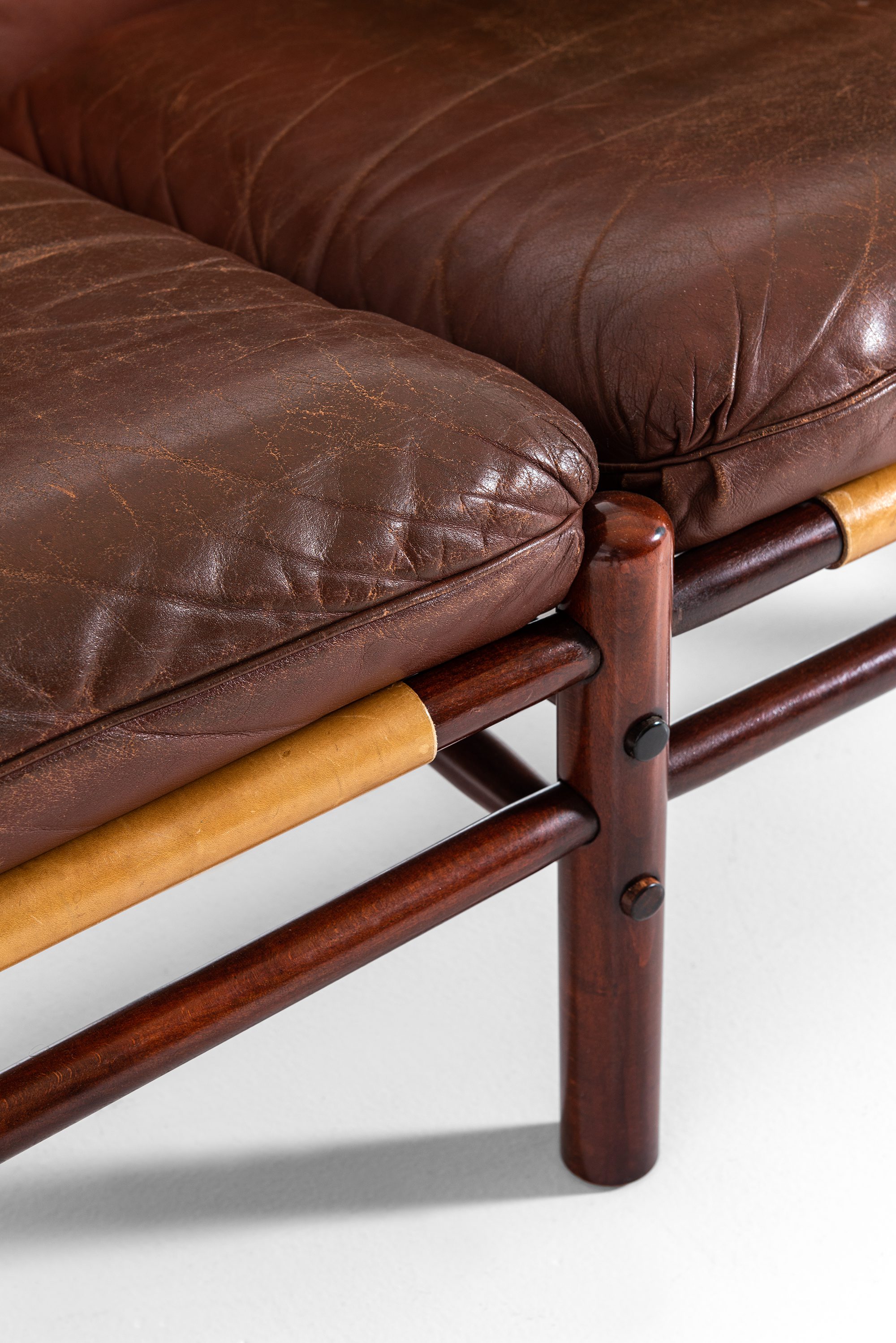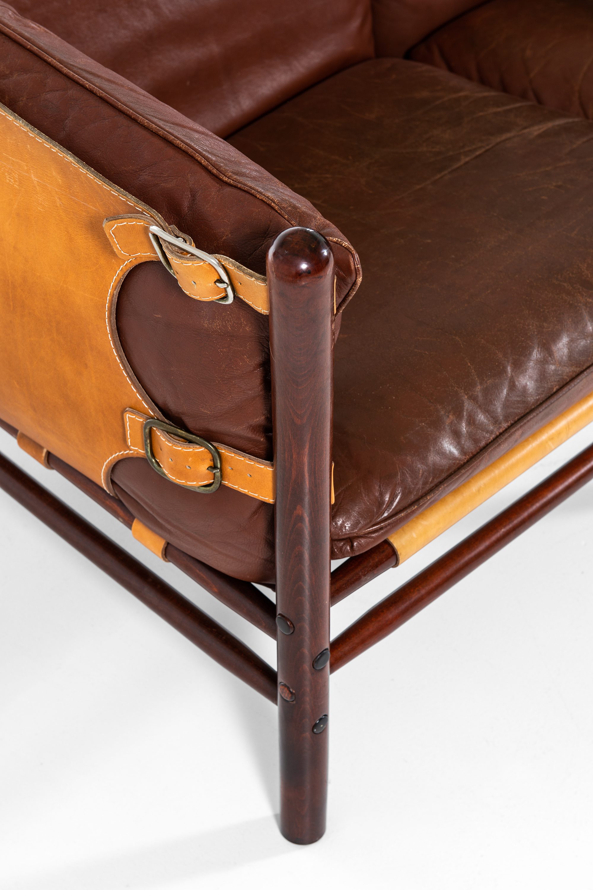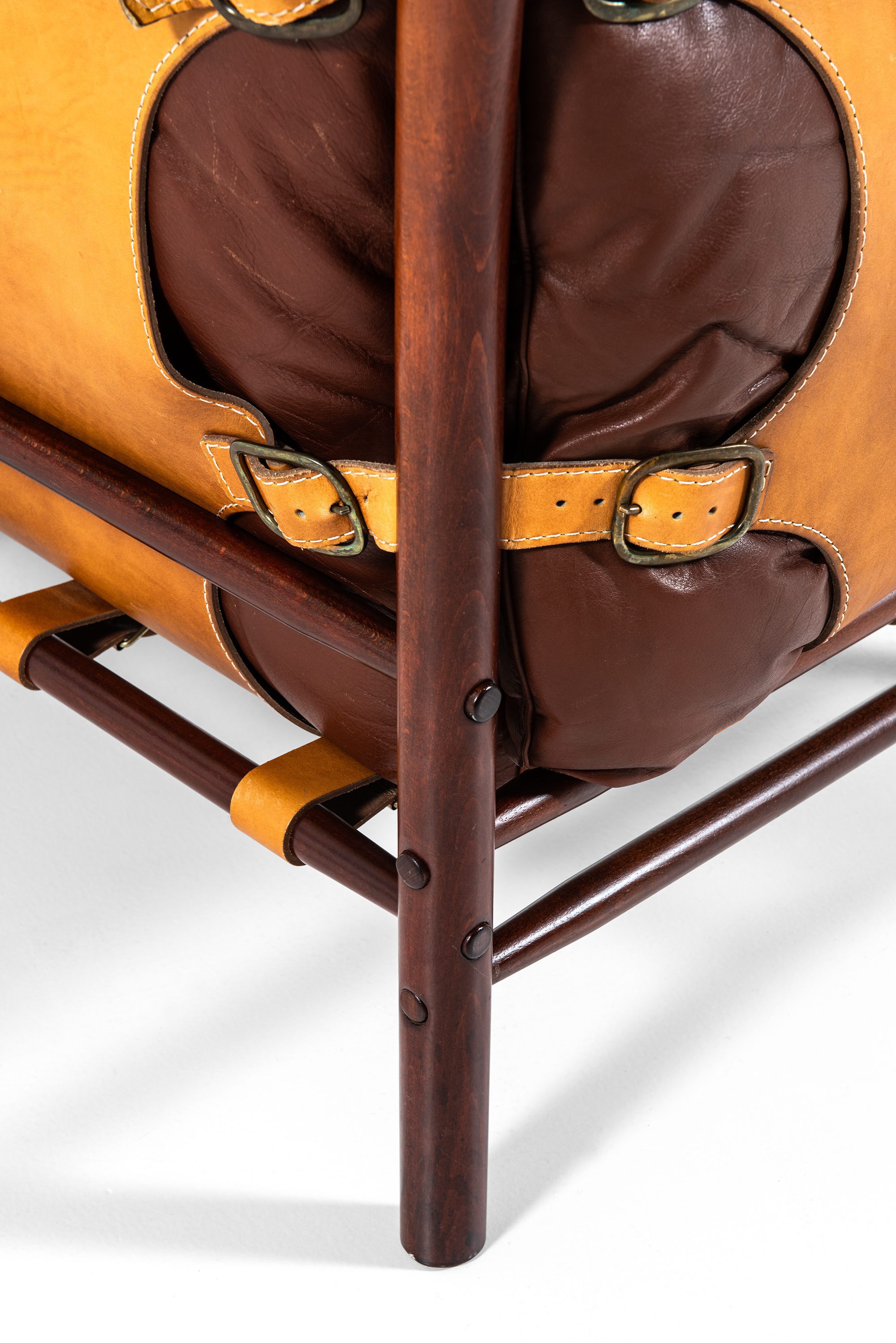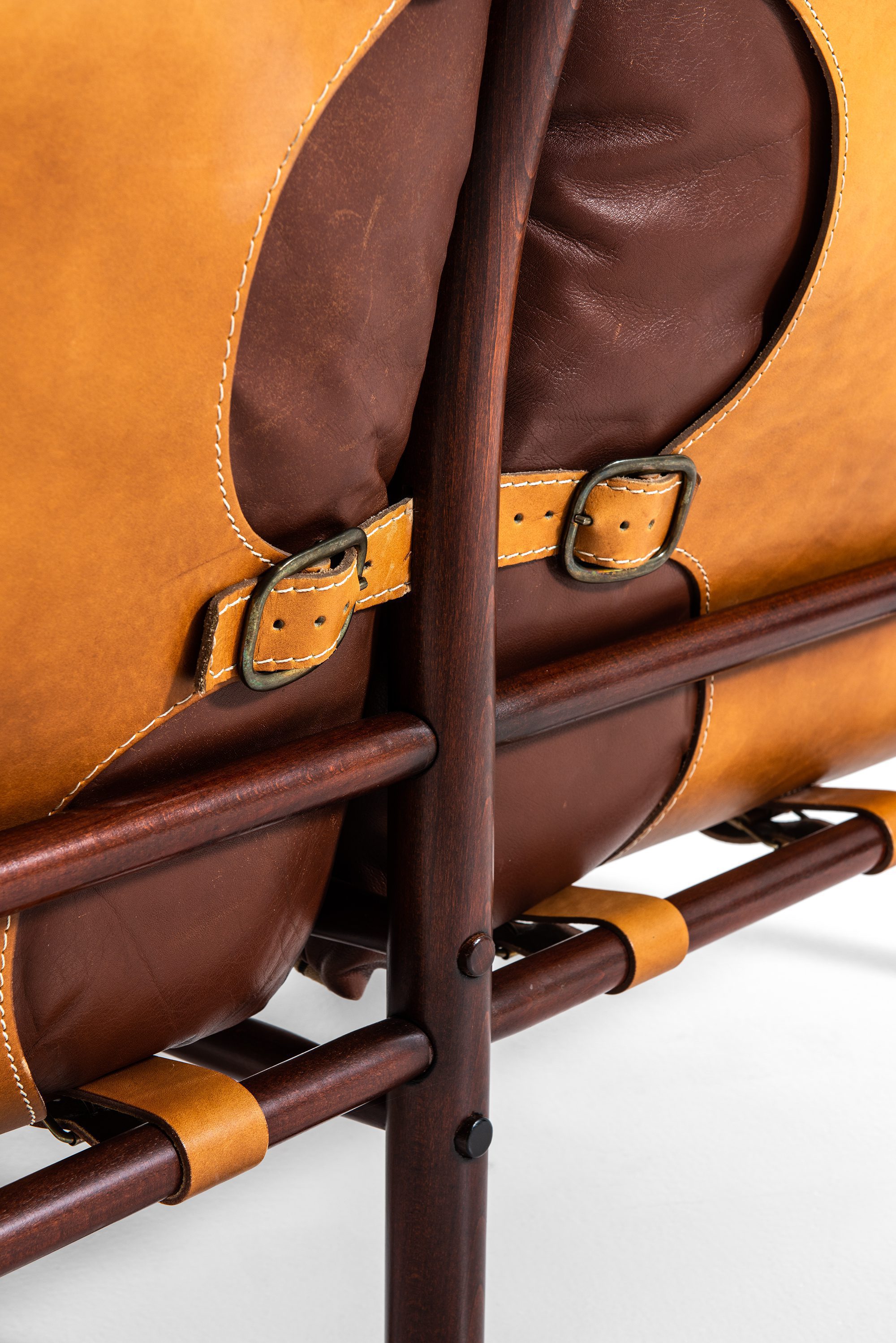 The Ilona two-seat sofa, designed by Arne Norell in the 1960s and produced by Arne Norell AB in Aneby, Sweden, is a prime example of Scandinavian mid-century design, combining fine craftsmanship, natural materials, and functional construction. Norell, known for his use of saddle-making techniques and visible structural elements, created the Ilona with an exposed beech frame in a dark stain, cylindrical members, and brass fittings.