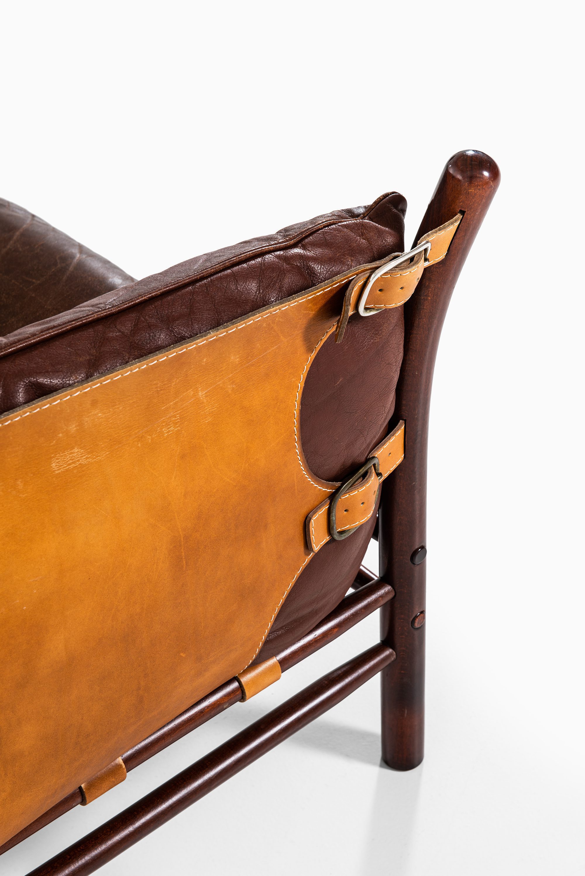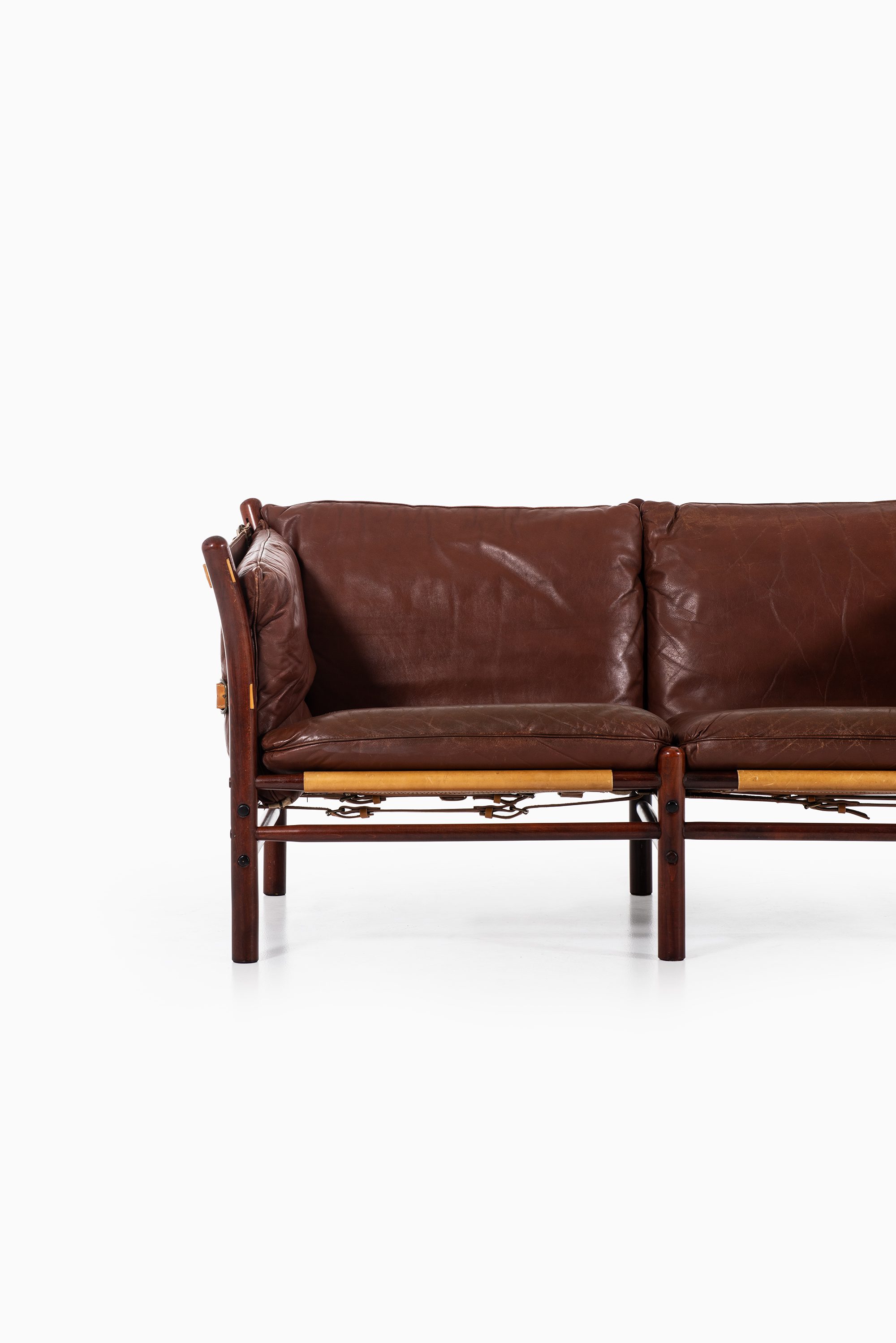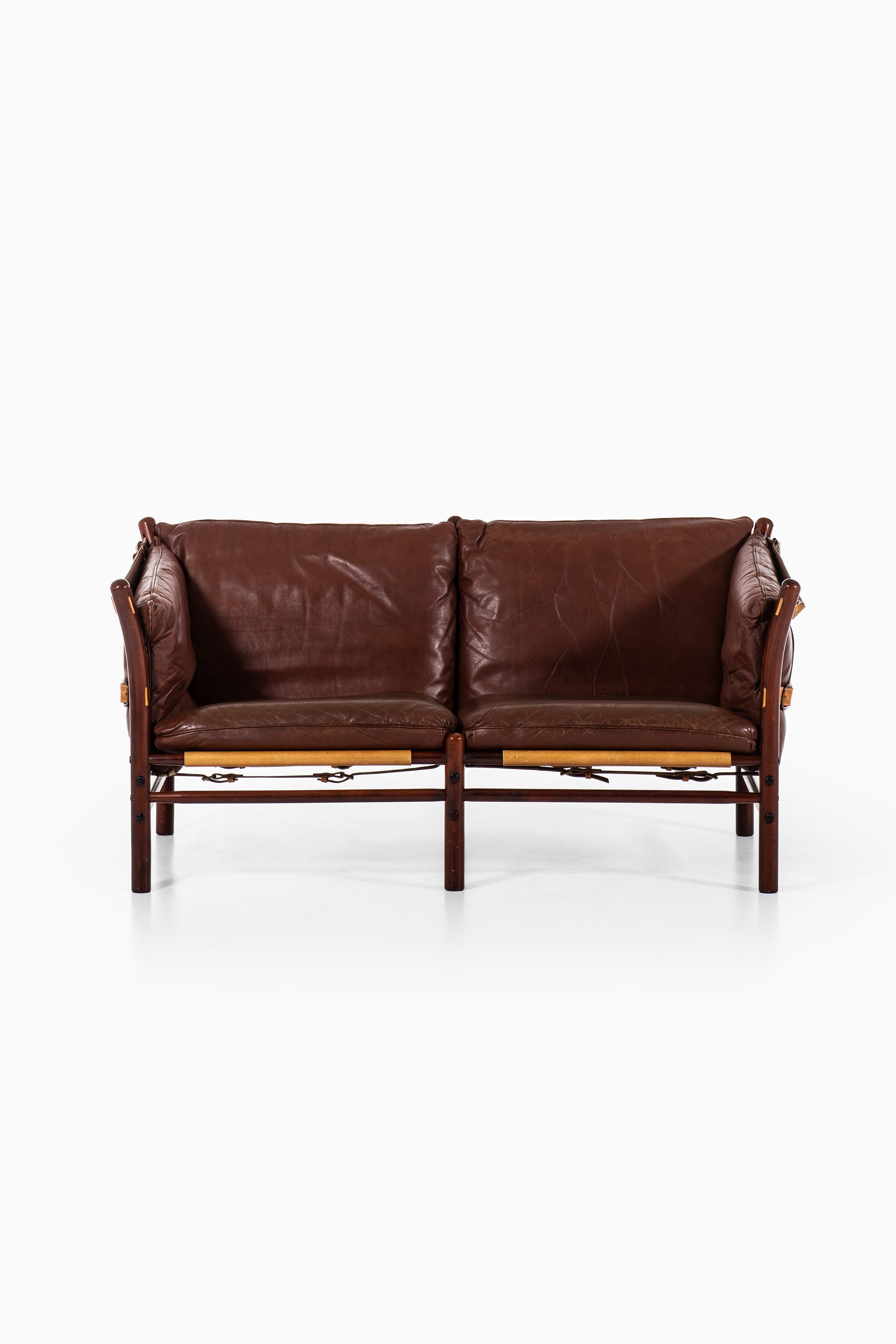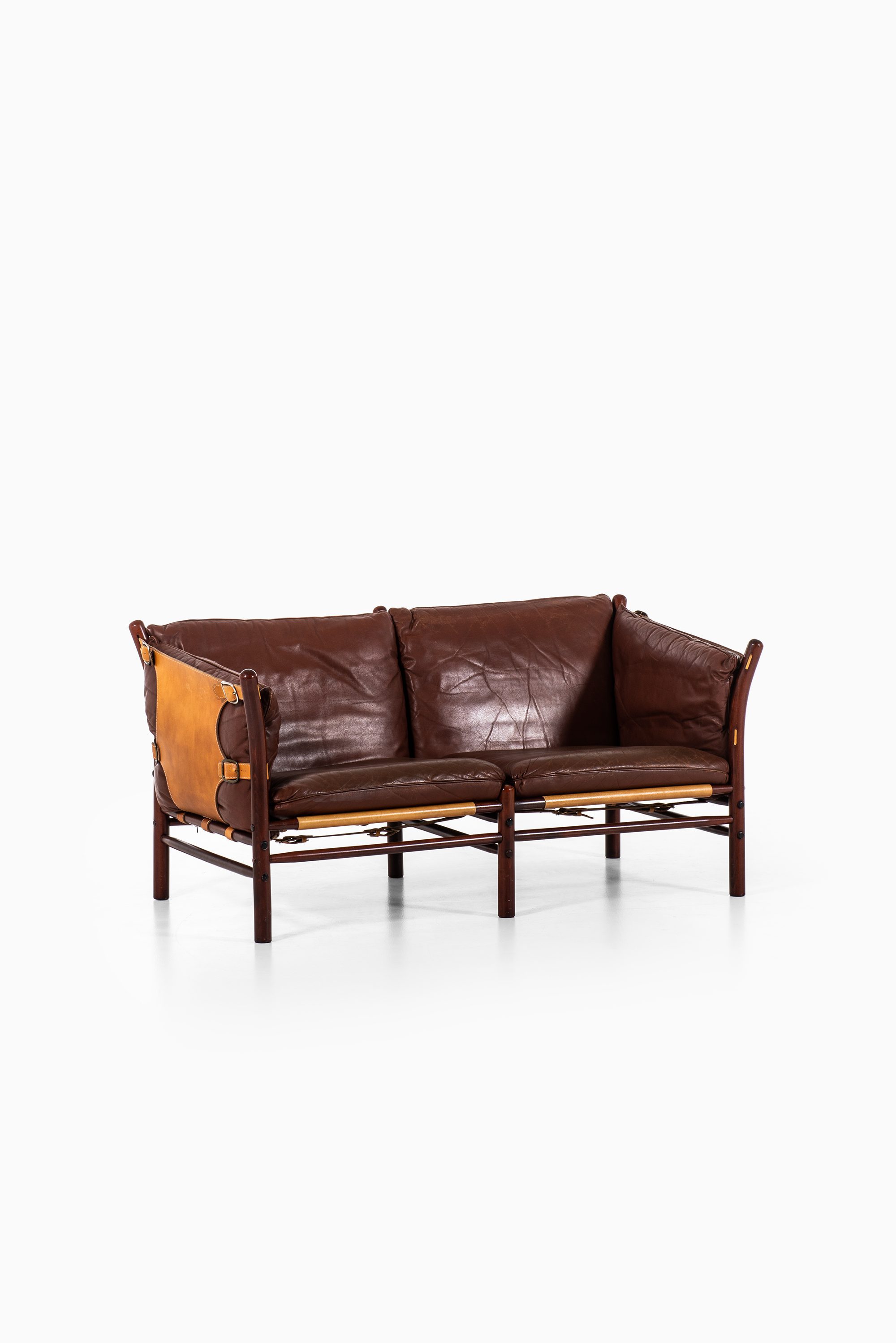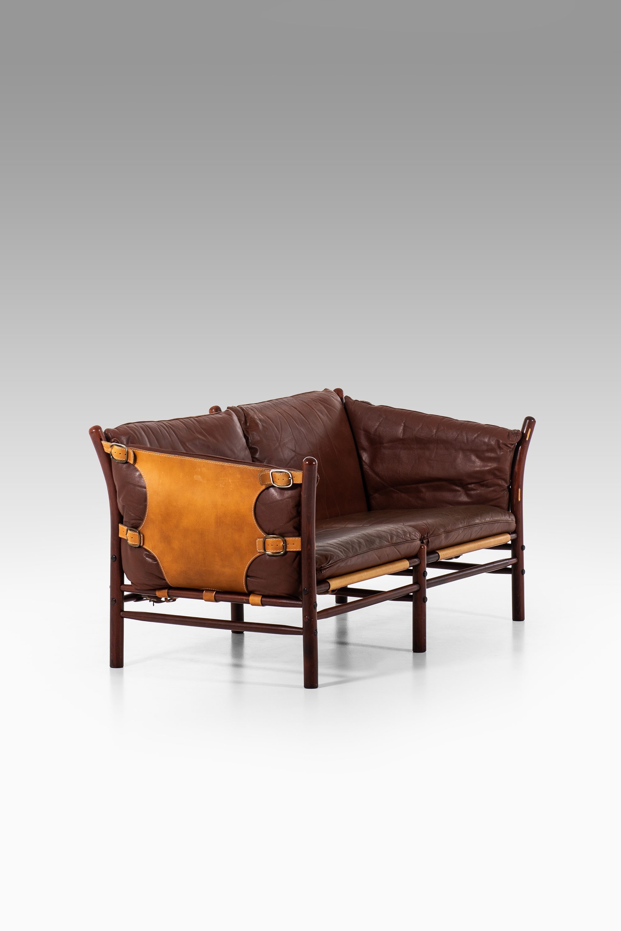 The Ilona two-seat sofa, designed by Arne Norell in the 1960s and produced by Arne Norell AB in Aneby, Sweden, is a prime example of Scandinavian mid-century design, combining fine craftsmanship, natural materials, and functional construction. Norell, known for his use of saddle-making techniques and visible structural elements, created the Ilona with an exposed beech frame in a dark stain, cylindrical members, and brass fittings.
