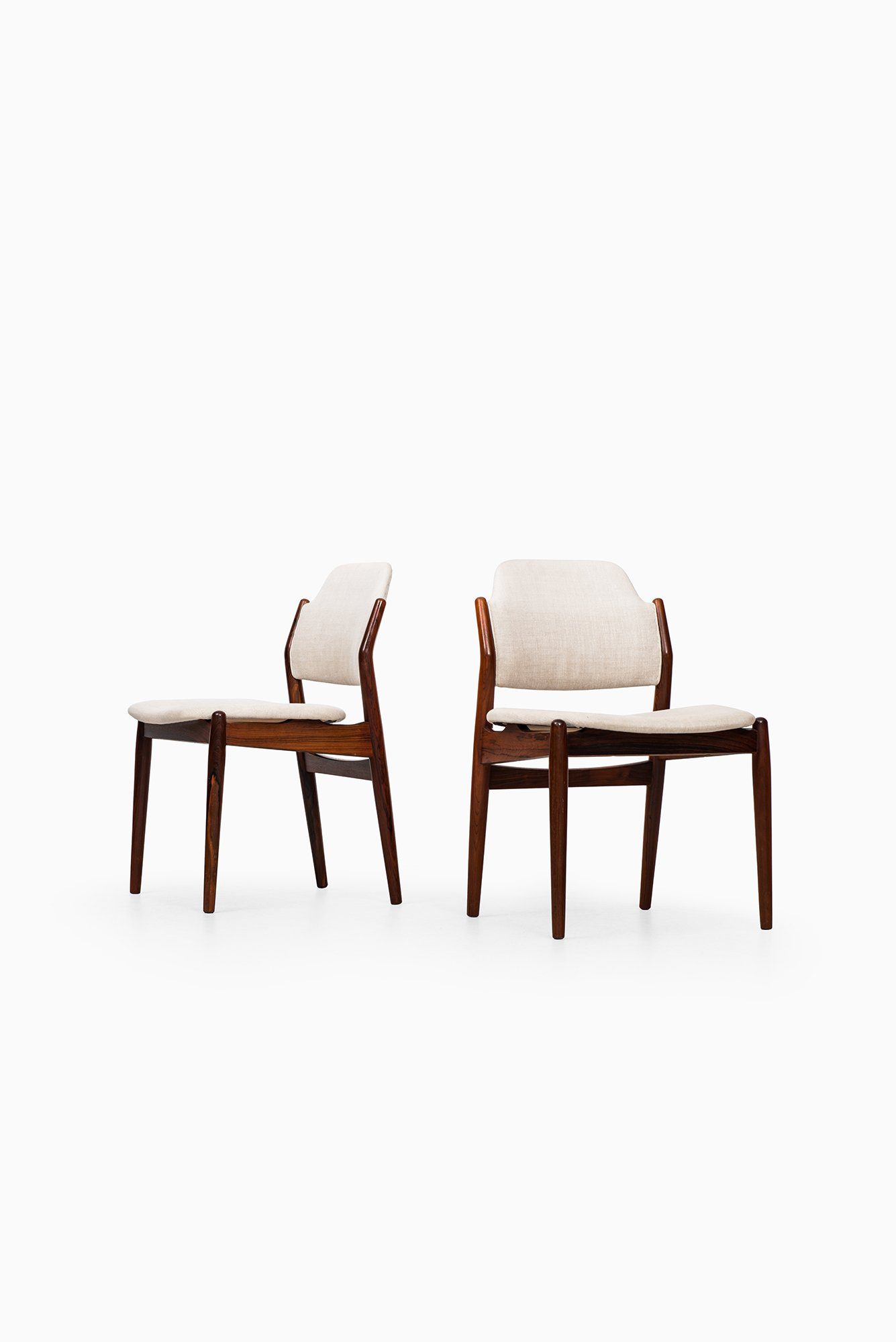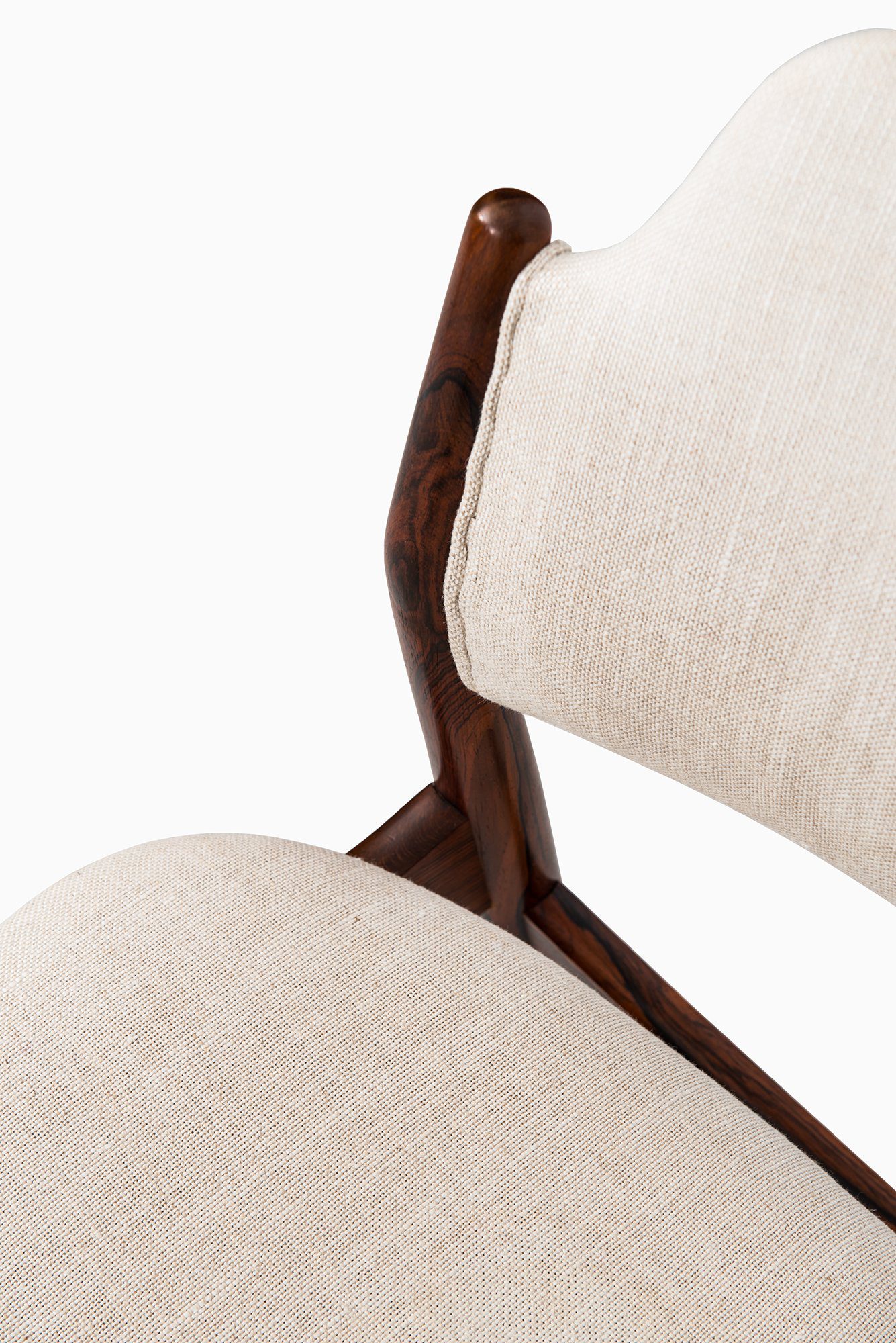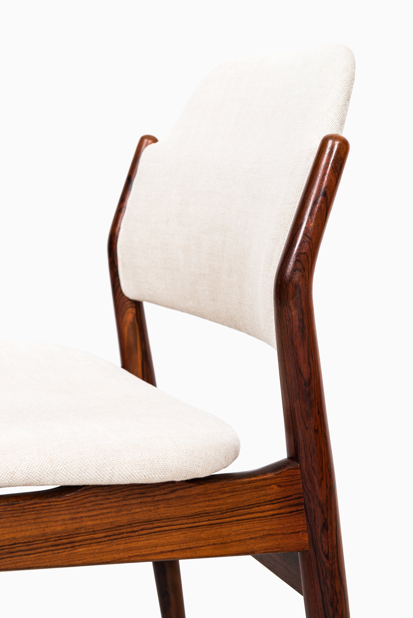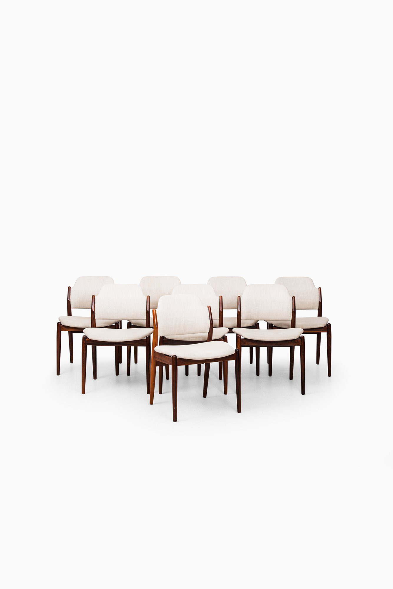 This rare set of eight dining chairs, model 462, was designed by Arne Vodder and produced by Sibast Møbelfabrik in Denmark in 1961. Executed in rosewood with original linen upholstery, these chairs exemplify the refined craftsmanship and sculptural elegance characteristic of Vodder’s work.