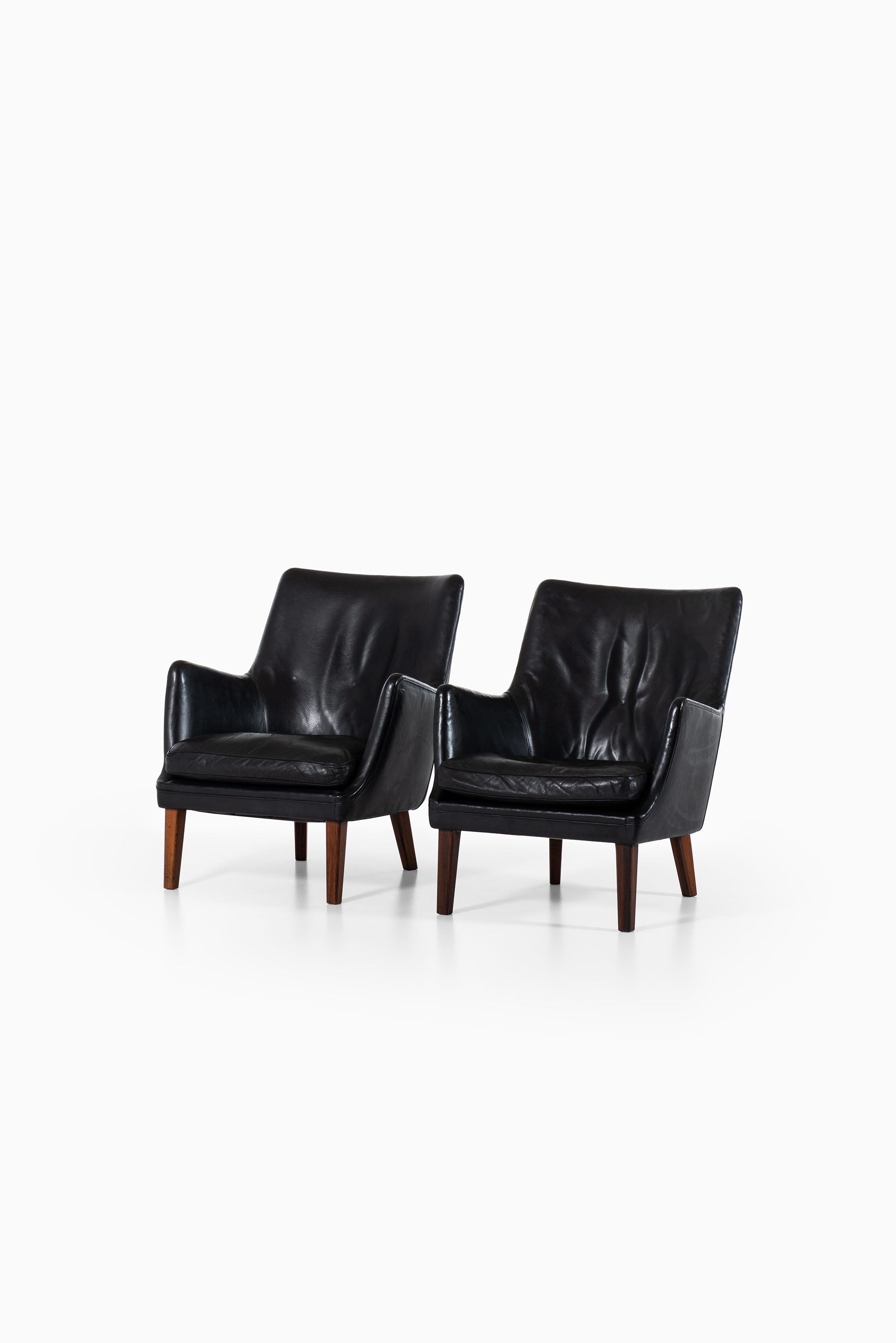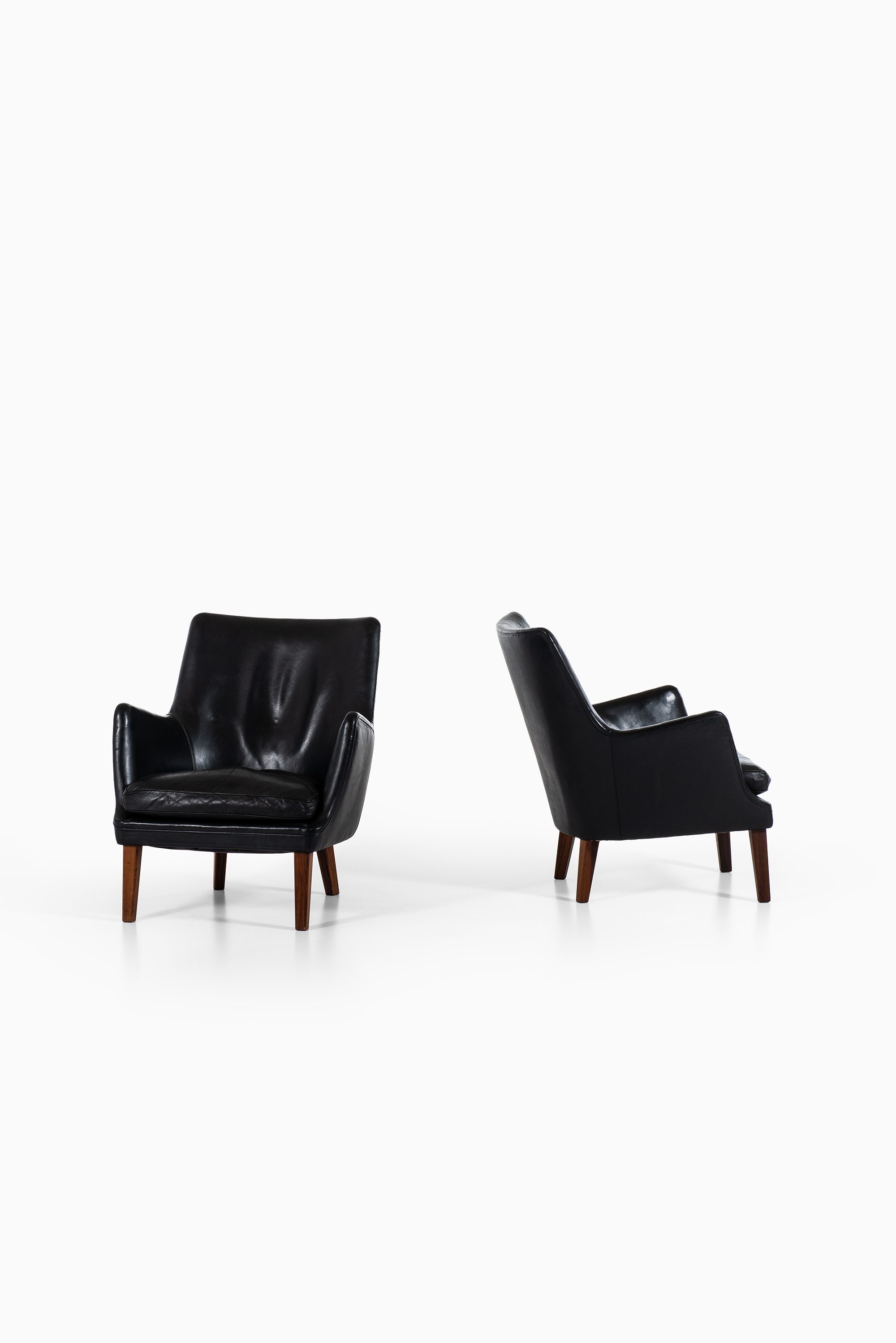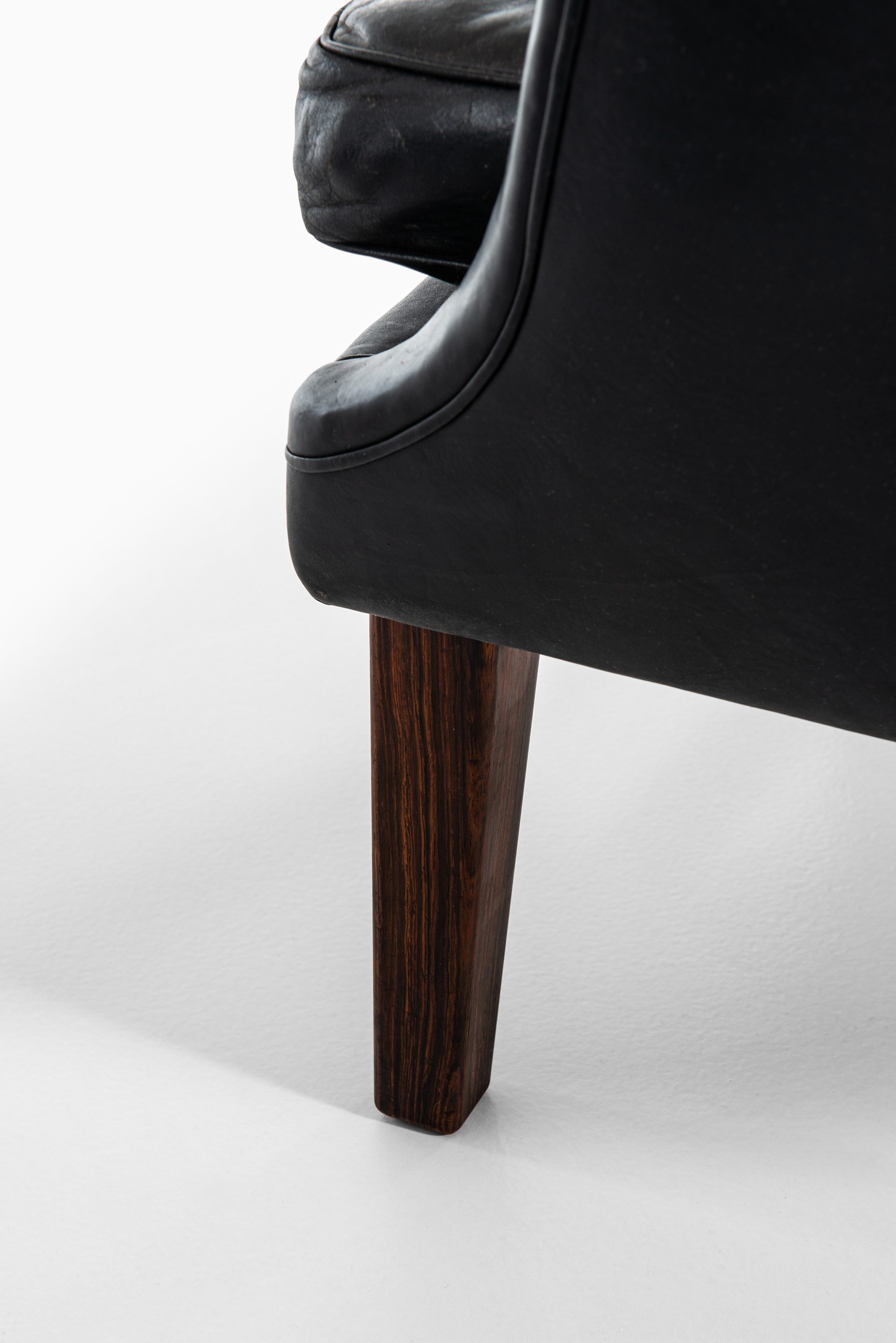 This rare pair of easy chairs was designed by Arne Vodder and produced by Ivan Schlechter in Denmark in 1953. The chairs are crafted in rosewood with their original black leather upholstery. The design exemplifies Vodder’s signature balance between sculptural form and refined restraint, where organic curvature meets precise craftsmanship characteristic of early Danish modernism.