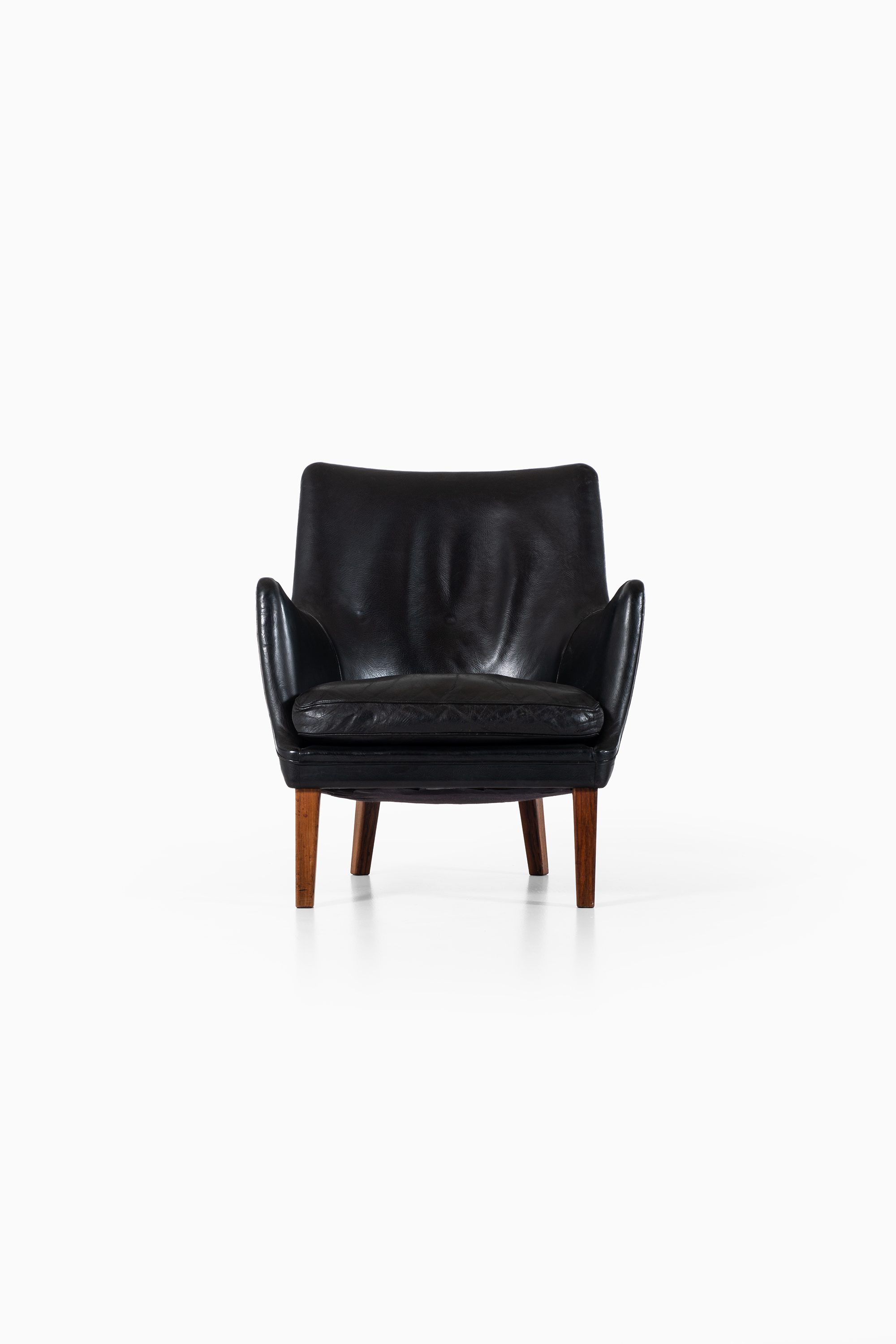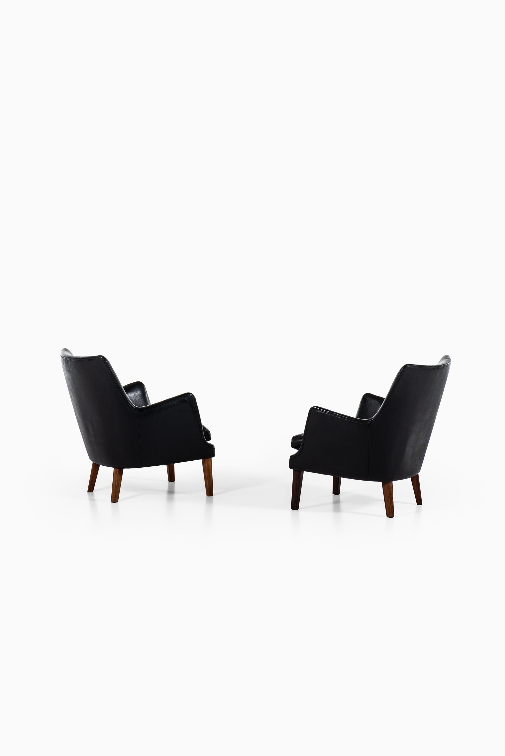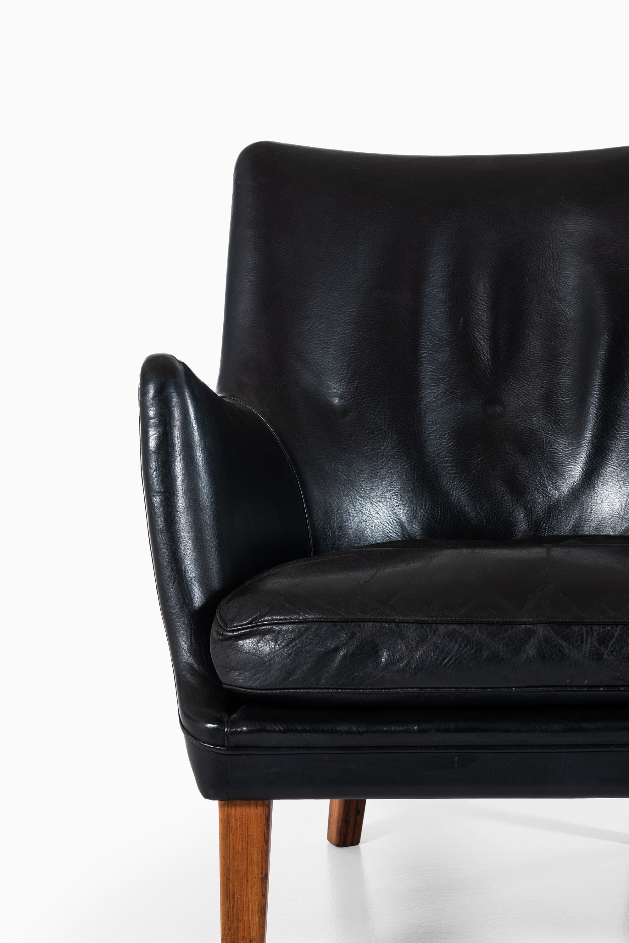 This rare pair of easy chairs was designed by Arne Vodder and produced by Ivan Schlechter in Denmark in 1953. The chairs are crafted in rosewood with their original black leather upholstery. The design exemplifies Vodder’s signature balance between sculptural form and refined restraint, where organic curvature meets precise craftsmanship characteristic of early Danish modernism.