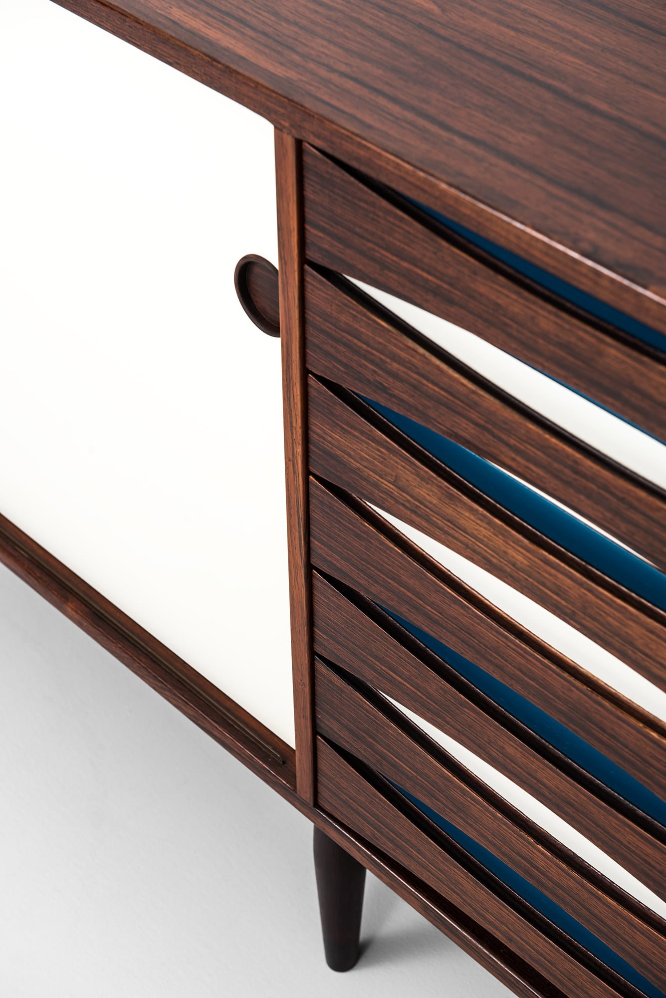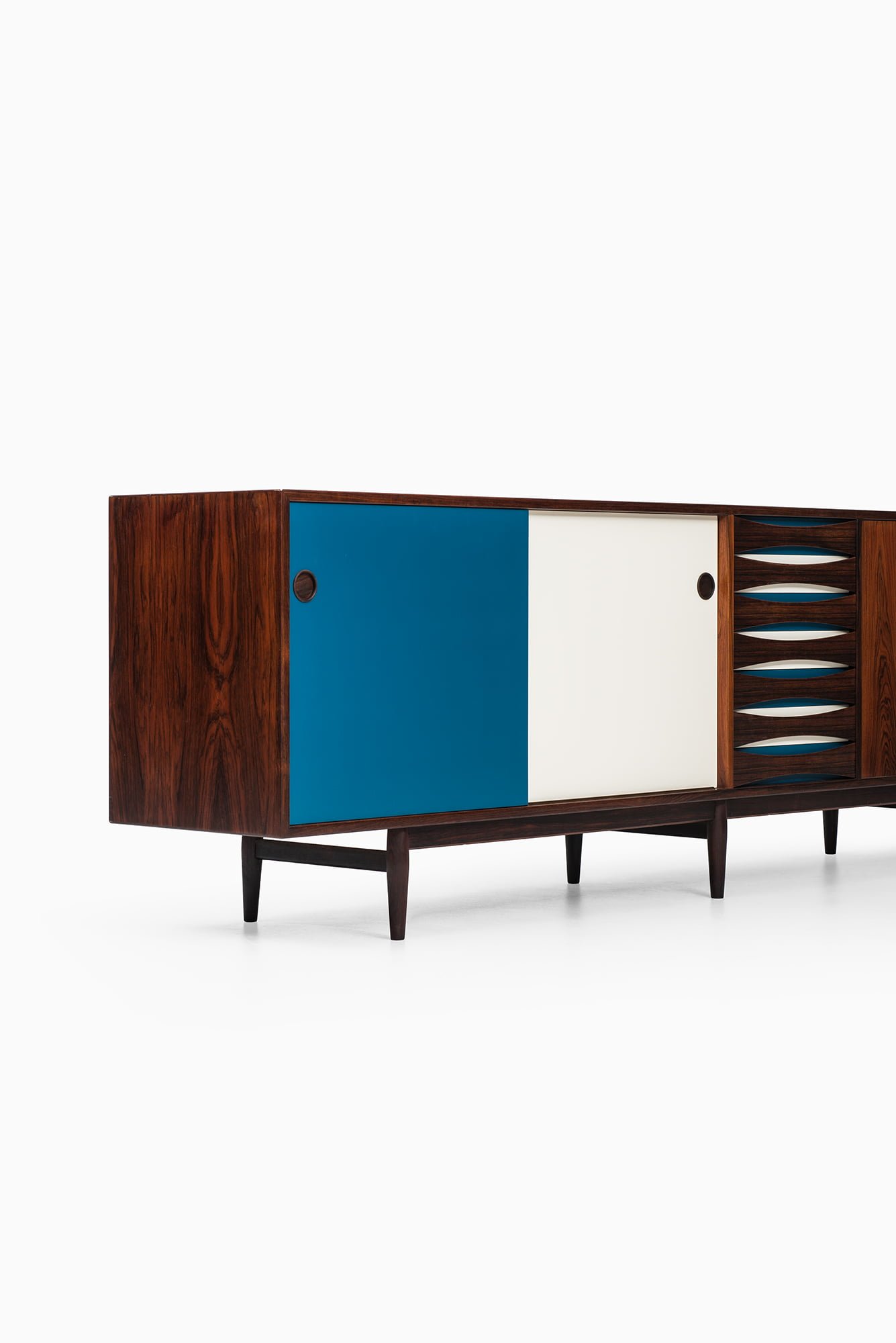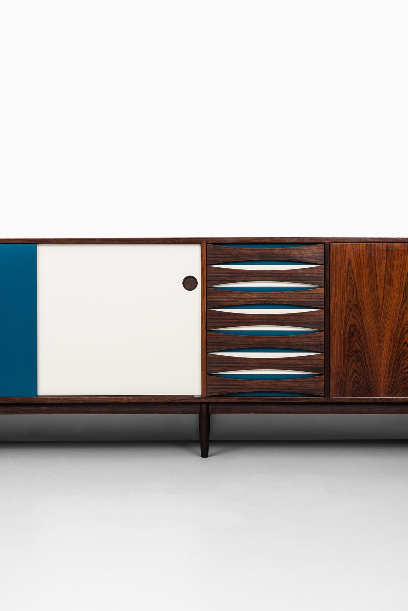 This is an exceptionally rare sideboard, model 29A, designed by Arne Vodder and produced by Sibast Møbelfabrik in Denmark during the 1950s. The piece is executed in highly figured Brazilian rosewood, which displays dramatic grain patterns throughout the front, sides, and top surface. The cabinet is complemented by sliding doors in white and blue formica, creating a striking contrast with the warm, dark tones of the rosewood. The combination of wood and color blocking is a hallmark of Vodder’s work, emphasizing his interest in playful yet functional modern design.