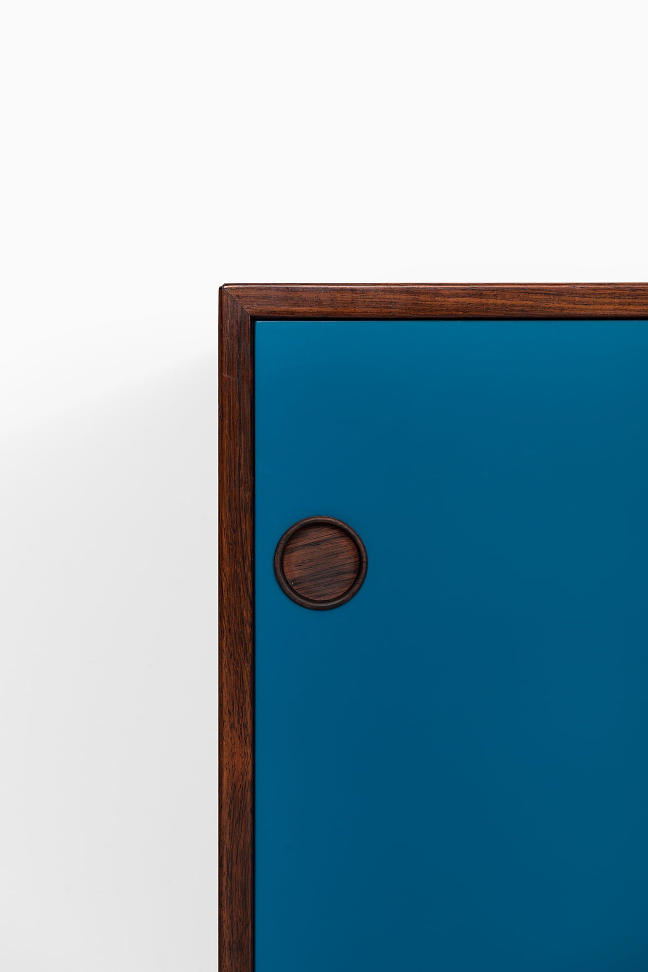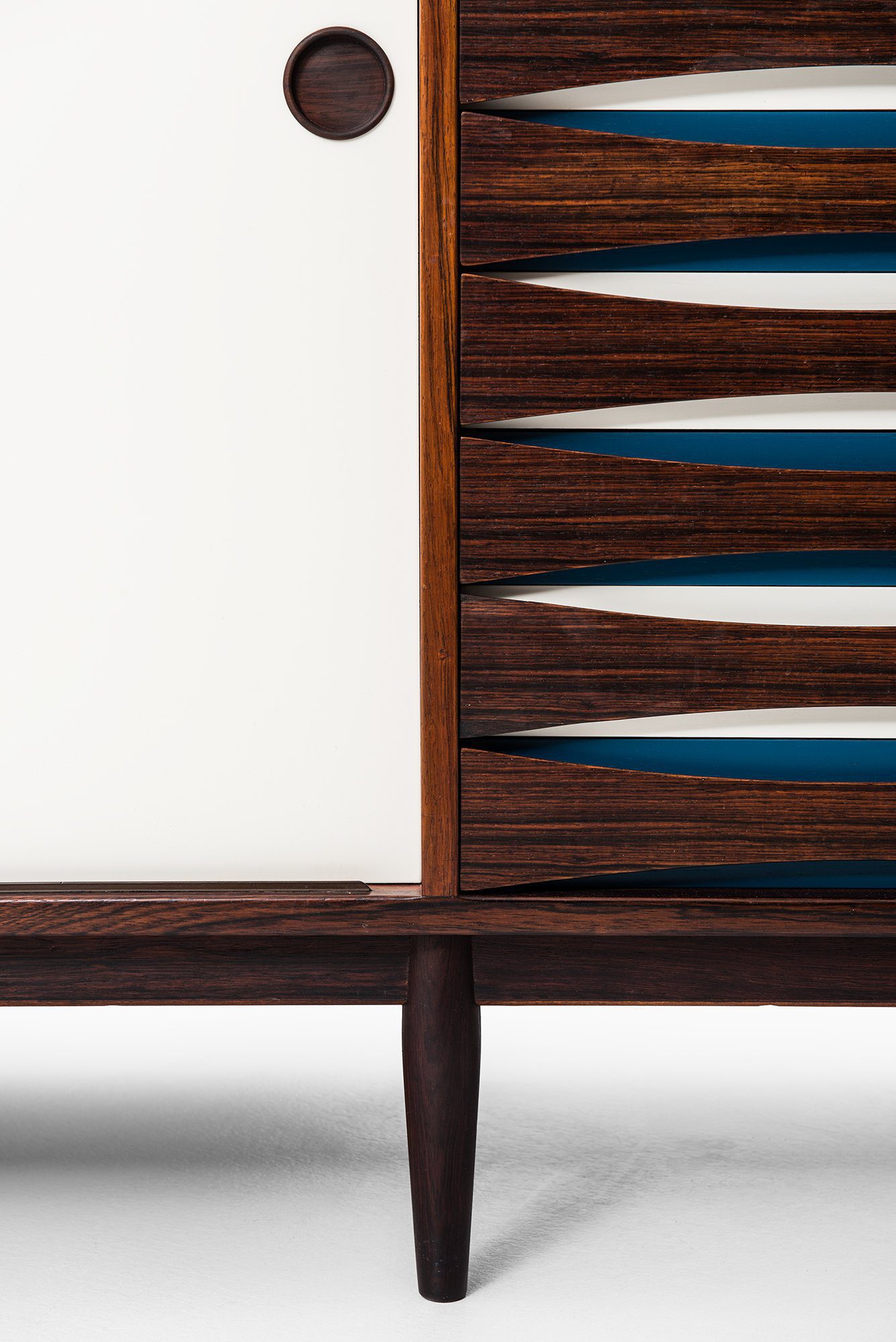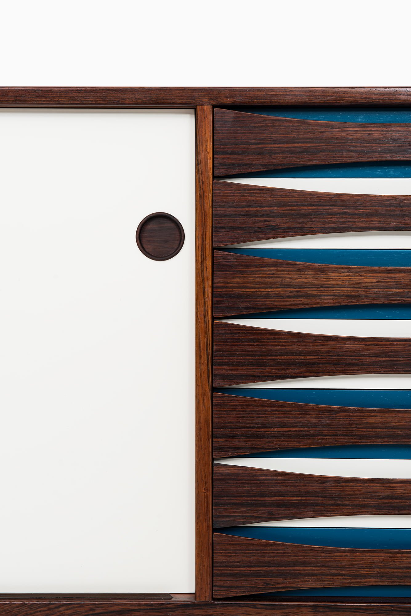 This is an exceptionally rare sideboard, model 29A, designed by Arne Vodder and produced by Sibast Møbelfabrik in Denmark during the 1950s. The piece is executed in highly figured Brazilian rosewood, which displays dramatic grain patterns throughout the front, sides, and top surface. The cabinet is complemented by sliding doors in white and blue formica, creating a striking contrast with the warm, dark tones of the rosewood. The combination of wood and color blocking is a hallmark of Vodder’s work, emphasizing his interest in playful yet functional modern design.