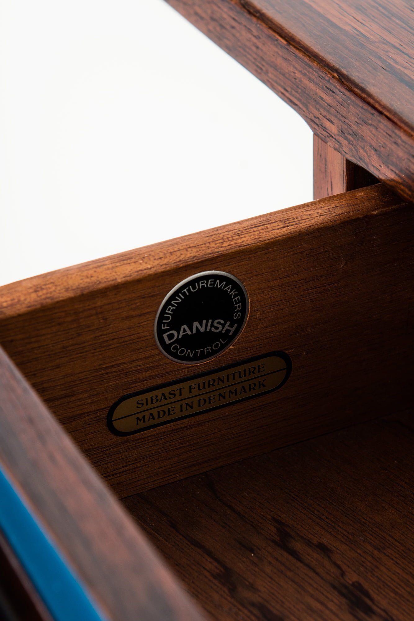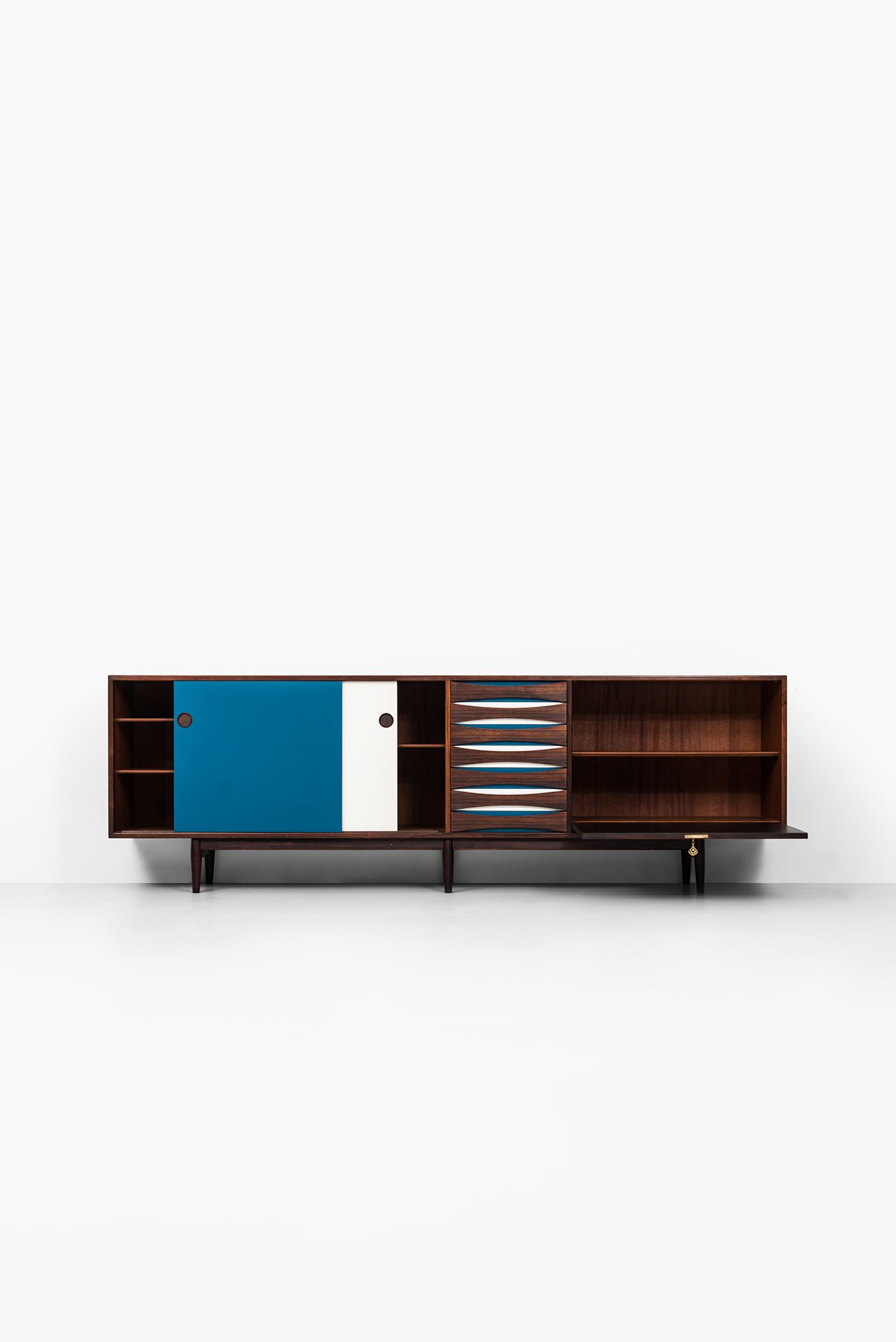 The sideboard is divided into three sections: a sliding door cabinet with adjustable shelves, a bank of drawers with sculpted rosewood pulls revealing blue lacquered interiors, and a hinged bar cabinet with a drop-down door. The long, low profile of the cabinet rests on tapered legs connected by stretchers, providing both stability and a light, elevated appearance. The craftsmanship is typical of Sibast’s production, with attention to detail in joinery, veneering, and interior finishing.
