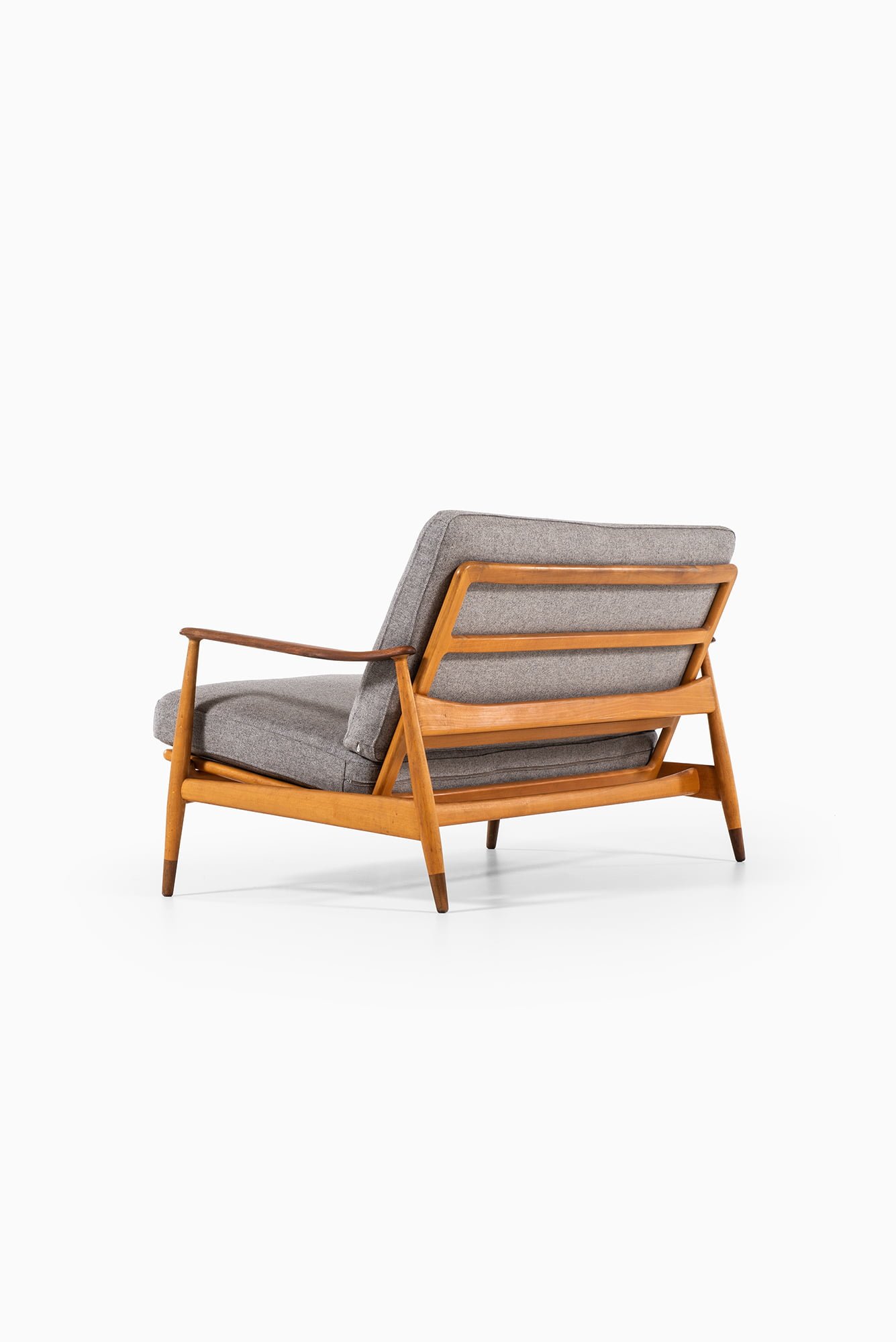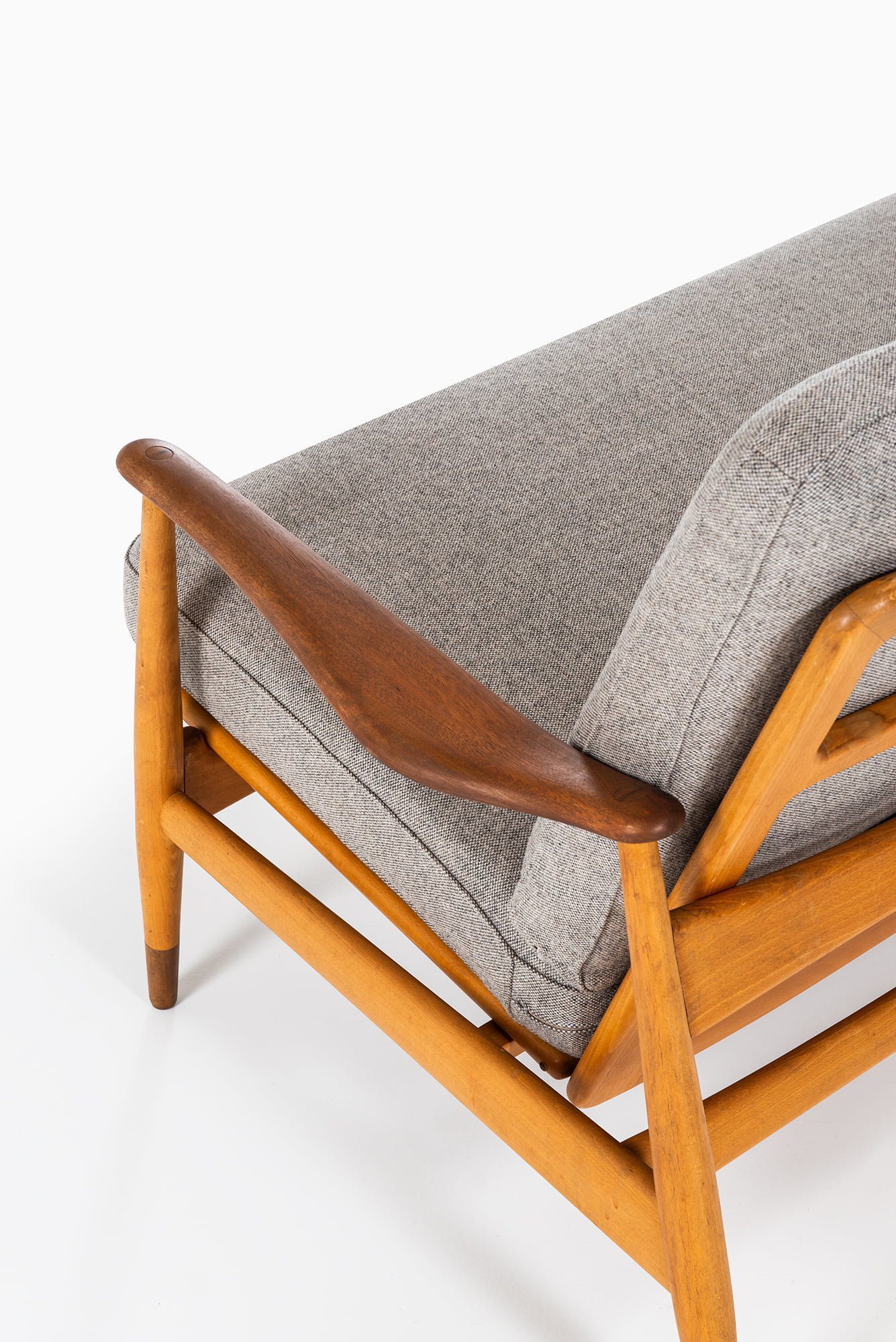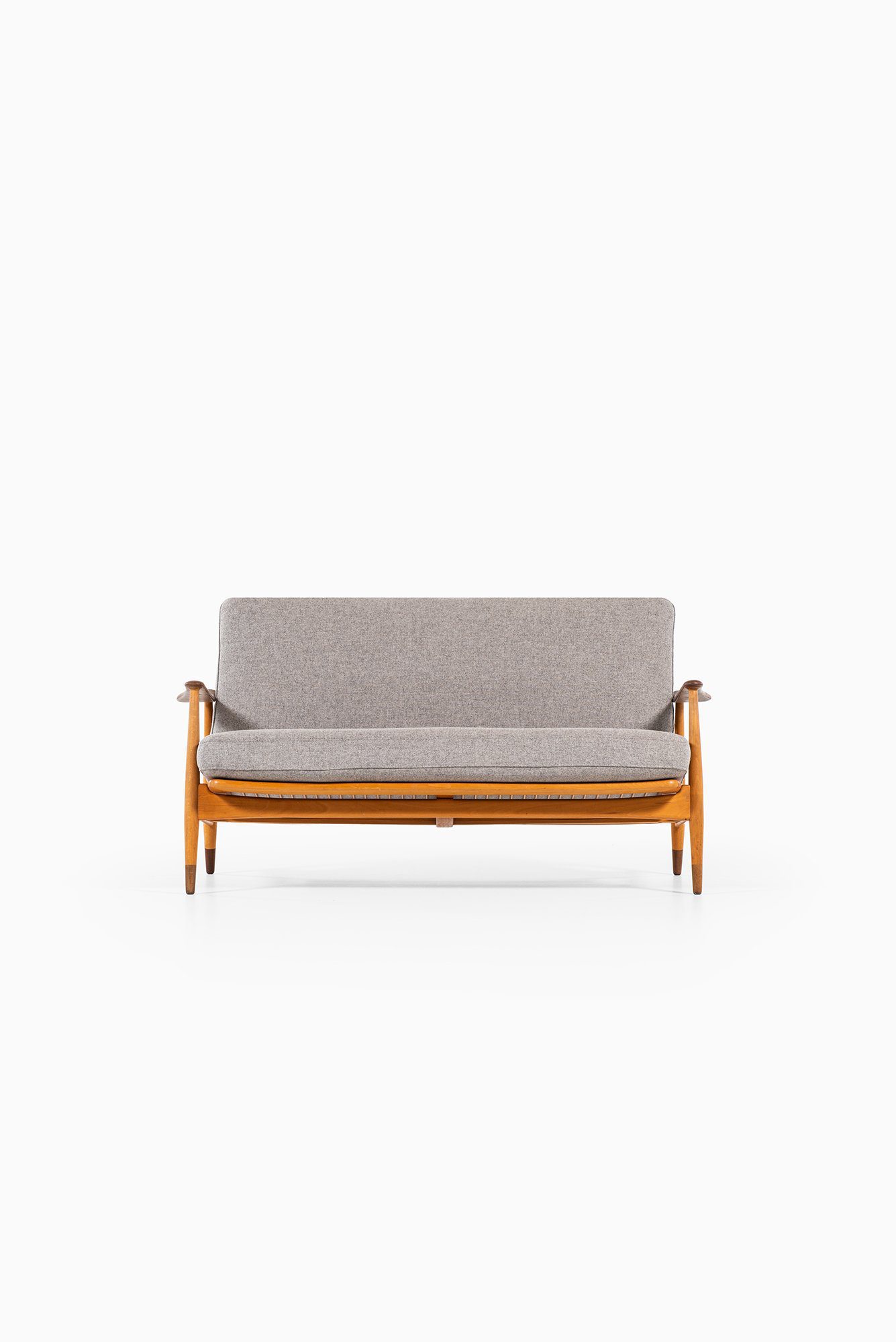 This rare two-seat sofa was designed by Arne Vodder and produced by France & Daverkosen in Denmark during the 1950s. The piece is a refined example of Danish modern furniture, showcasing Vodder’s characteristic sense of proportion, craftsmanship, and understated elegance. The frame is constructed in solid beech with sculpted teak armrests, and the seat and back cushions have been newly reupholstered in a fine grey wool fabric that complements the warm tone of the wood.