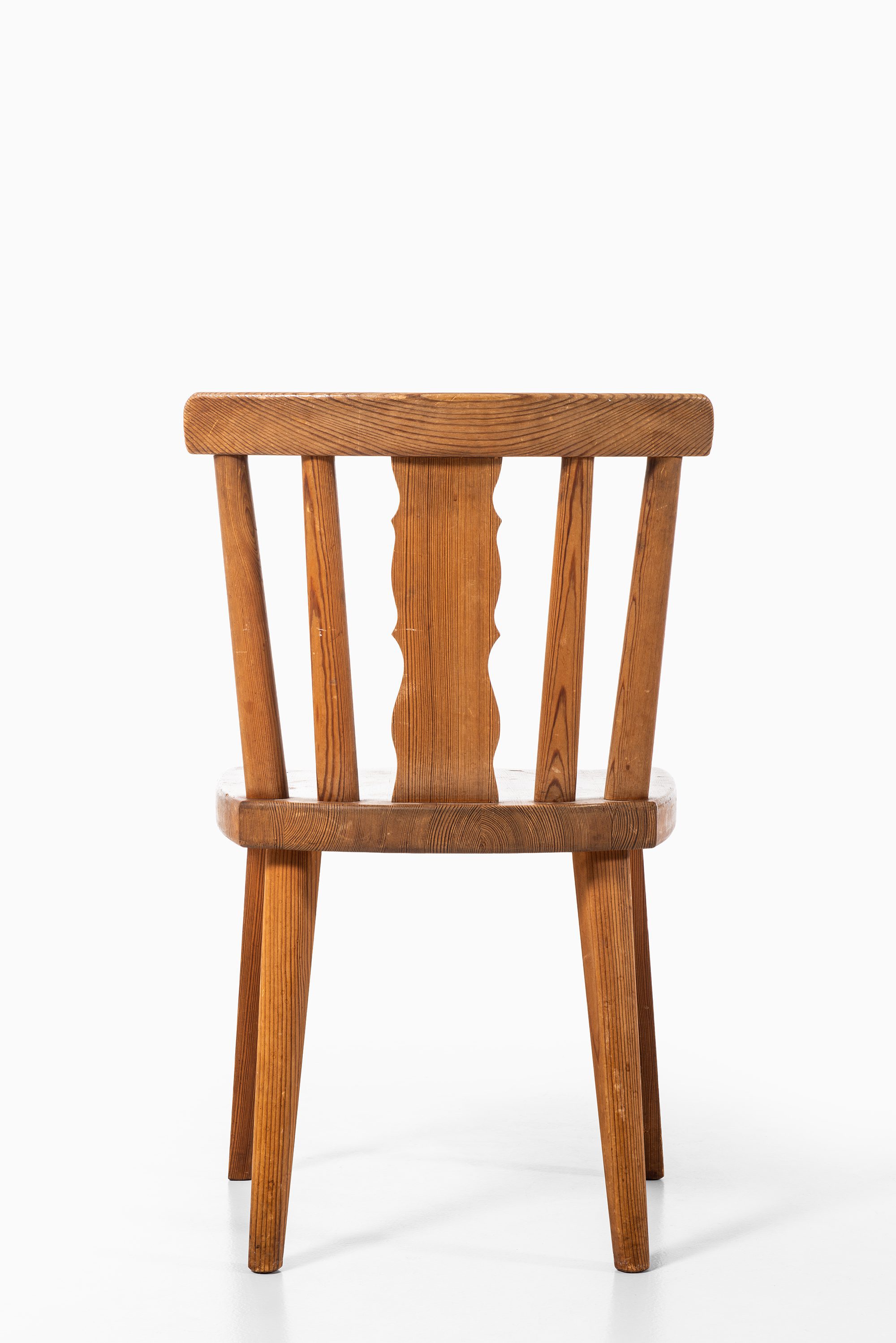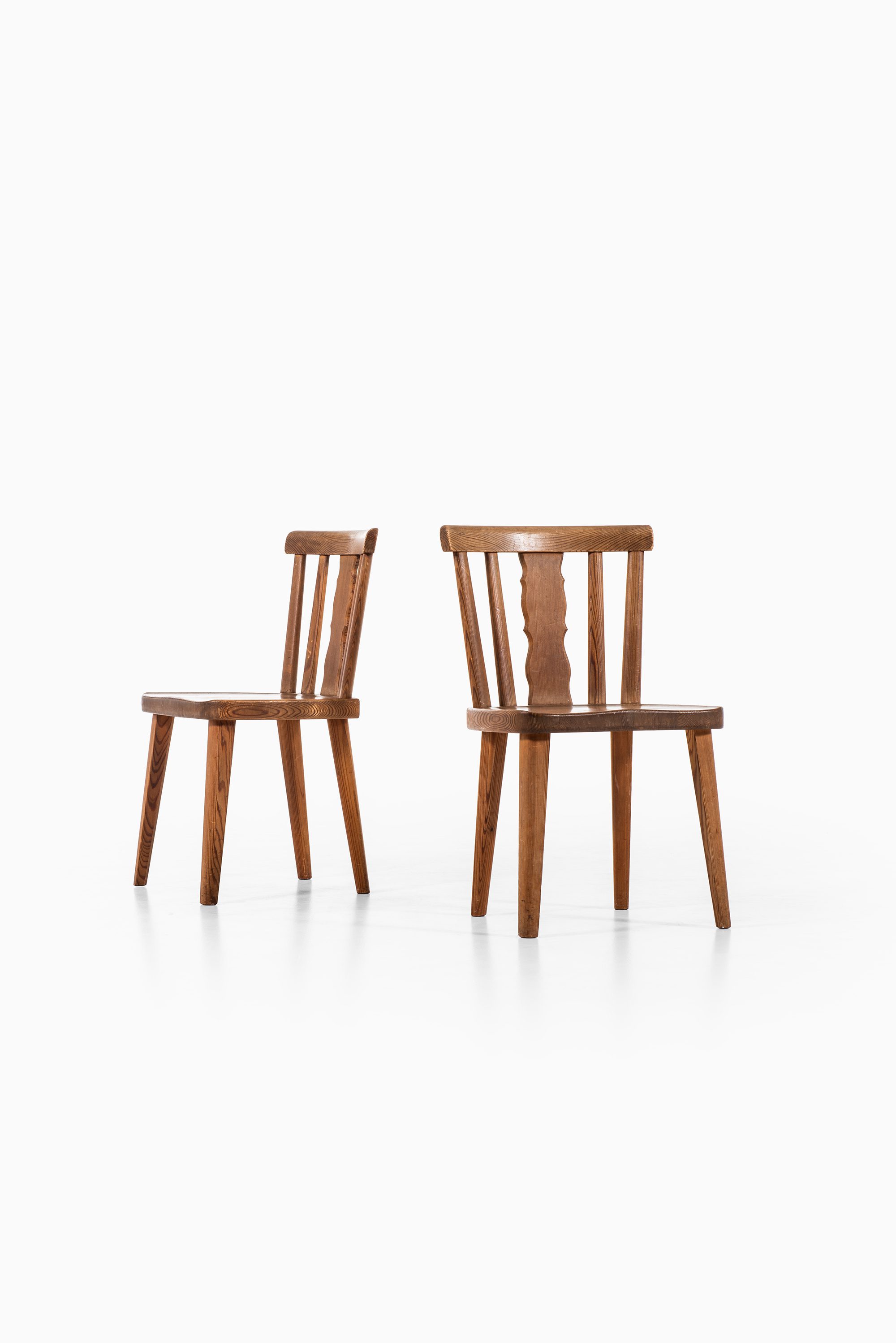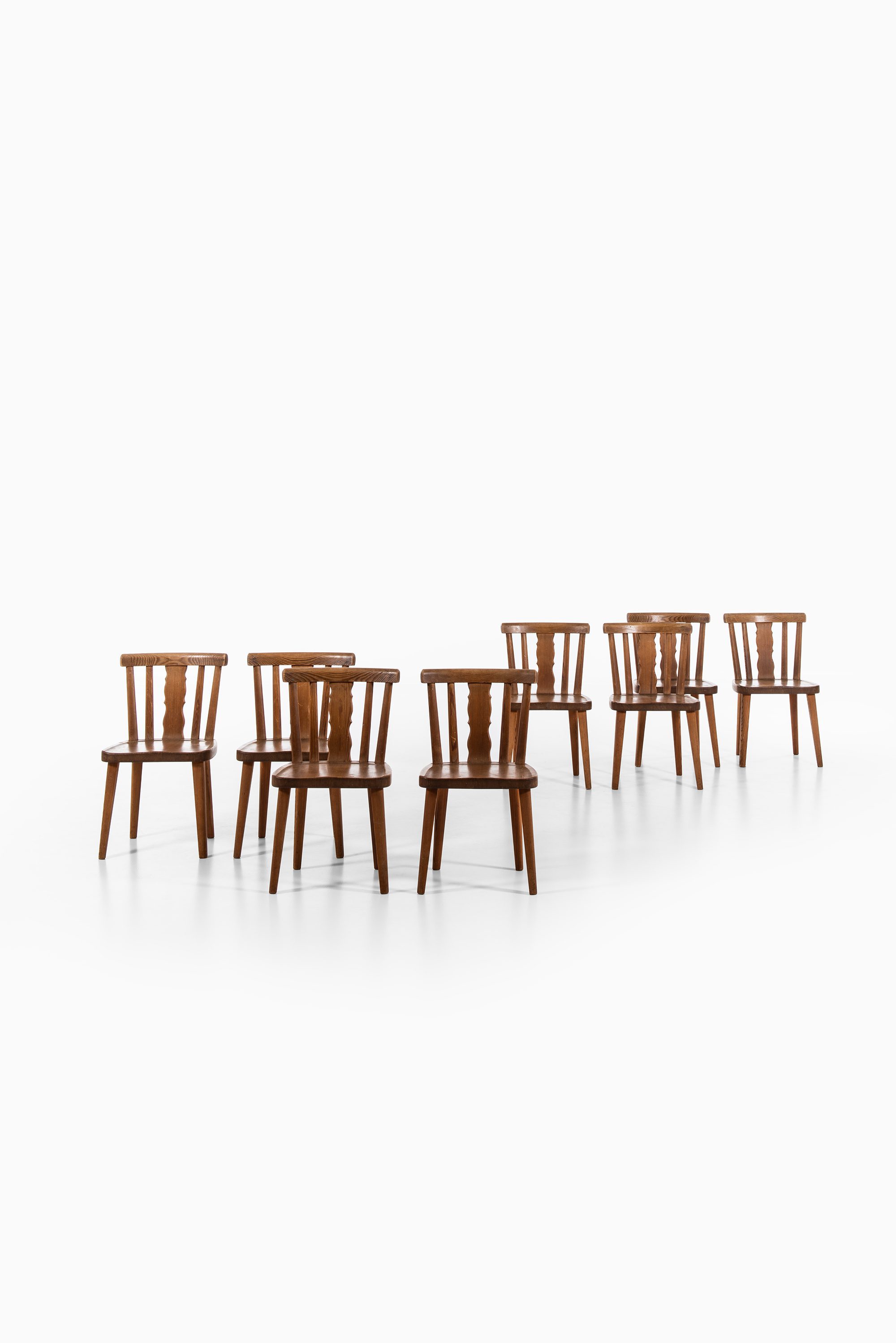 This rare set of eight dining chairs is attributed to the Swedish designer Axel Einar Hjorth and was produced by Bodafors in Sweden during the 1930s. The chairs are executed in acid-stained pine, a material and finish often associated with Hjorth’s designs of the period, particularly those connected to his functional and rustic modernist approach. The craftsmanship reflects the balance between robust construction and simple, practical forms that defined much of Hjorth’s furniture.