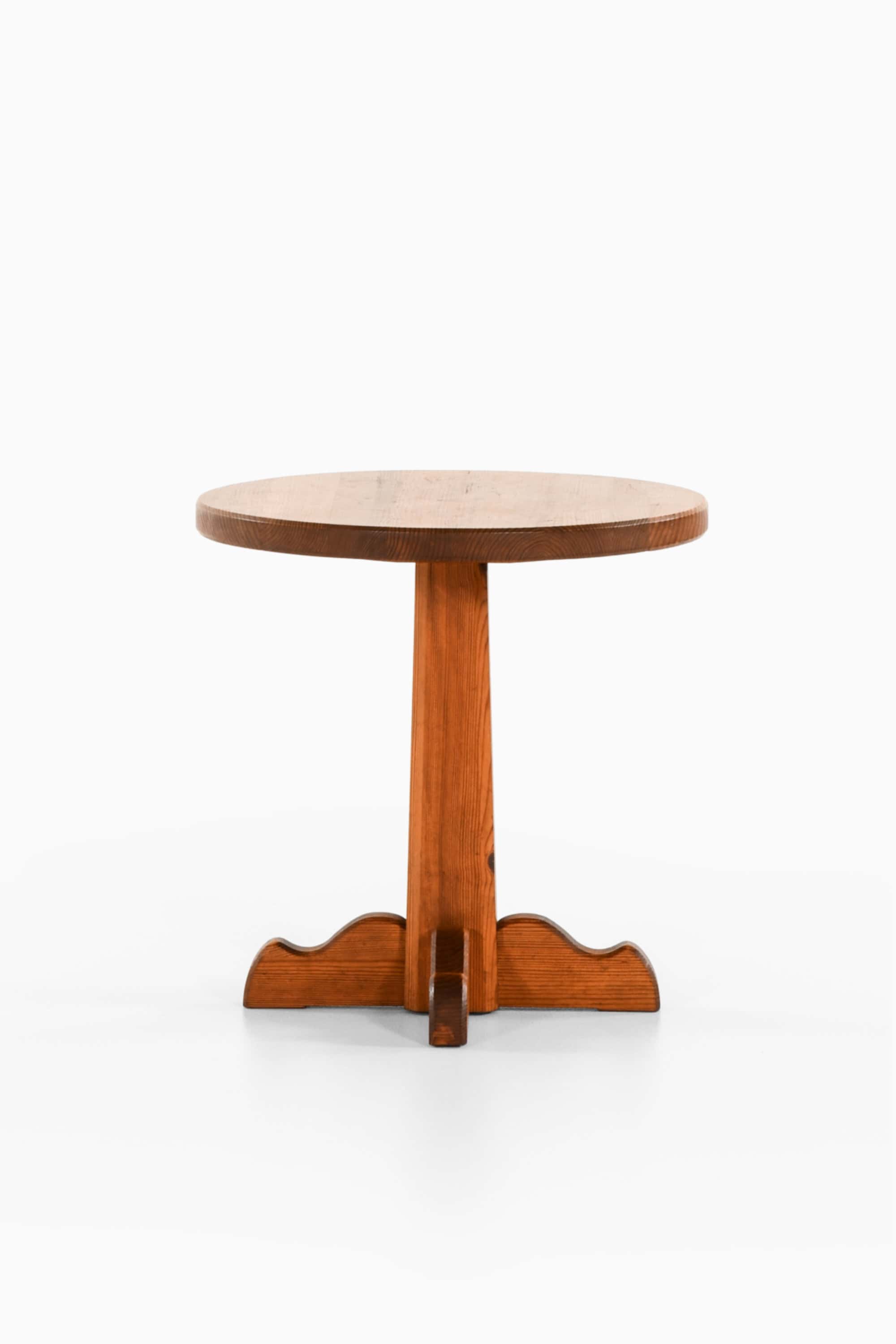 This round table, model Lovö, is attributed to Axel Einar Hjorth and was produced by Nordiska Kompaniet in 1939. The table is executed in acid-stained pine, a material and finish characteristic of Hjorth’s furniture for the Sportstugemöbler series. The tabletop is composed of solid pine boards with visible annual rings and natural knots, giving the surface an organic and textured appearance. The acid staining brings out the grain and creates warm tonal variations across the wood.