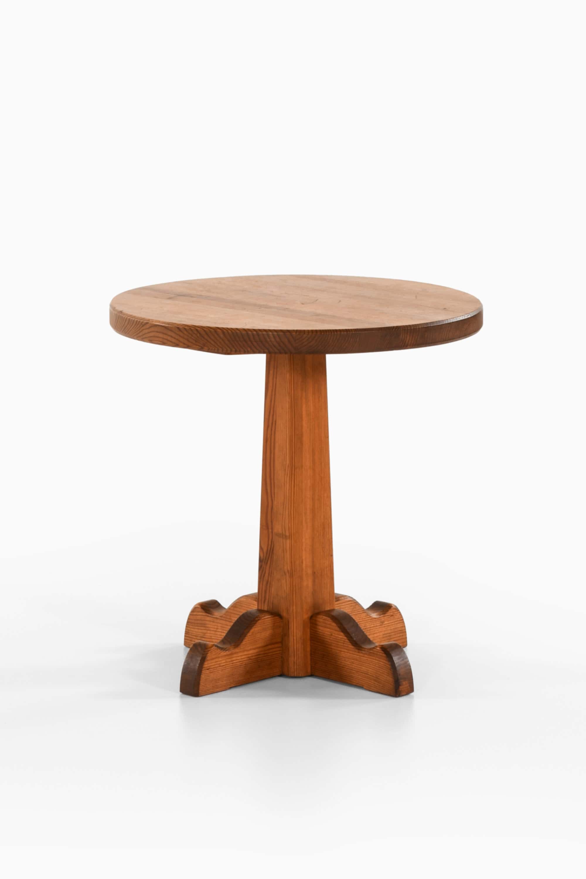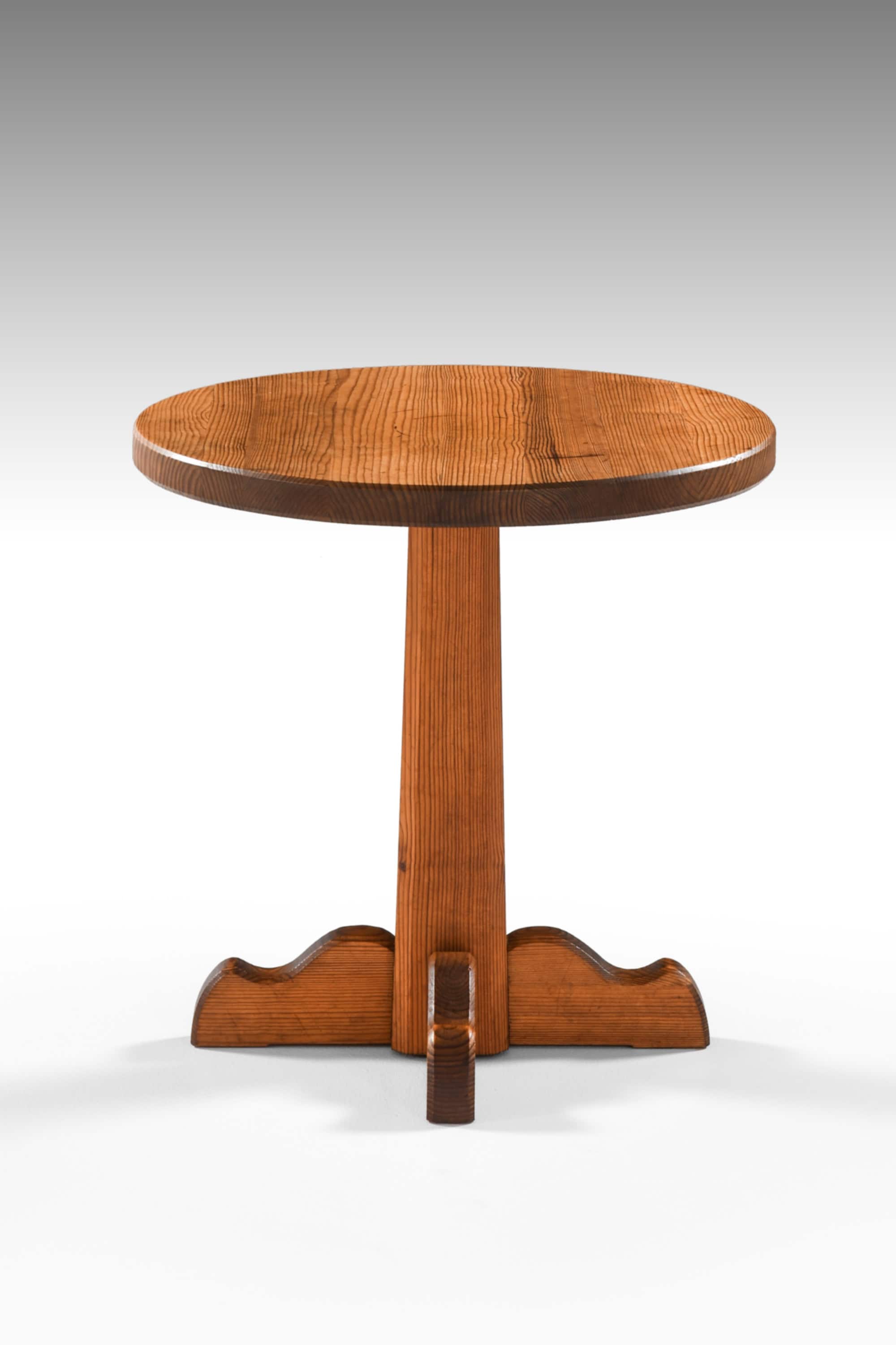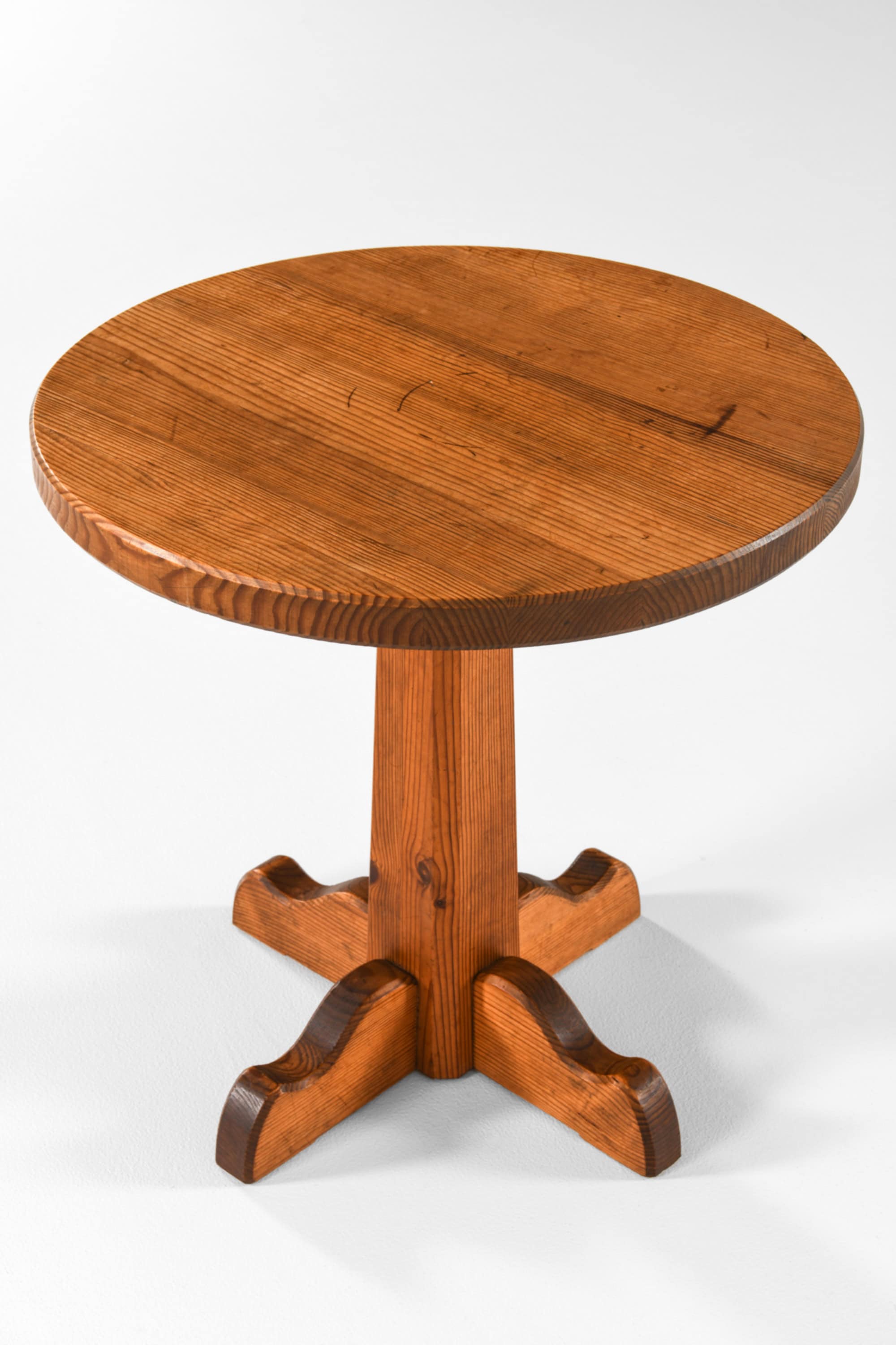Axel Einar Hjorth designed the Sportstugemöbler collection in the 1930s for Swedish weekend cottages and holiday homes. These pieces combined traditional rural influences with modernist clarity, often using rustic pine in bold, architectural forms. The Lovö model exemplifies this synthesis, with its minimal structure, robust materials, and decorative shaping at the base. The table reflects Hjorth’s ability to merge functional furniture with expressive craftsmanship.