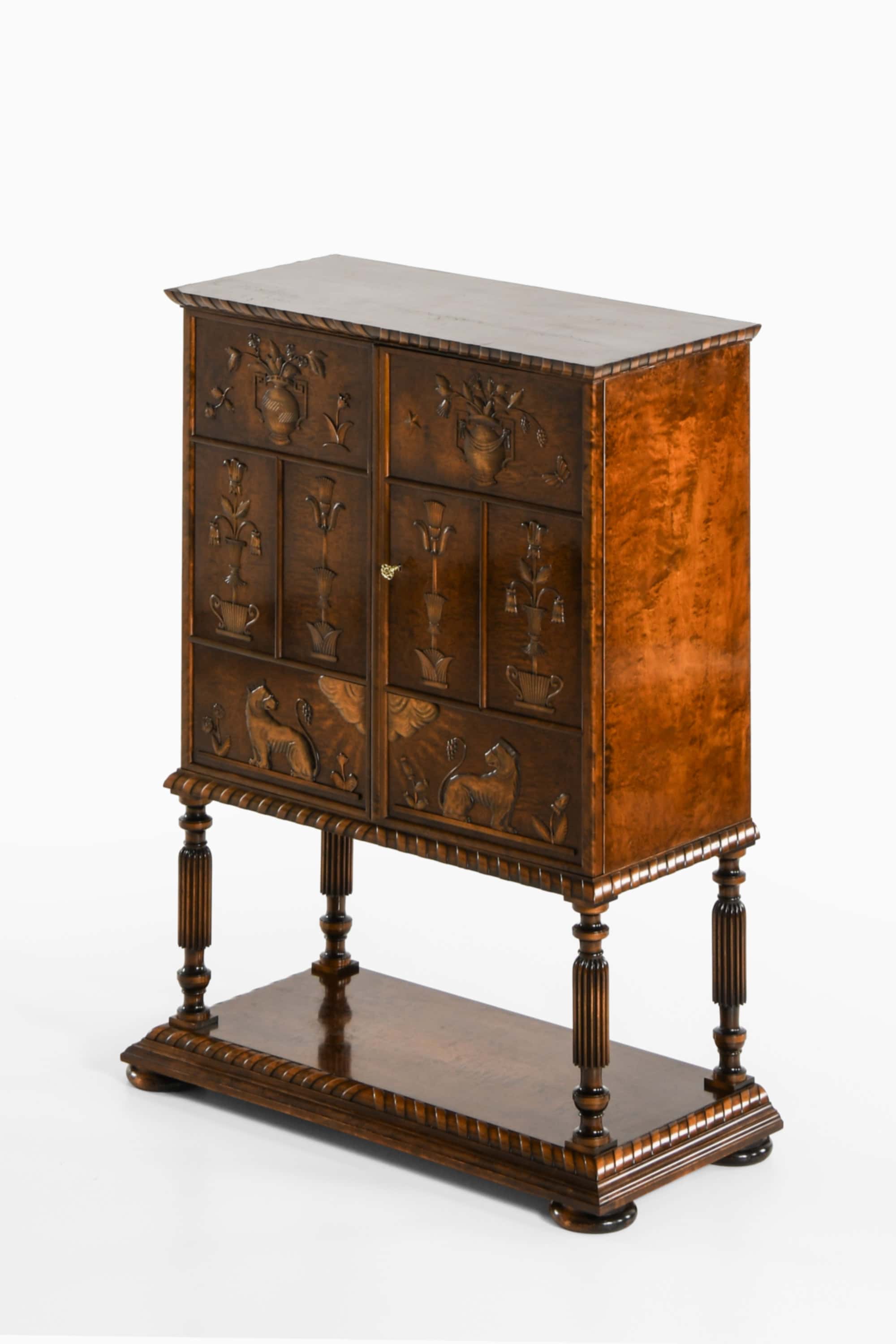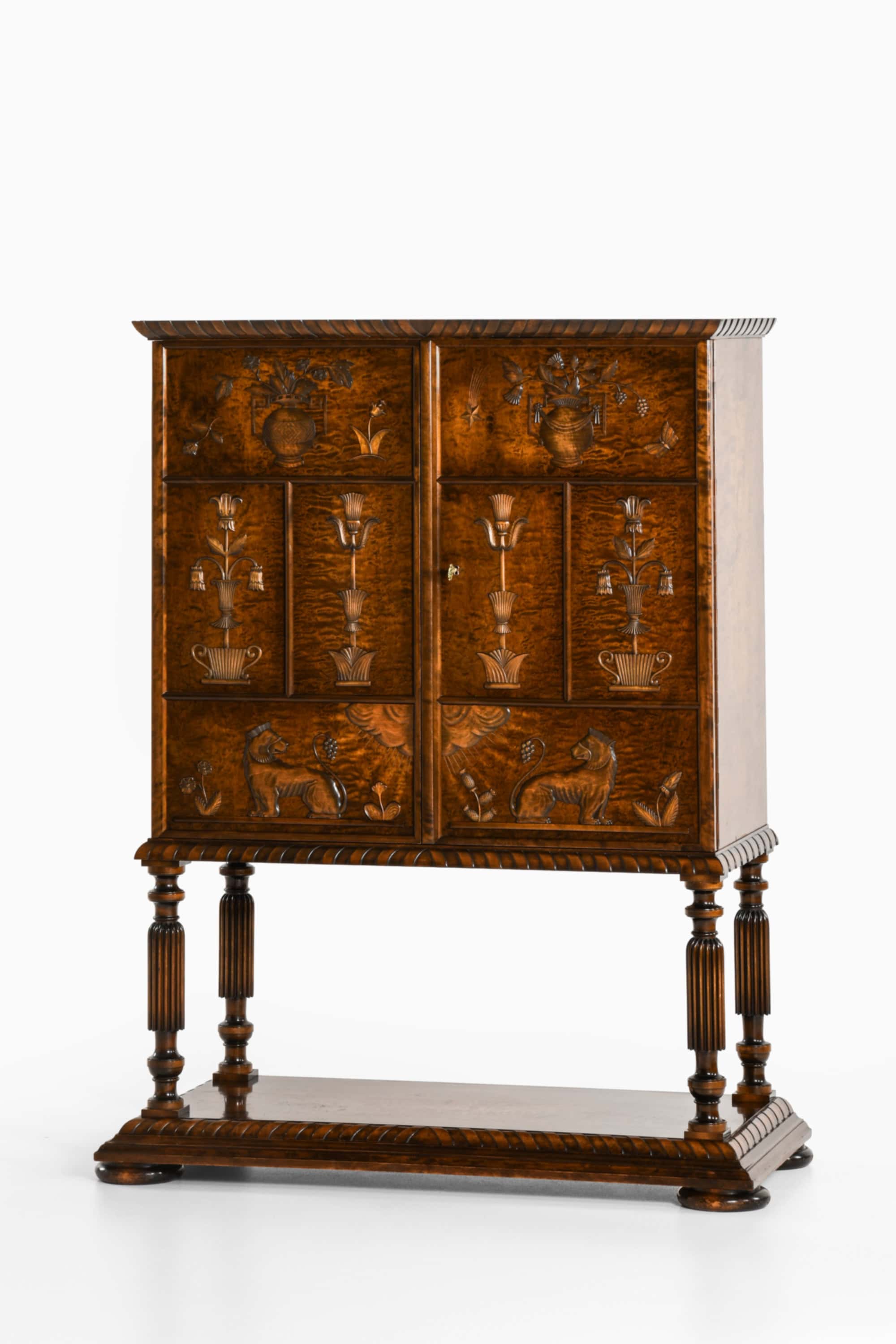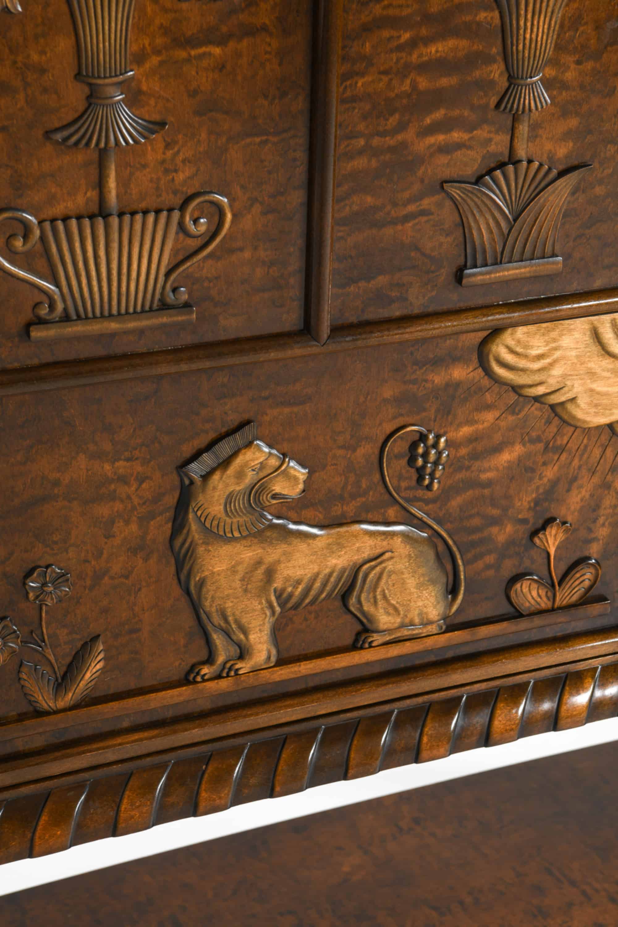 Axel Einar Hjorth was one of Sweden’s most significant furniture designers of the early twentieth century. His work from the 1920s often merged classical influences with modern sensibilities, resulting in pieces aligned with the Swedish Grace movement. This cabinet exemplifies that aesthetic through its refined craftsmanship, stylized ornamentation, and harmonious proportions. Swedish Grace furniture is known for its combination of neoclassical form, restrained decoration, and the use of high-quality native woods; this piece demonstrates all of these characteristics.