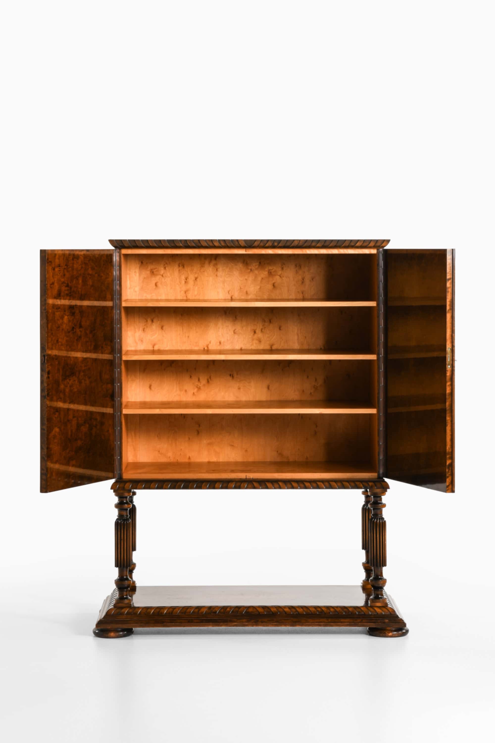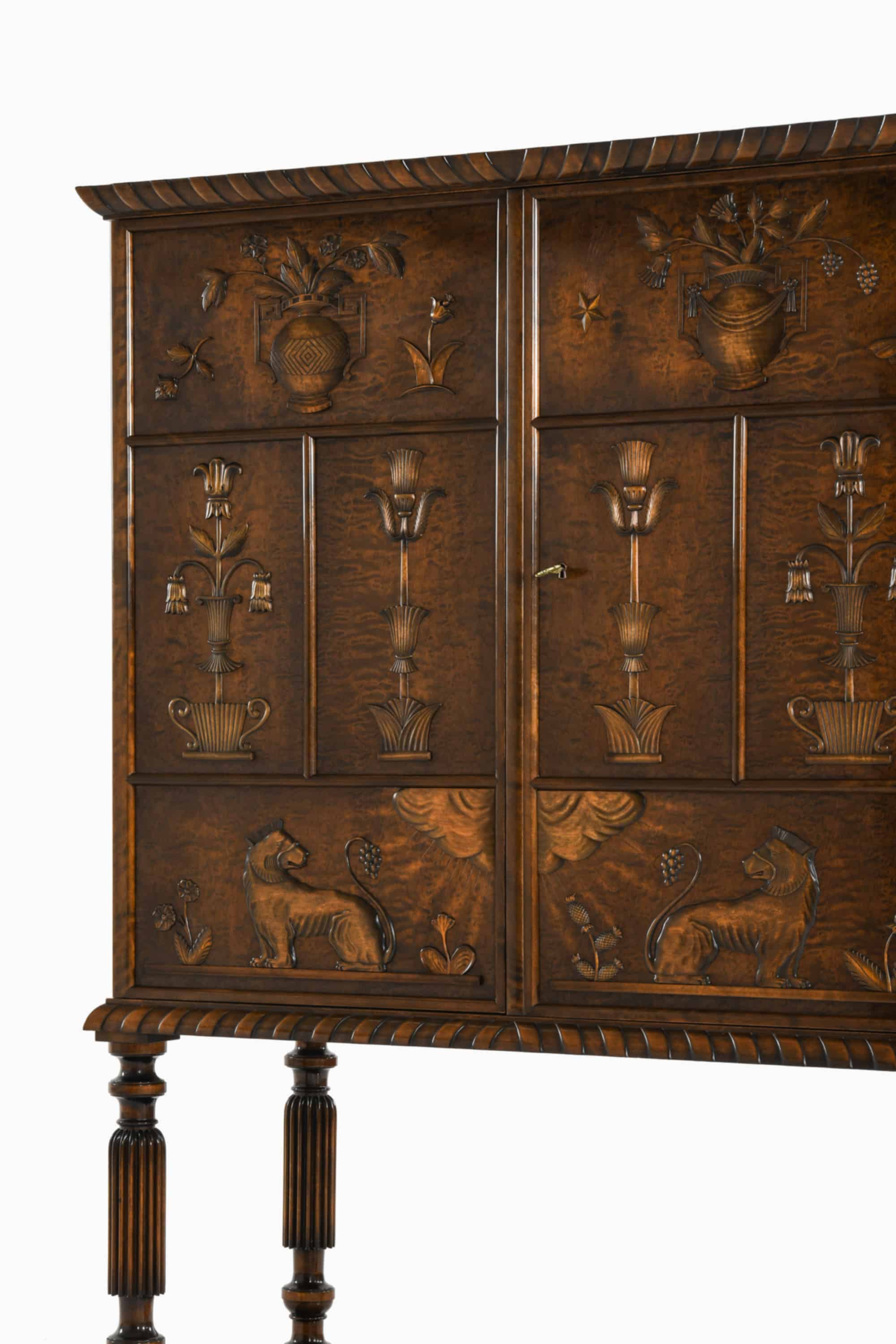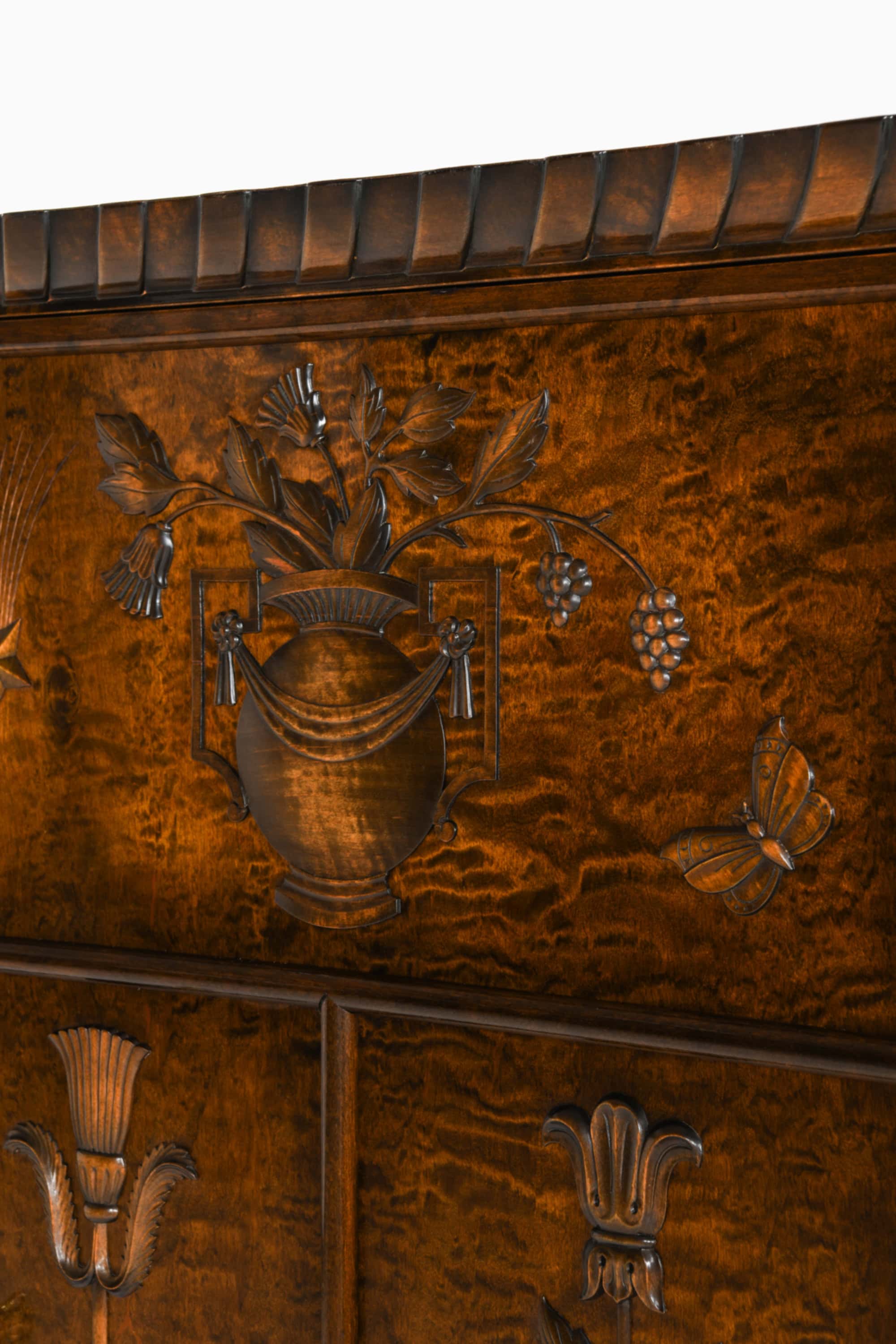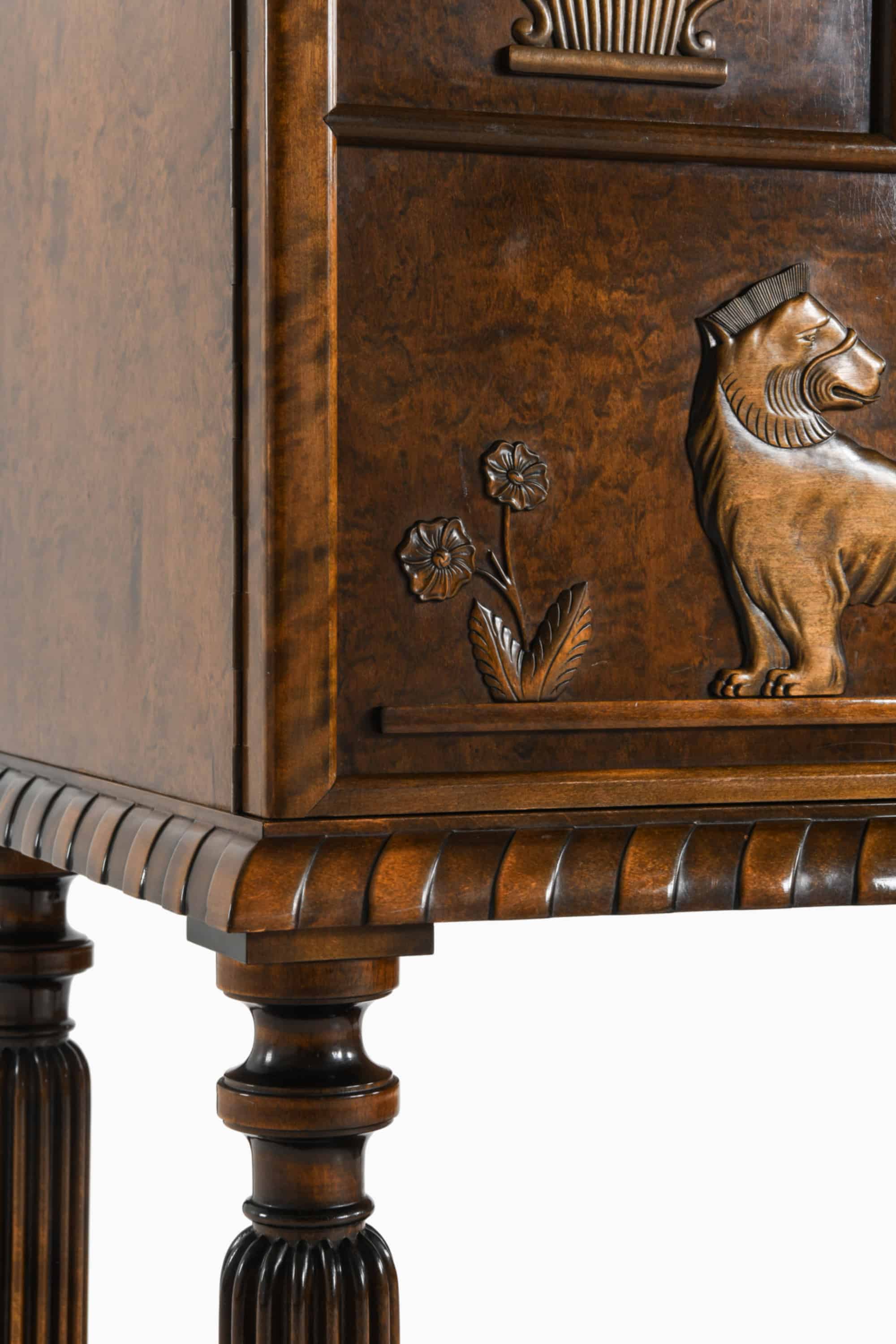 This master cabinet was designed by Axel Einar Hjorth and produced in Sweden during the 1920s. It is executed in richly figured birch with a warm, deep tone that highlights the natural grain patterns characteristic of the material. The cabinet is elevated on a sculptural stand with turned and fluted legs resting on a platform base, creating a balanced architectural composition typical of Swedish Grace furniture.