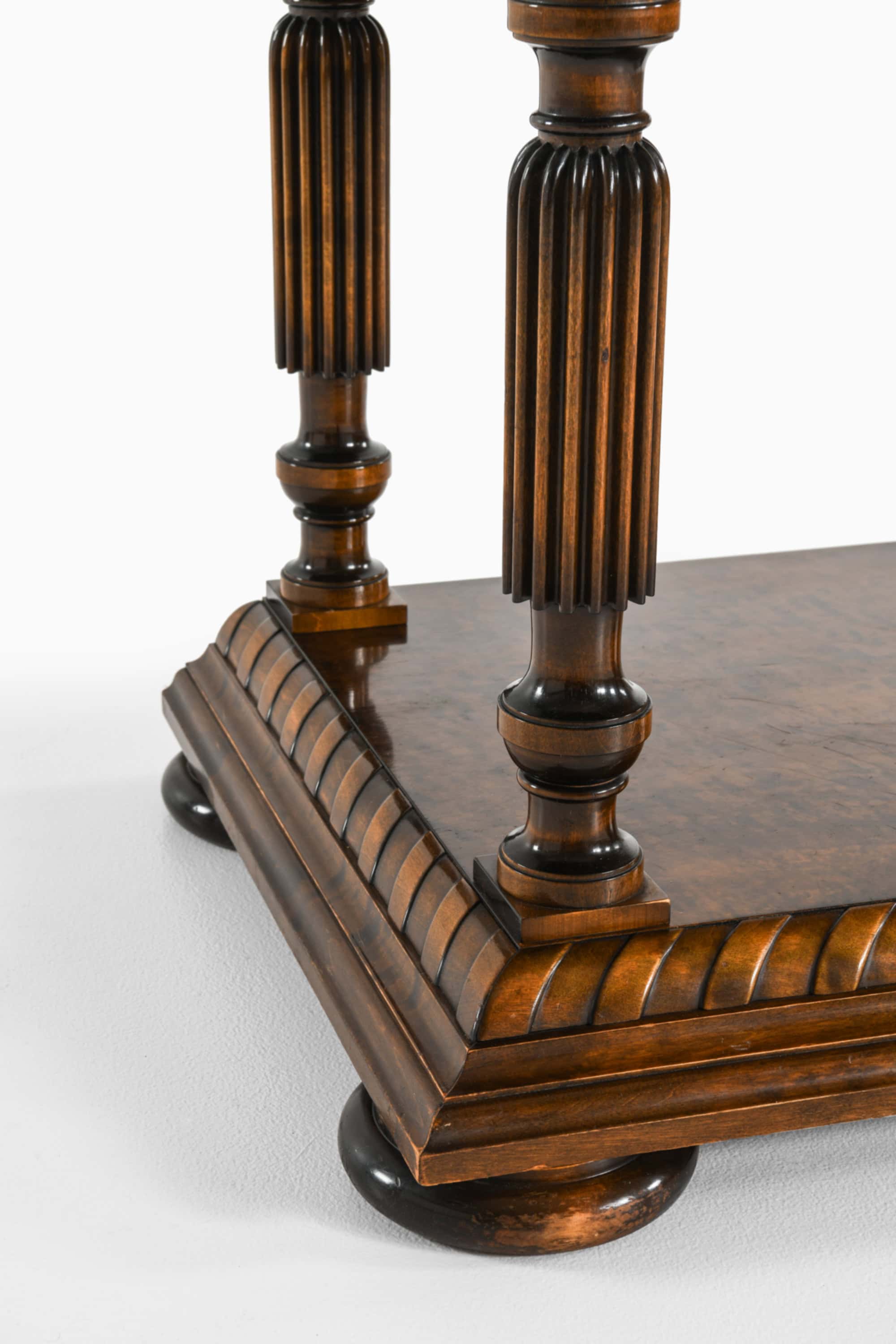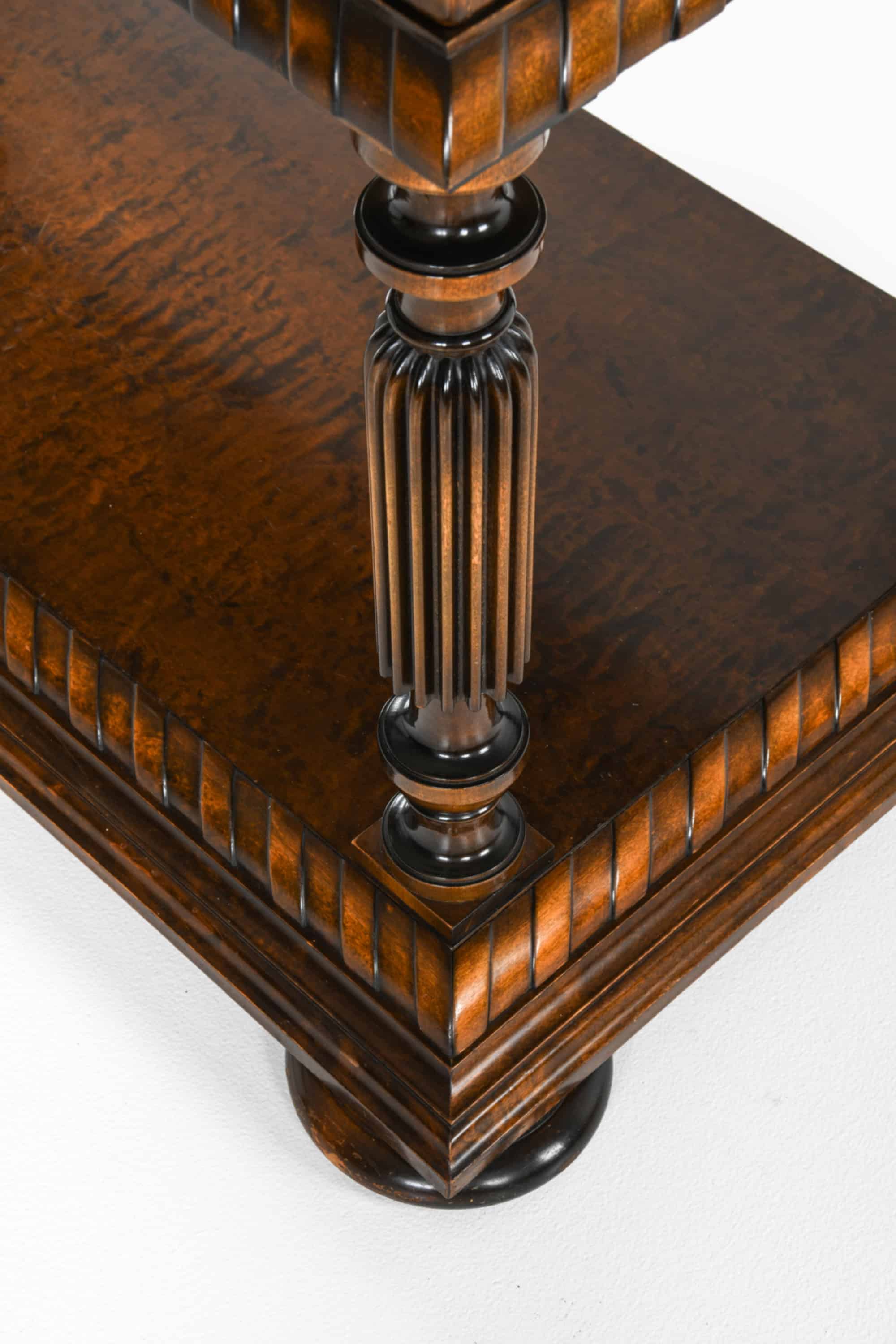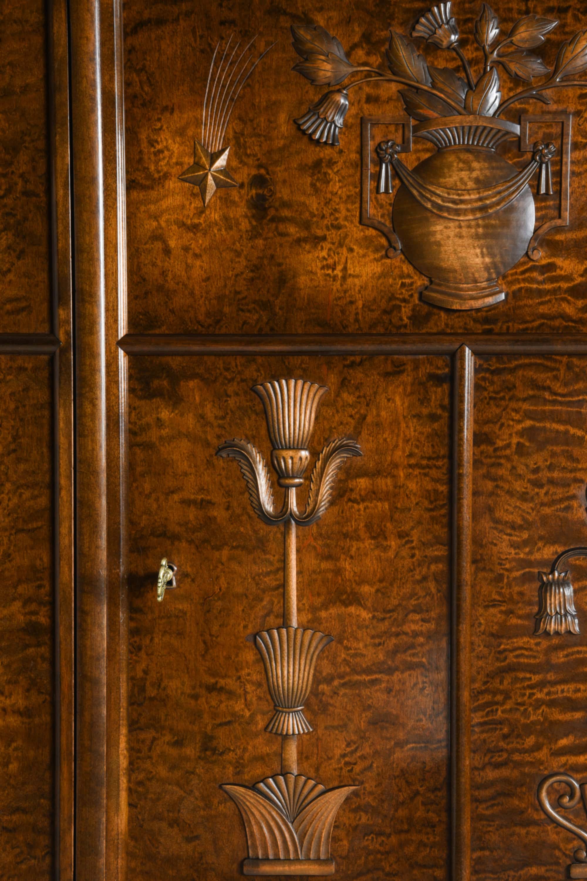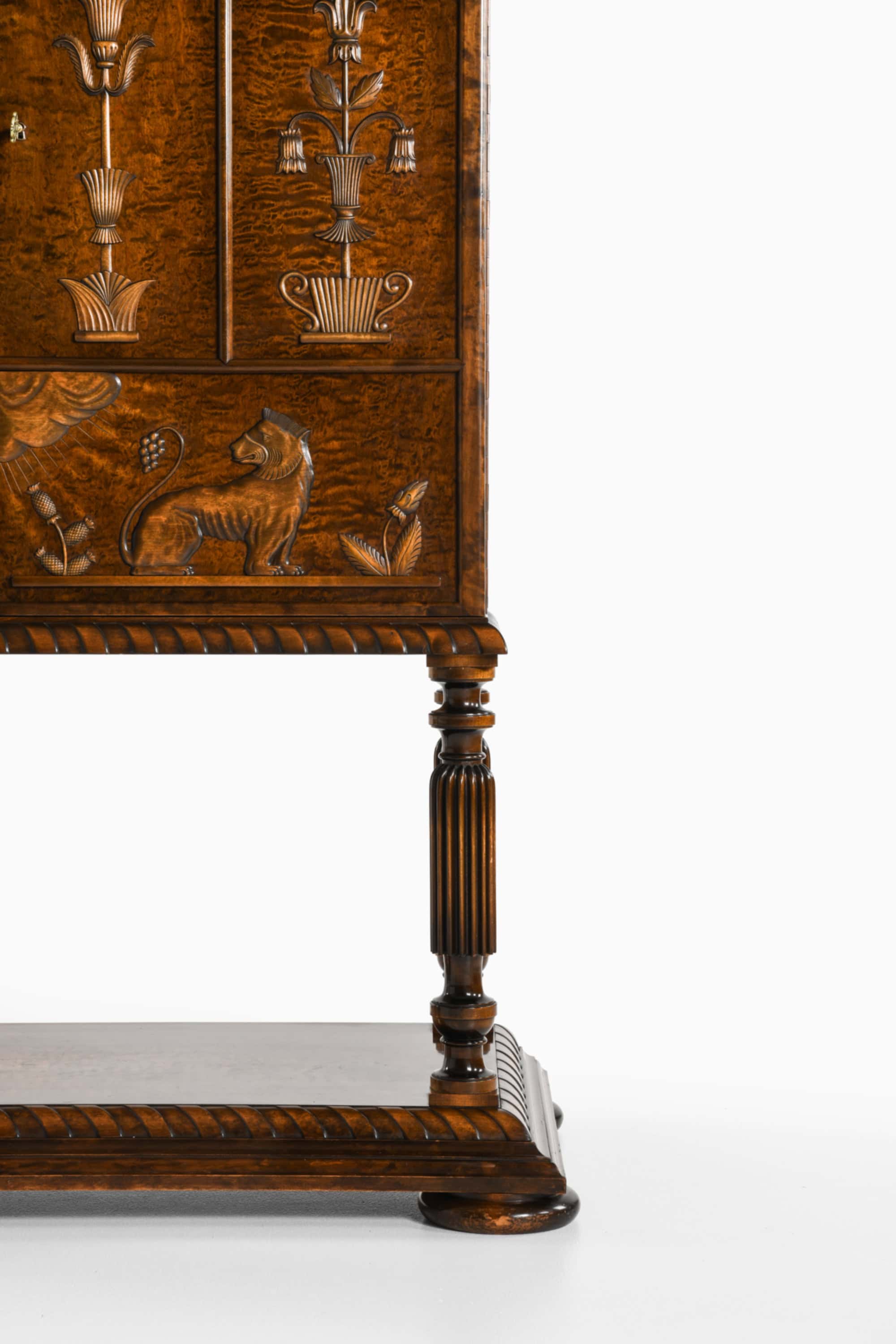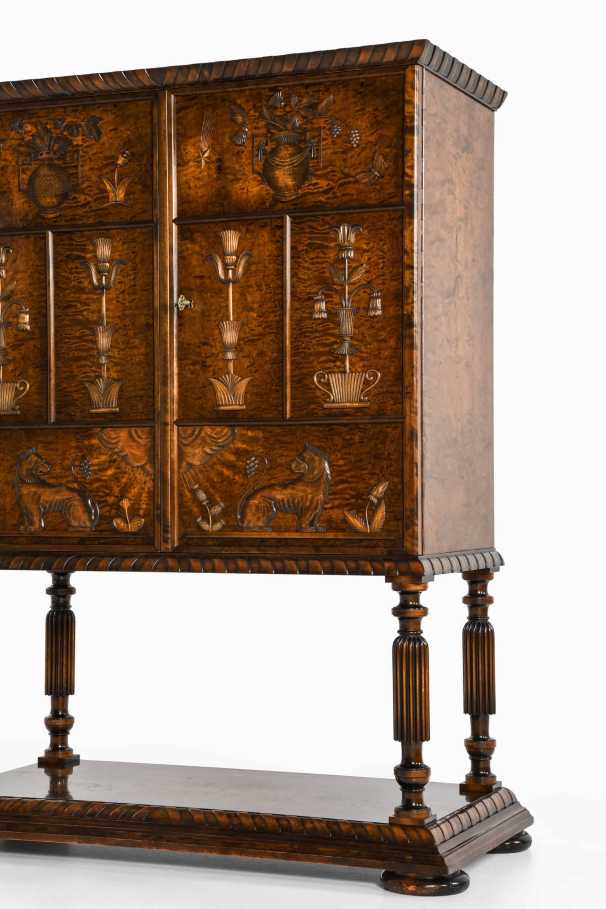 This master cabinet was designed by Axel Einar Hjorth and produced in Sweden during the 1920s. It is executed in richly figured birch with a warm, deep tone that highlights the natural grain patterns characteristic of the material. The cabinet is elevated on a sculptural stand with turned and fluted legs resting on a platform base, creating a balanced architectural composition typical of Swedish Grace furniture.