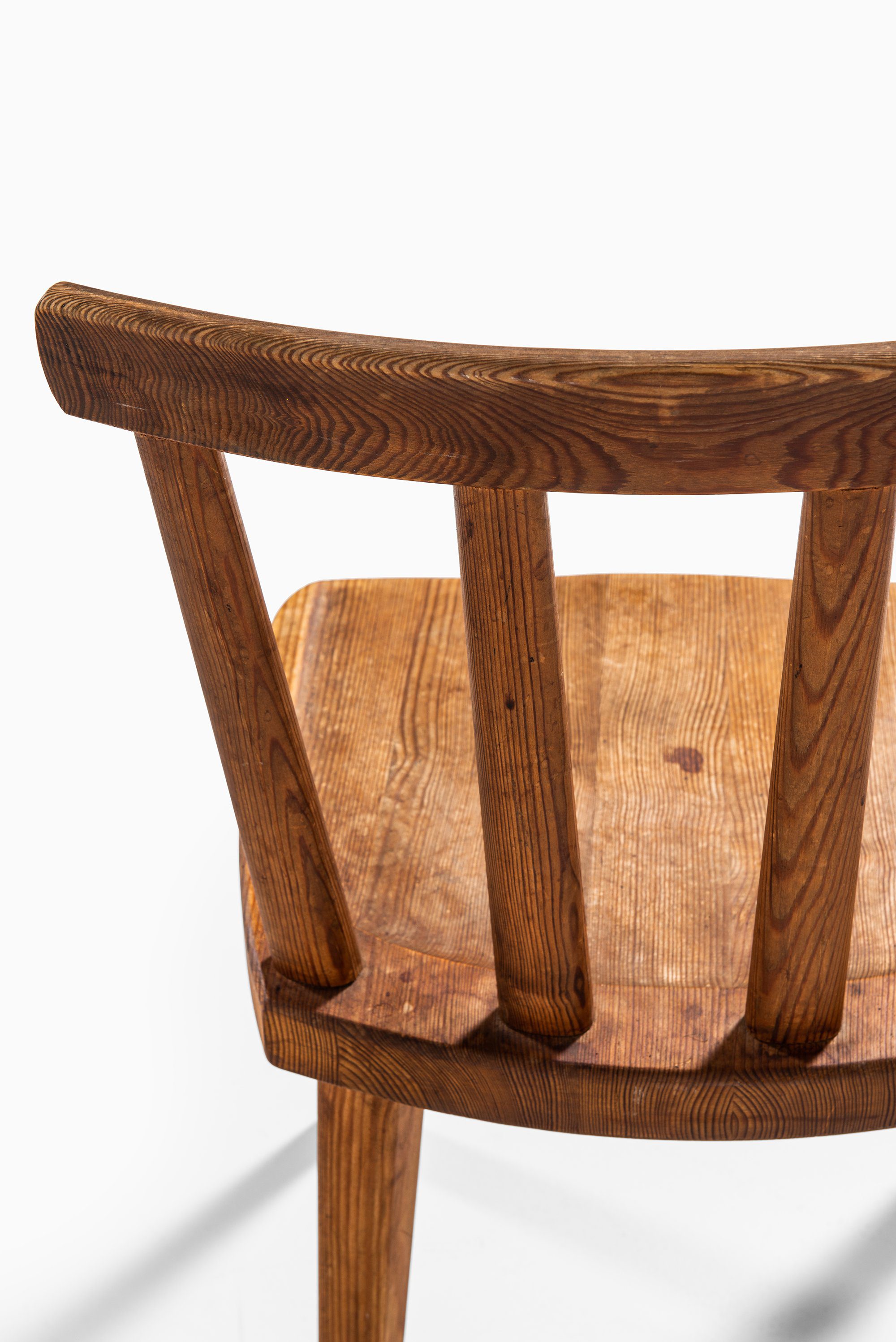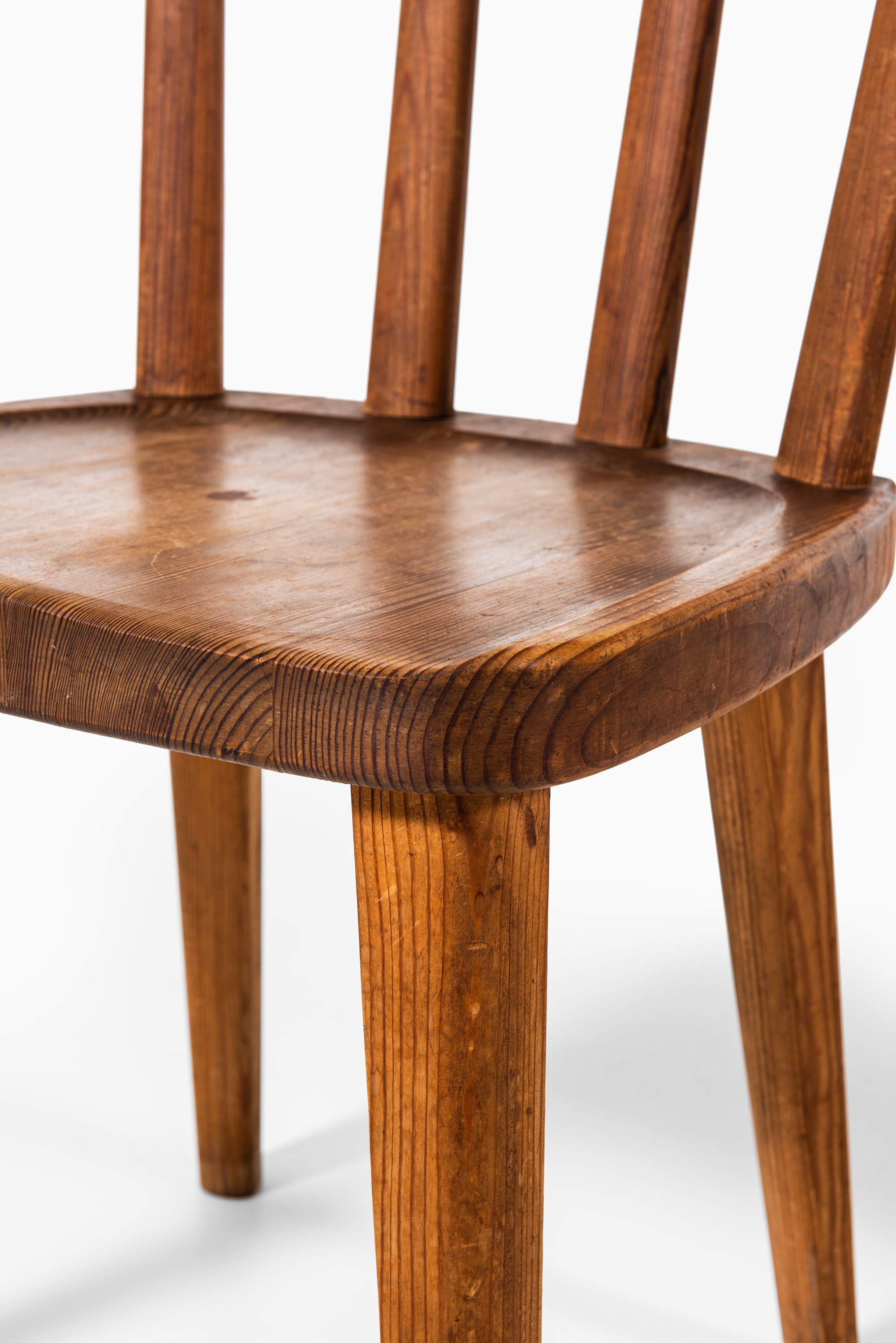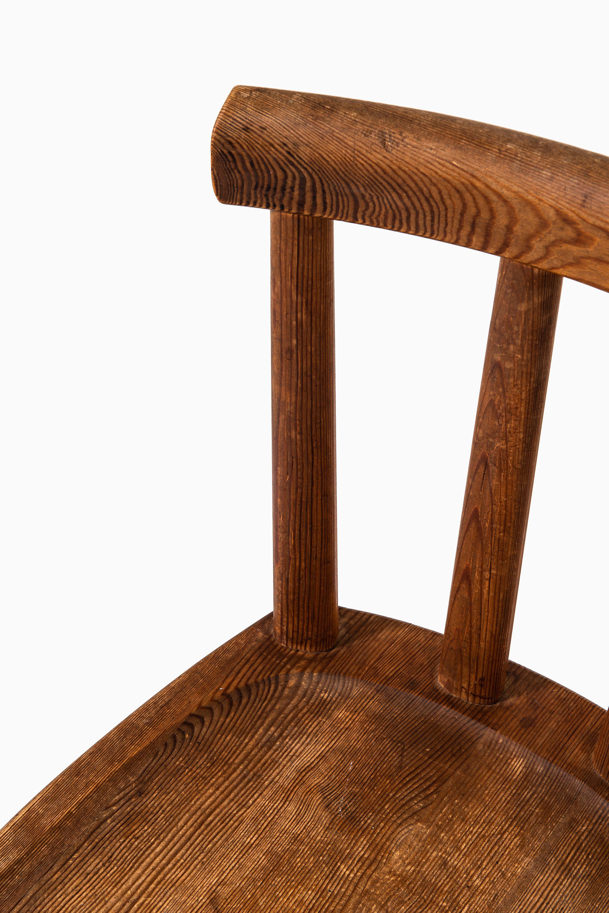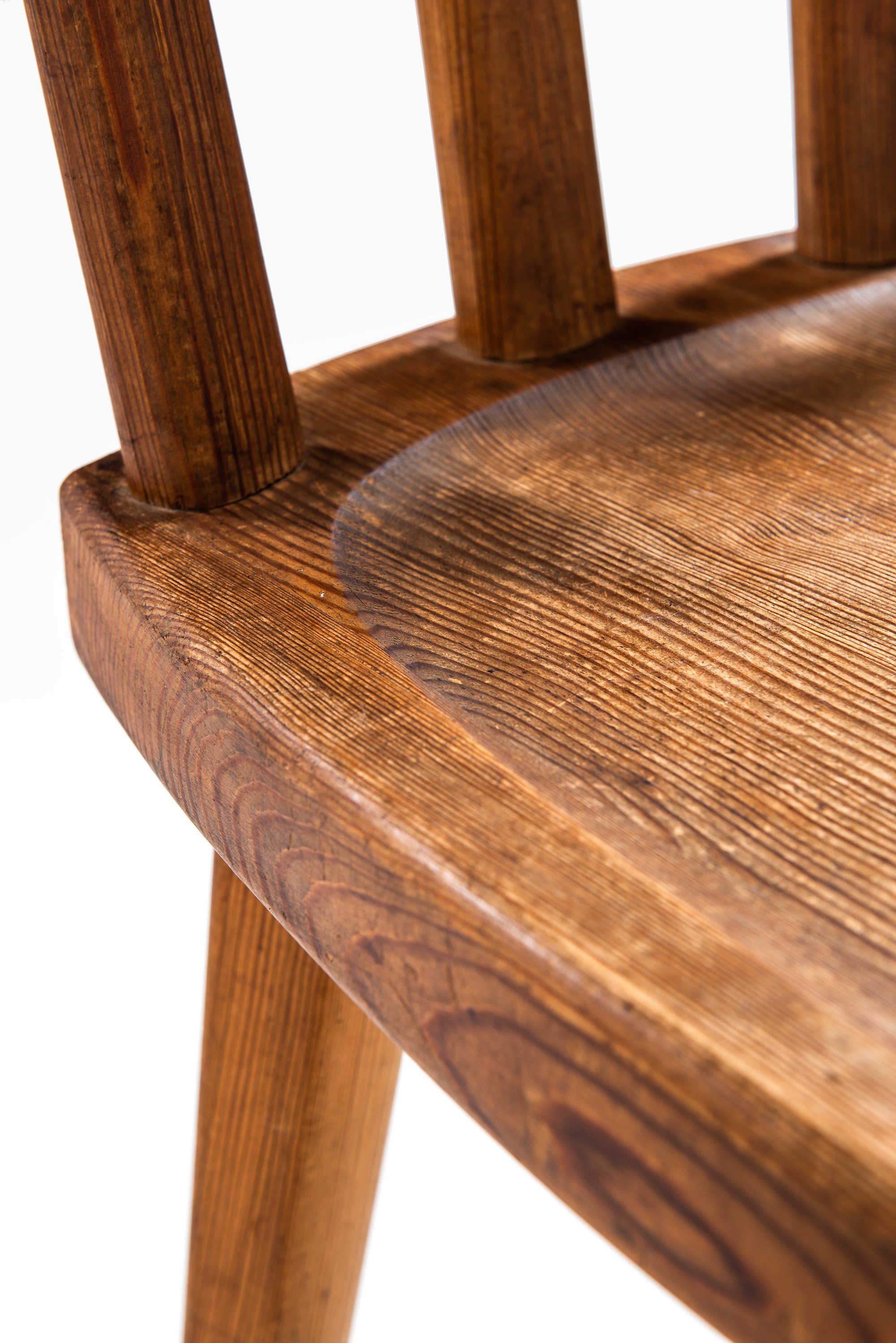 Each chair displays Hjorth’s mastery of proportion and material: the slightly tapered legs and sculpted seat convey solidity and comfort, while the curved top rail and vertical back slats introduce rhythm and lightness. The visible grain and warm tone of the pine are accentuated by the acid staining, lending depth and a rich, tactile patina that has matured beautifully over time.