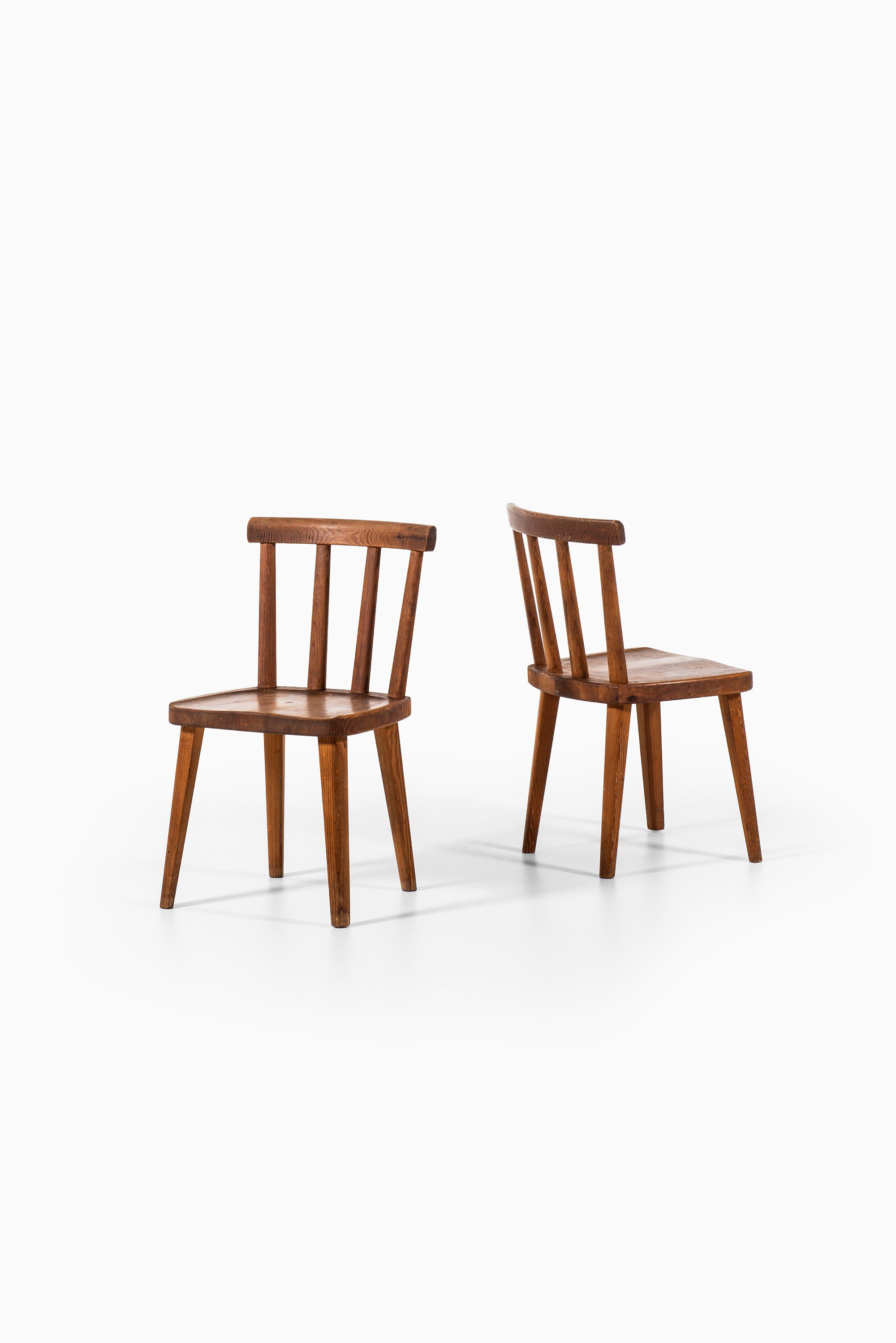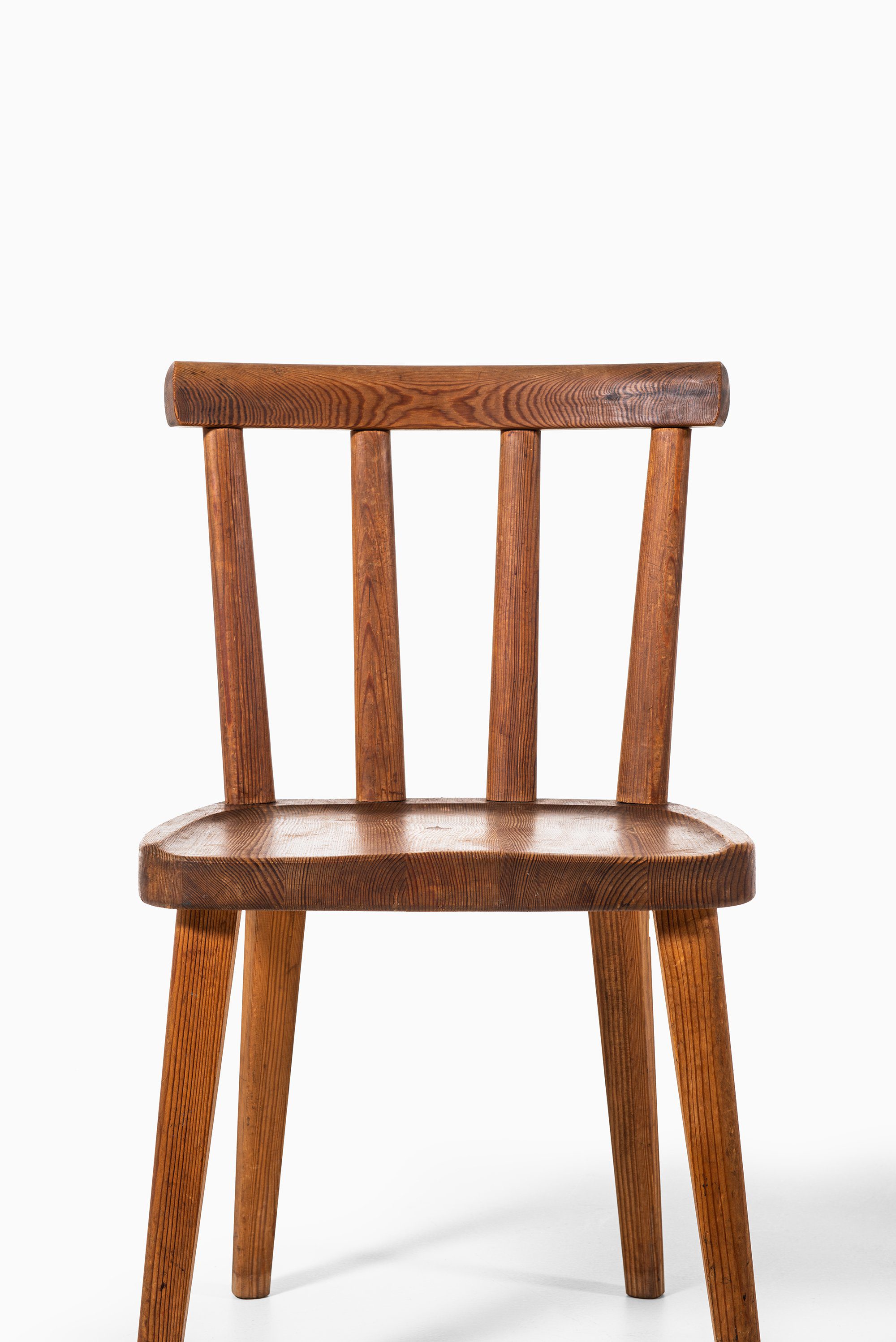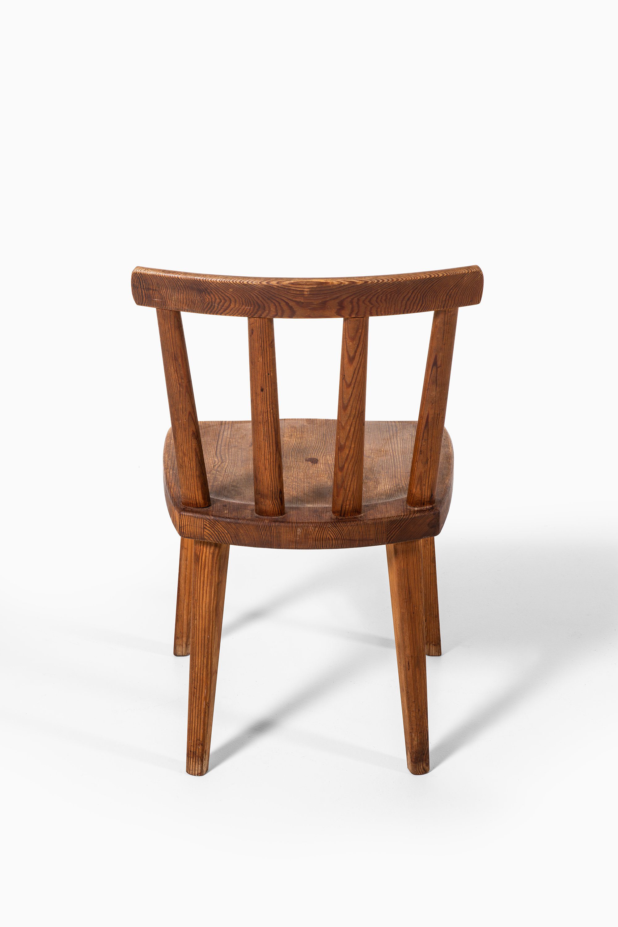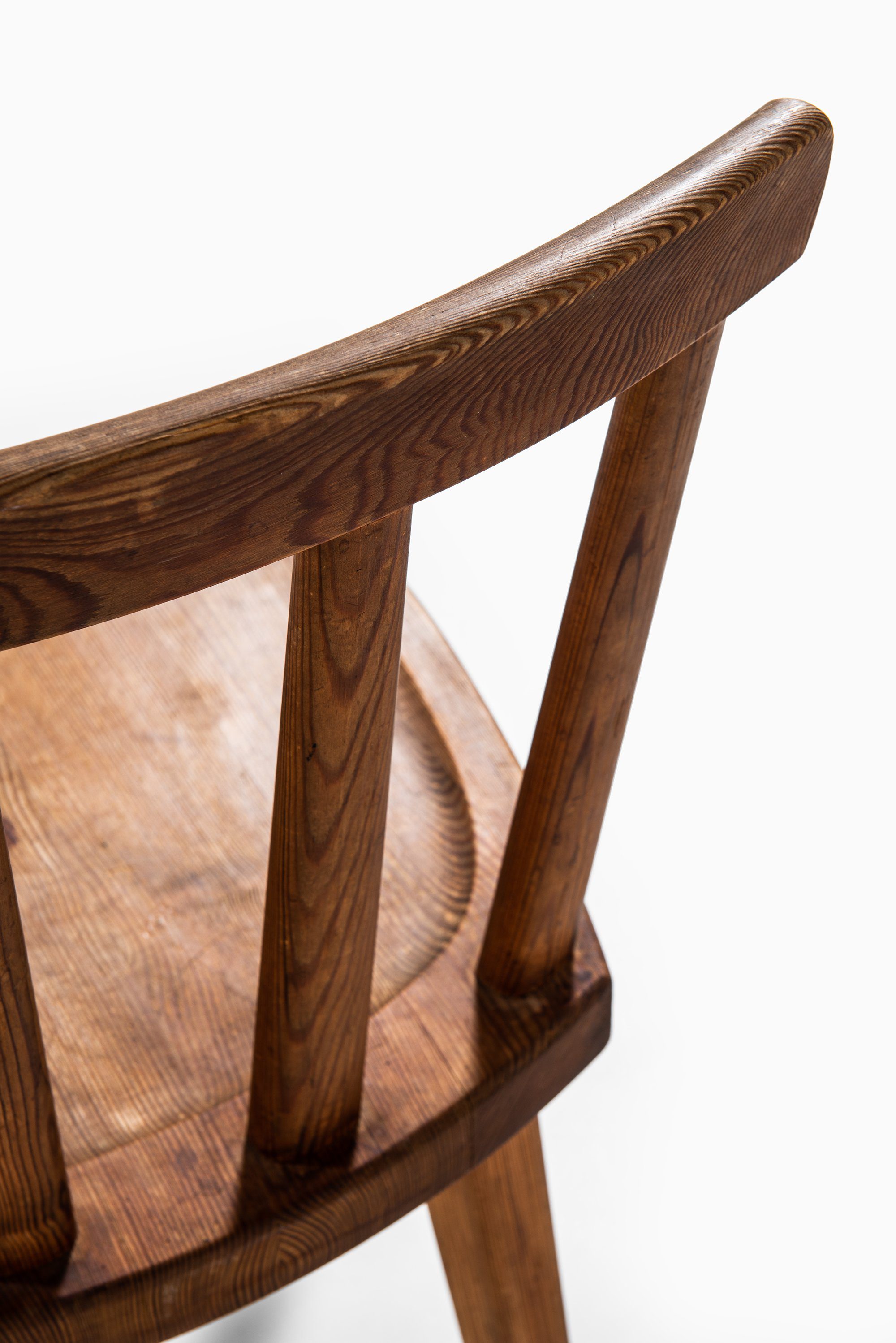 Each chair displays Hjorth’s mastery of proportion and material: the slightly tapered legs and sculpted seat convey solidity and comfort, while the curved top rail and vertical back slats introduce rhythm and lightness. The visible grain and warm tone of the pine are accentuated by the acid staining, lending depth and a rich, tactile patina that has matured beautifully over time.