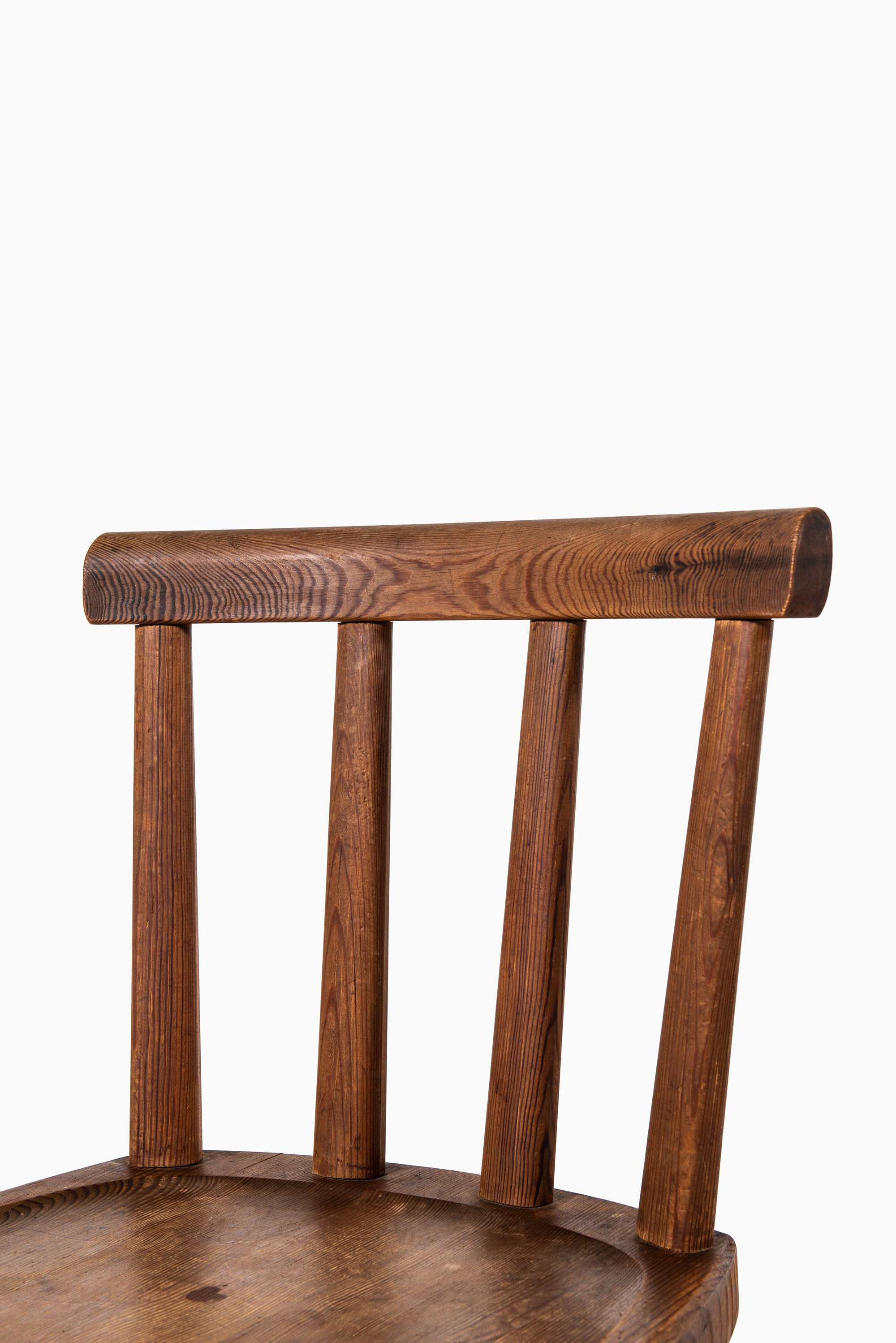 This rare set of six “Utö” dining chairs was designed by Axel Einar Hjorth and produced by Nordiska Kompaniet in Sweden during the 1930s. Executed in acid-stained pine, the chairs exemplify Hjorth’s distinctive “Sportstugemöbler” series — furniture created for the Swedish archipelago’s summer houses that combined rustic simplicity with refined modernist craftsmanship.