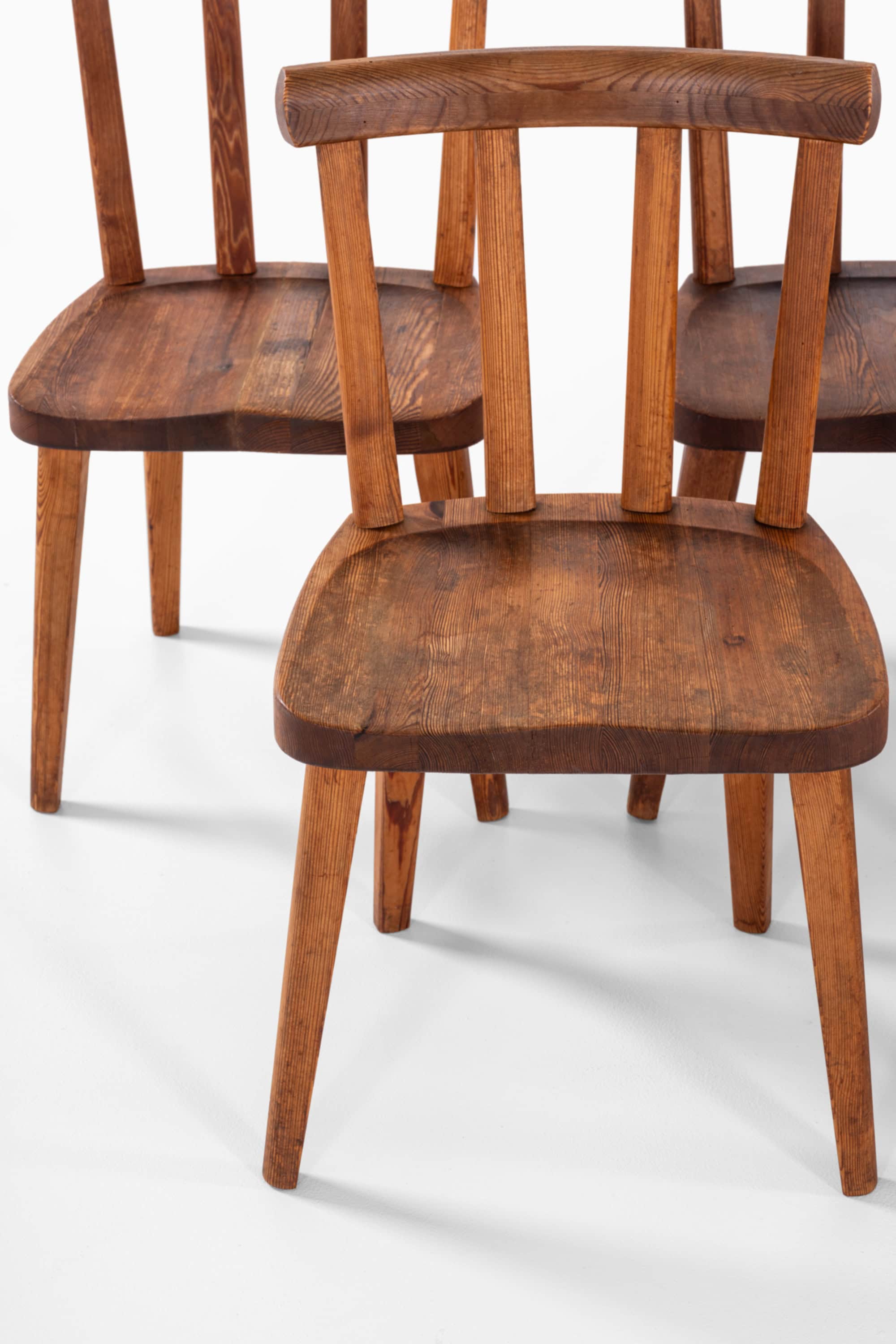 The design is defined by its honest construction and sculptural proportions. Each chair features a thick plank seat with softly rounded edges, supported by sturdy tapered legs. The backrest is formed by three vertical slats and a gently curved top rail, giving the chairs a characteristic architectural silhouette while still maintaining a warm, handmade expression. The visible grain, knots and natural variations of the pine enhance the rustic character and highlight the craftsmanship typical of Nordiska Kompaniet’s production.
