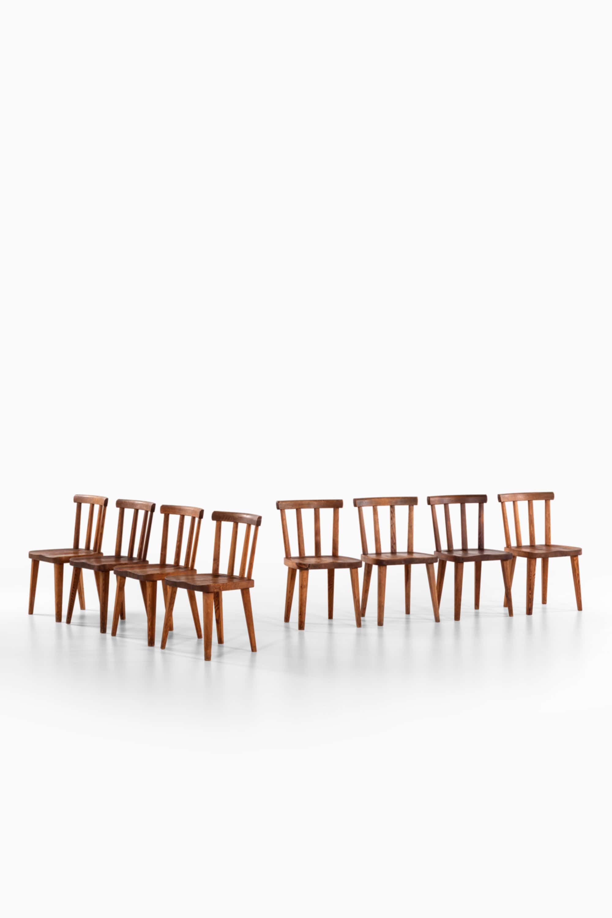 Rare set of eight dining chairs, model “Utö”, designed by Axel Einar Hjorth and produced by Nordiska Kompaniet in Sweden during the 1930s. Made in solid pine, these chairs belong to Hjorth’s celebrated Sportstugemöbler series, created for Swedish holiday homes and mountain lodges, where durability and rustic simplicity were essential.