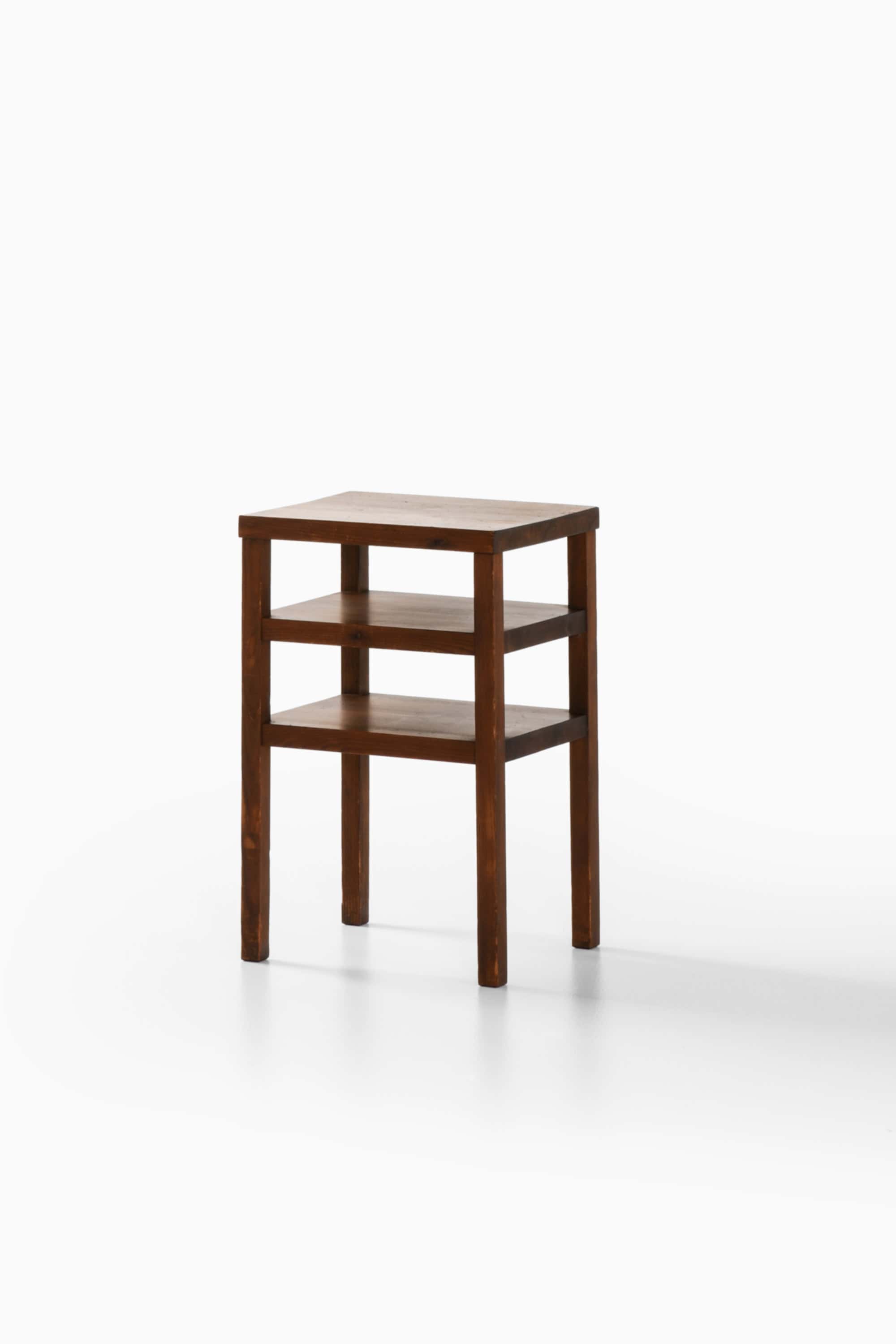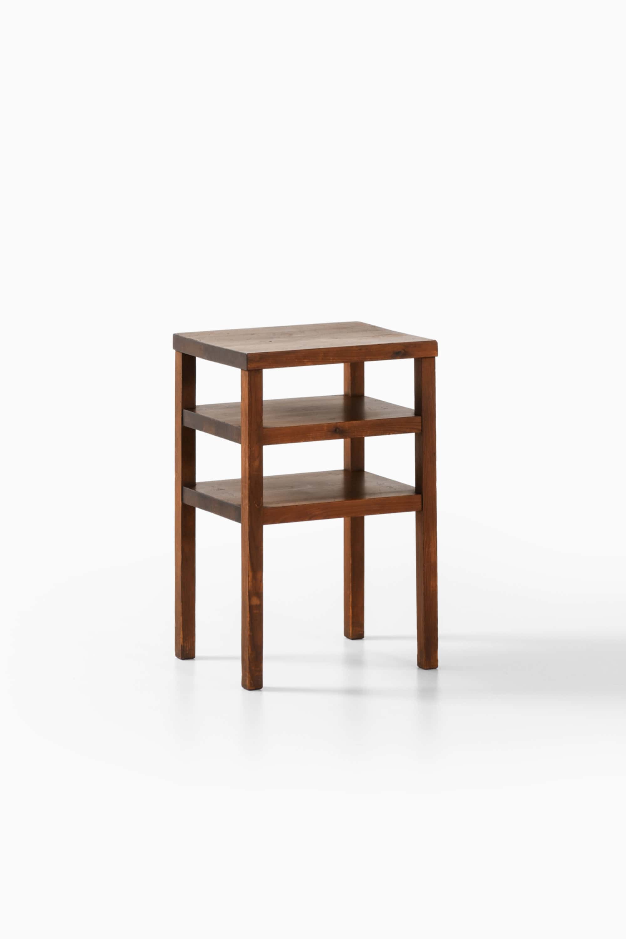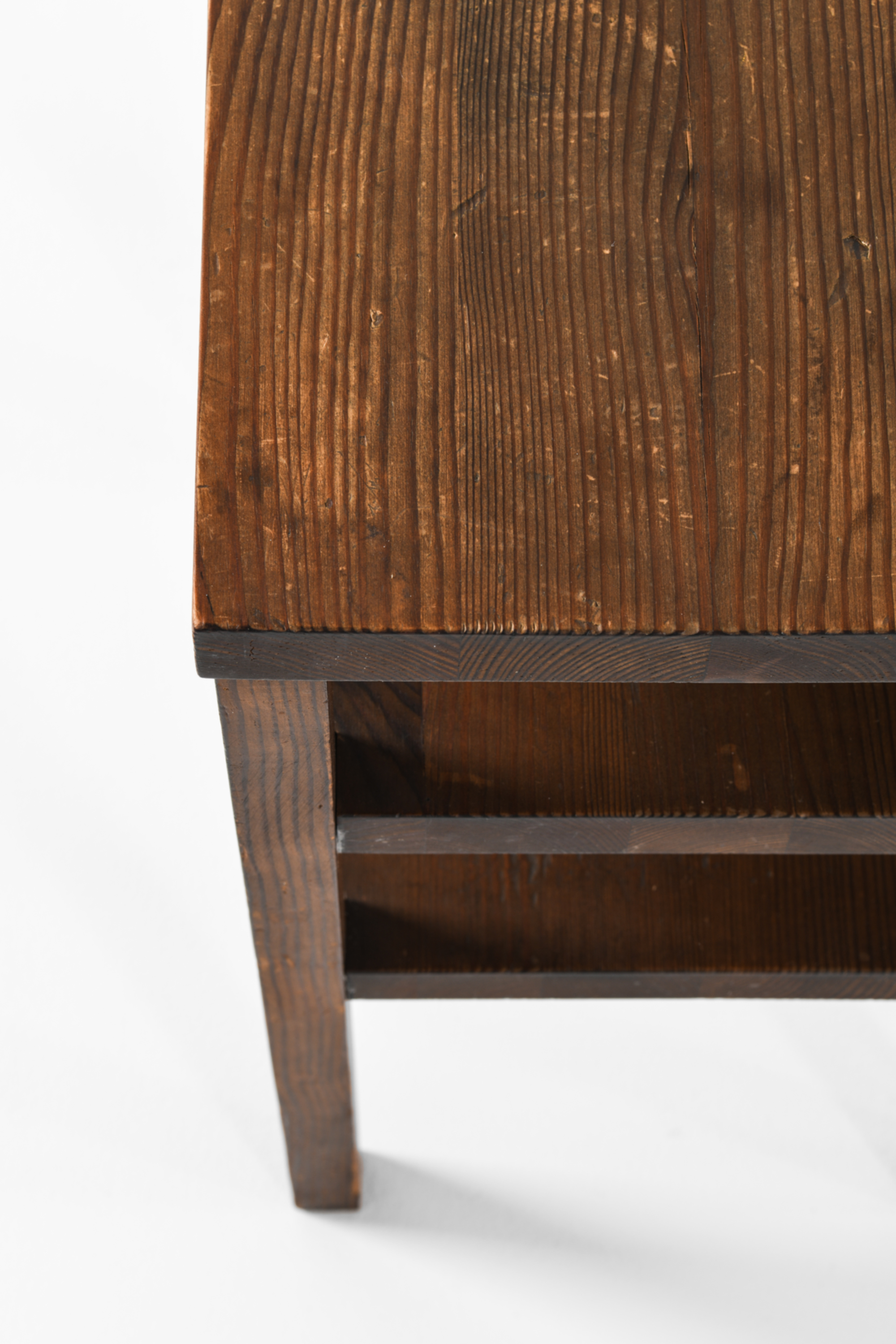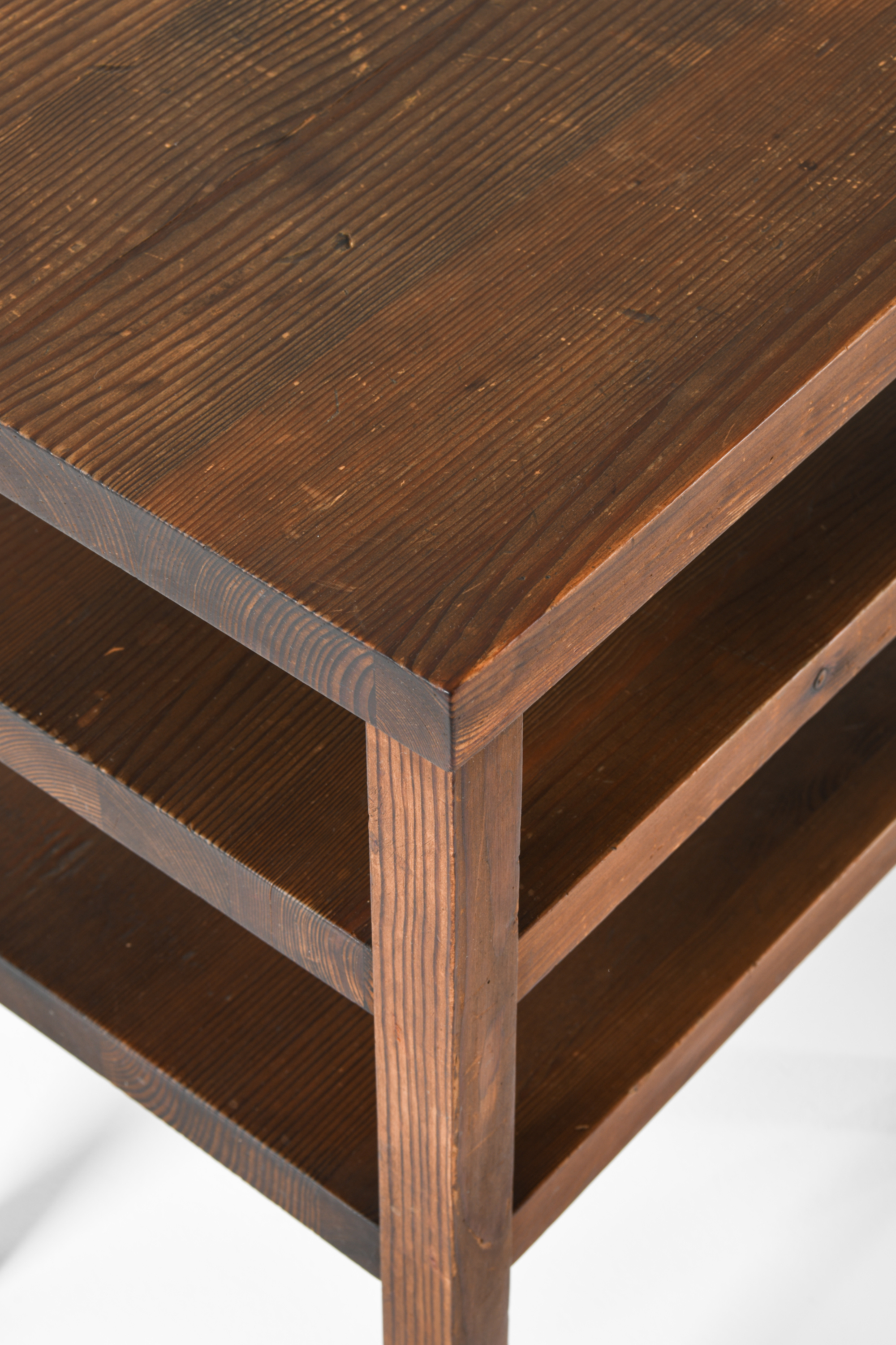 This rare side table, model Sport, was designed by Axel Einar Hjorth and produced by Nordiska Kompaniet in Sweden during the 1930s. It is made of solid pine with a darkened surface tone that highlights the natural grain structure of the wood. The construction is straightforward and functional, consisting of four square legs supporting a rectangular top and two open shelves. The design is characterized by simplicity and clarity, with visible joints and minimal ornamentation.