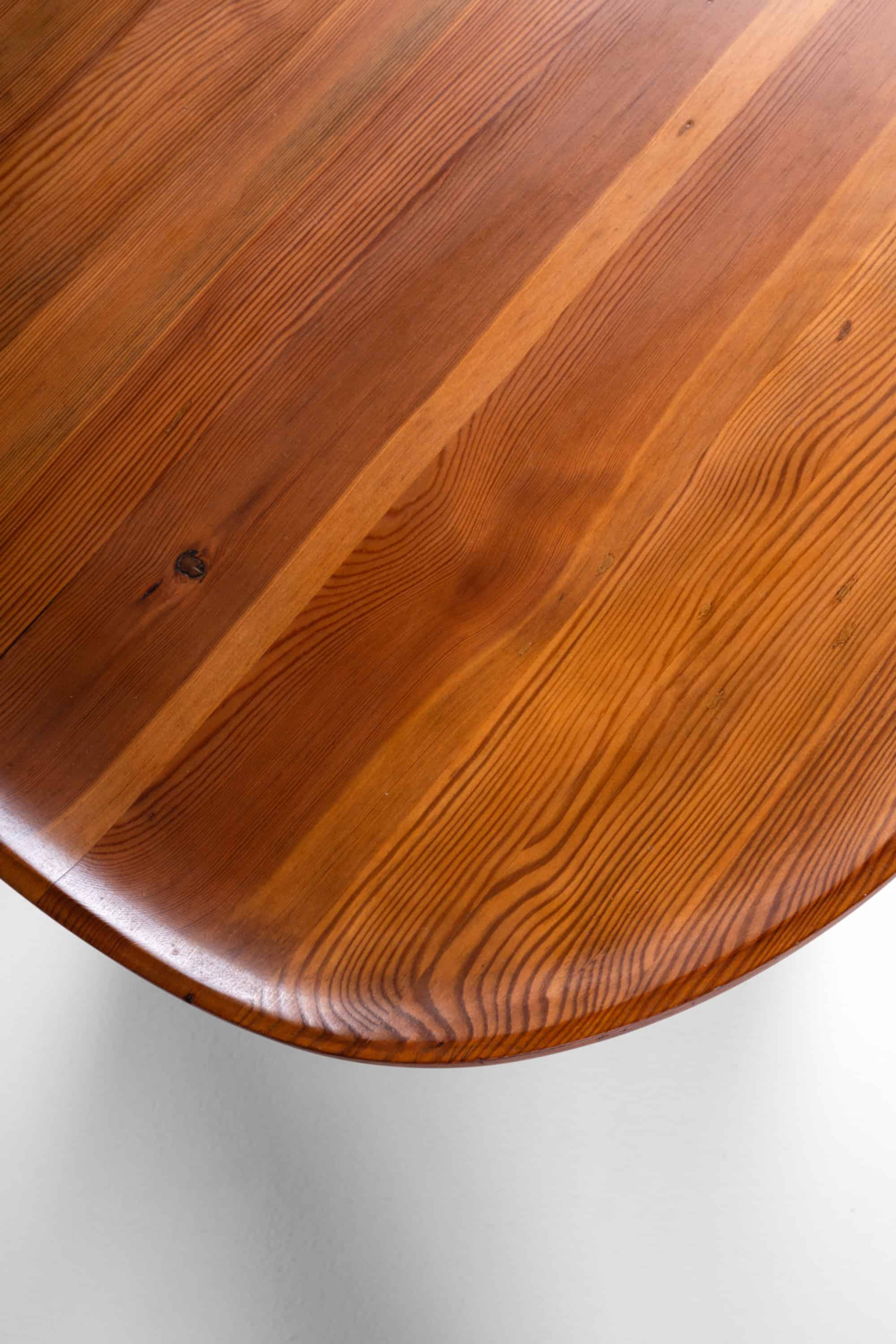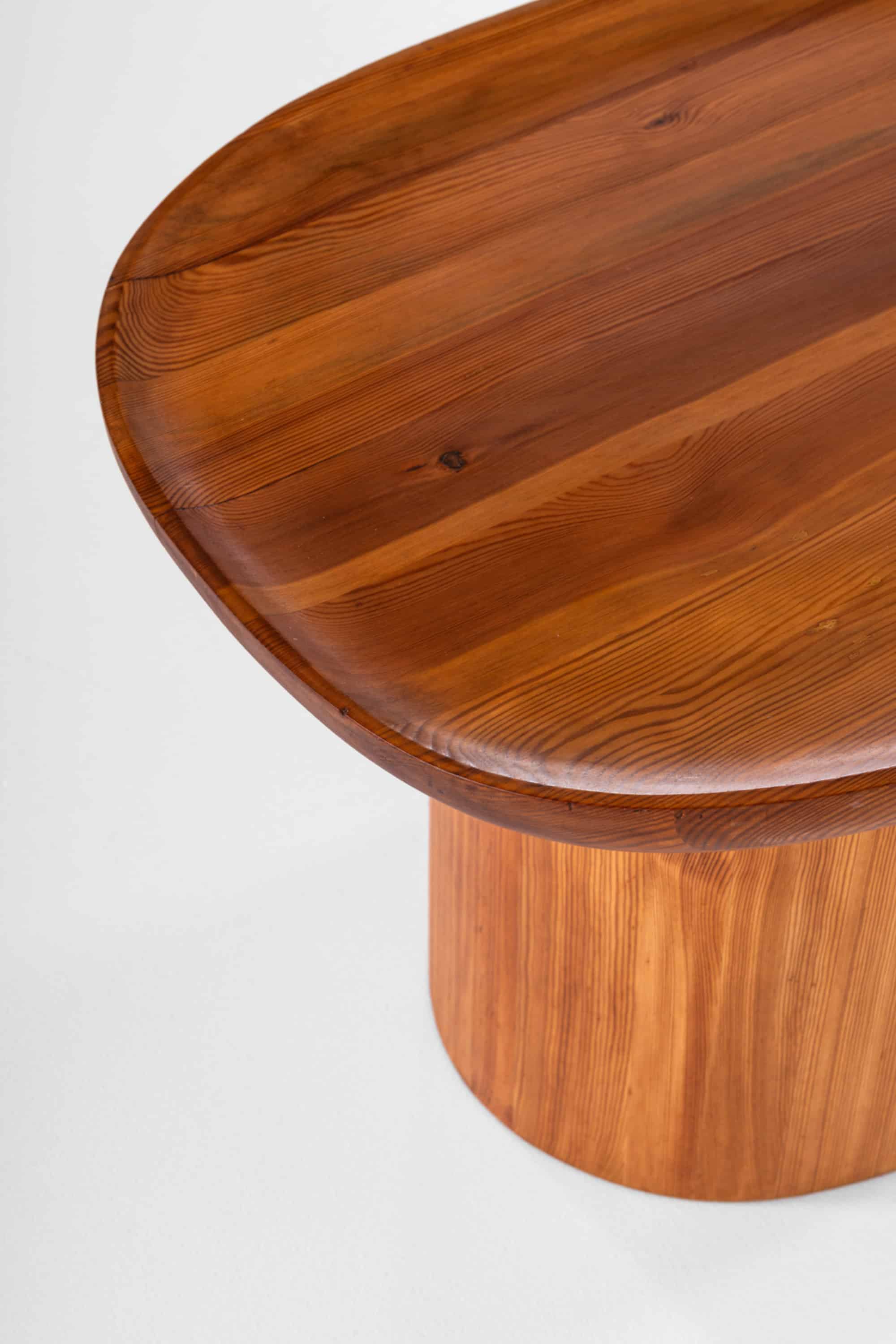 The table is executed in solid pine, with a softly rounded, organic tabletop resting on a cylindrical pedestal base. The top is subtly oval in plan, with a shallow dished profile and gently raised edge that emphasizes the thickness of the solid wood and the natural flow of the grain. The pedestal base is constructed from vertically oriented boards, creating a strong architectural presence while allowing the natural variations and growth patterns of the pine to remain visually prominent. The warm, honey-toned surface highlights the lively grain, knots, and tonal shifts that are central to the character of the Sportstugemöbler series.