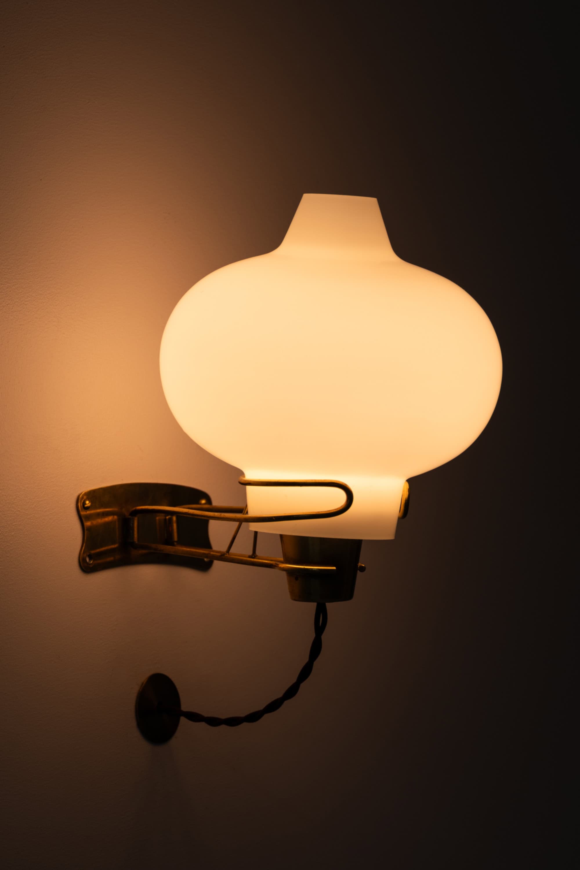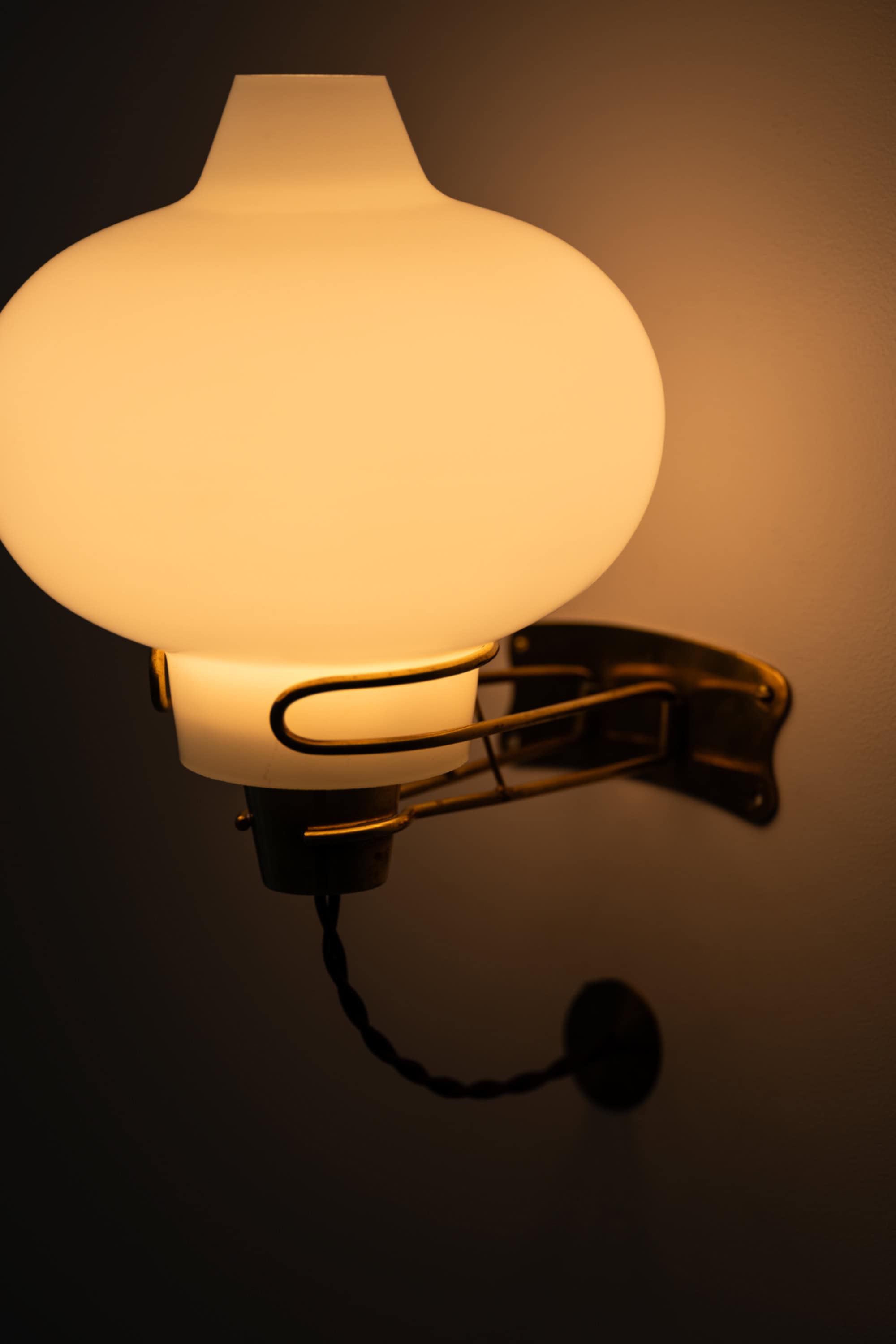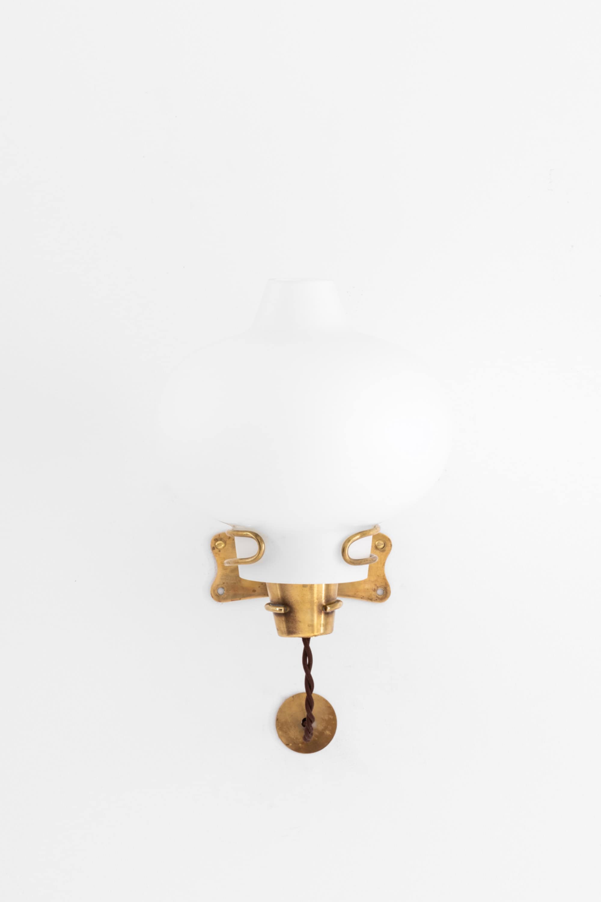 The shade is executed in white opaline glass with a rounded, almost pumpkin-shaped body and a narrower neck. The glass diffuses the light evenly, producing a soft and warm glow that enhances the sculptural silhouette when illuminated. The contrast between the matte opaline surface and the aged brass creates a balanced composition typical of Danish mid-century lighting. The lamps are fitted with twisted brown fabric cords, adding to the authentic period character.