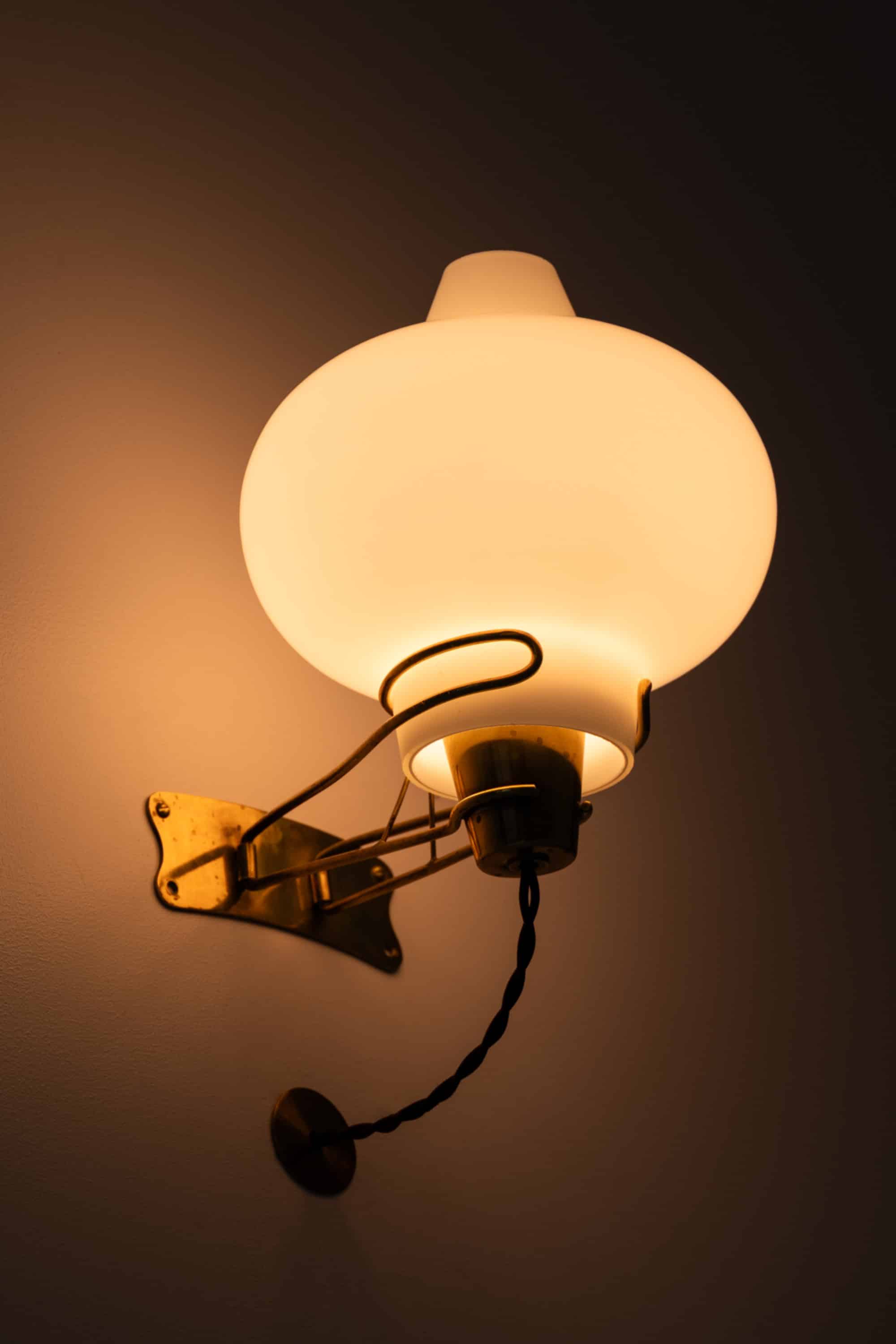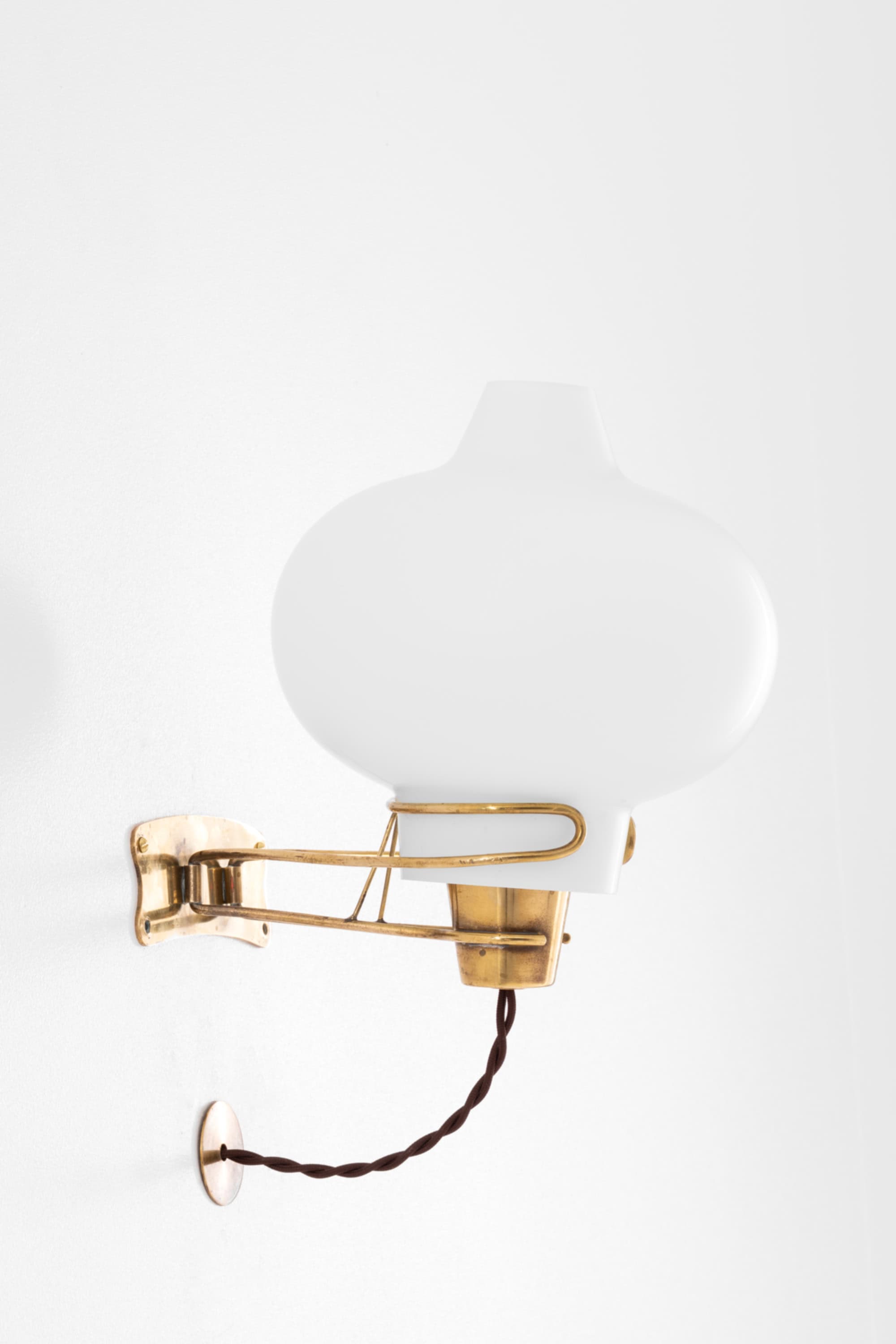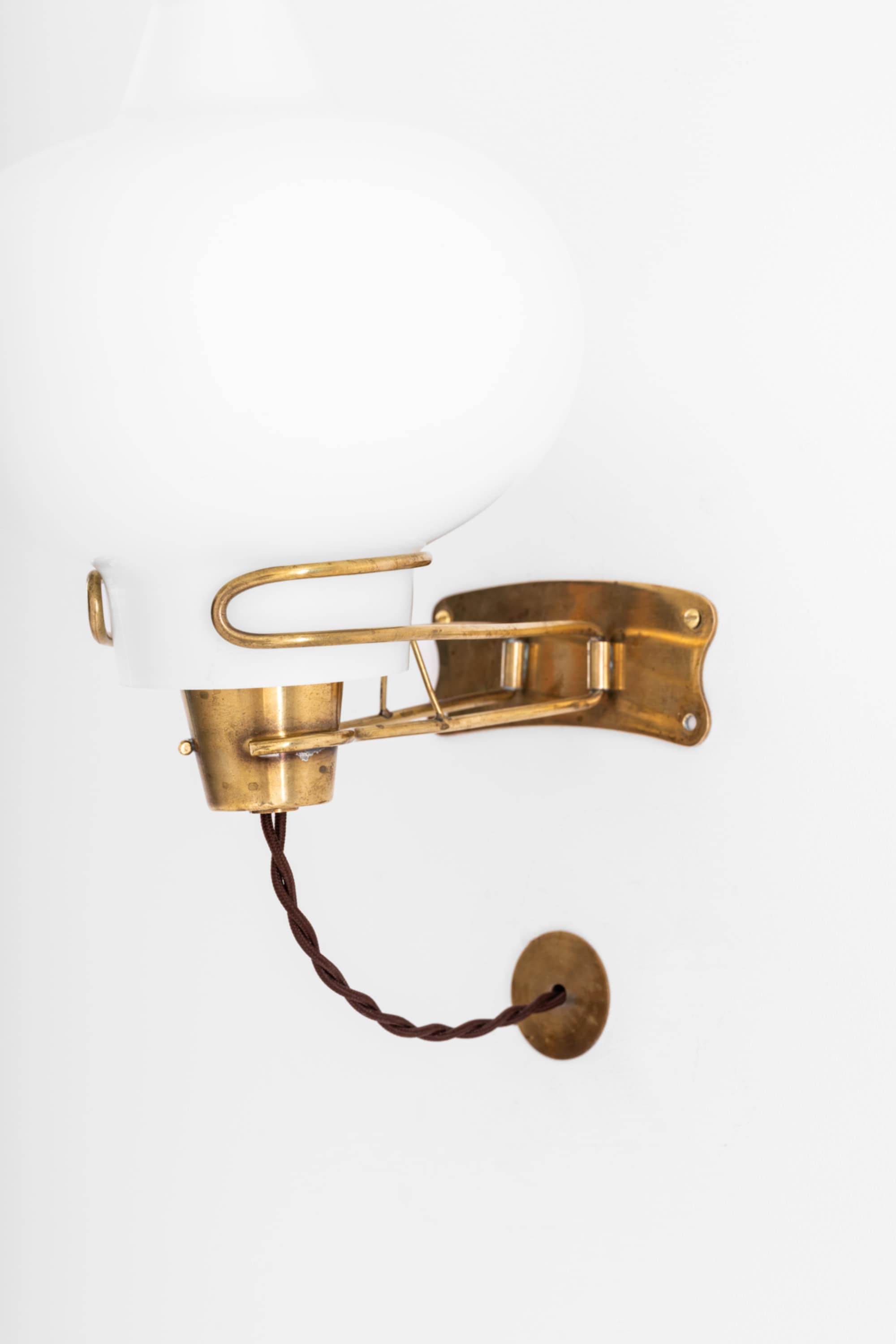 Each lamp is constructed with a solid brass wall mount and articulated arm, supporting a voluminous opaline glass shade. The wall plate has a softly contoured outline with visible screws, characteristic of the period, and carries a warm, natural brass patina developed over time. The arm is formed from slender brass rods with gentle curves, creating a light and almost floating appearance while ensuring structural stability. A small supporting strut beneath the arm adds both strength and a refined technical detail.