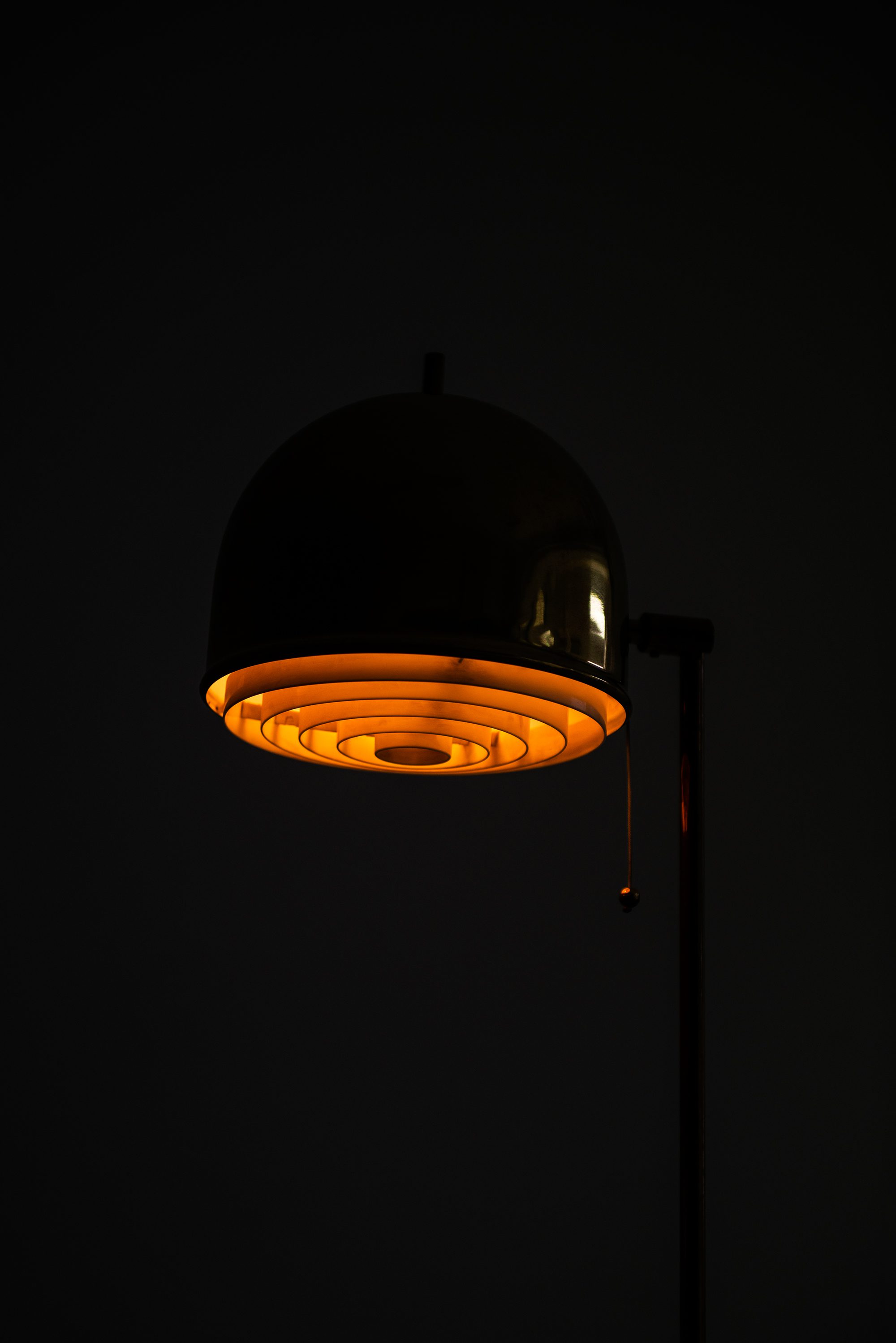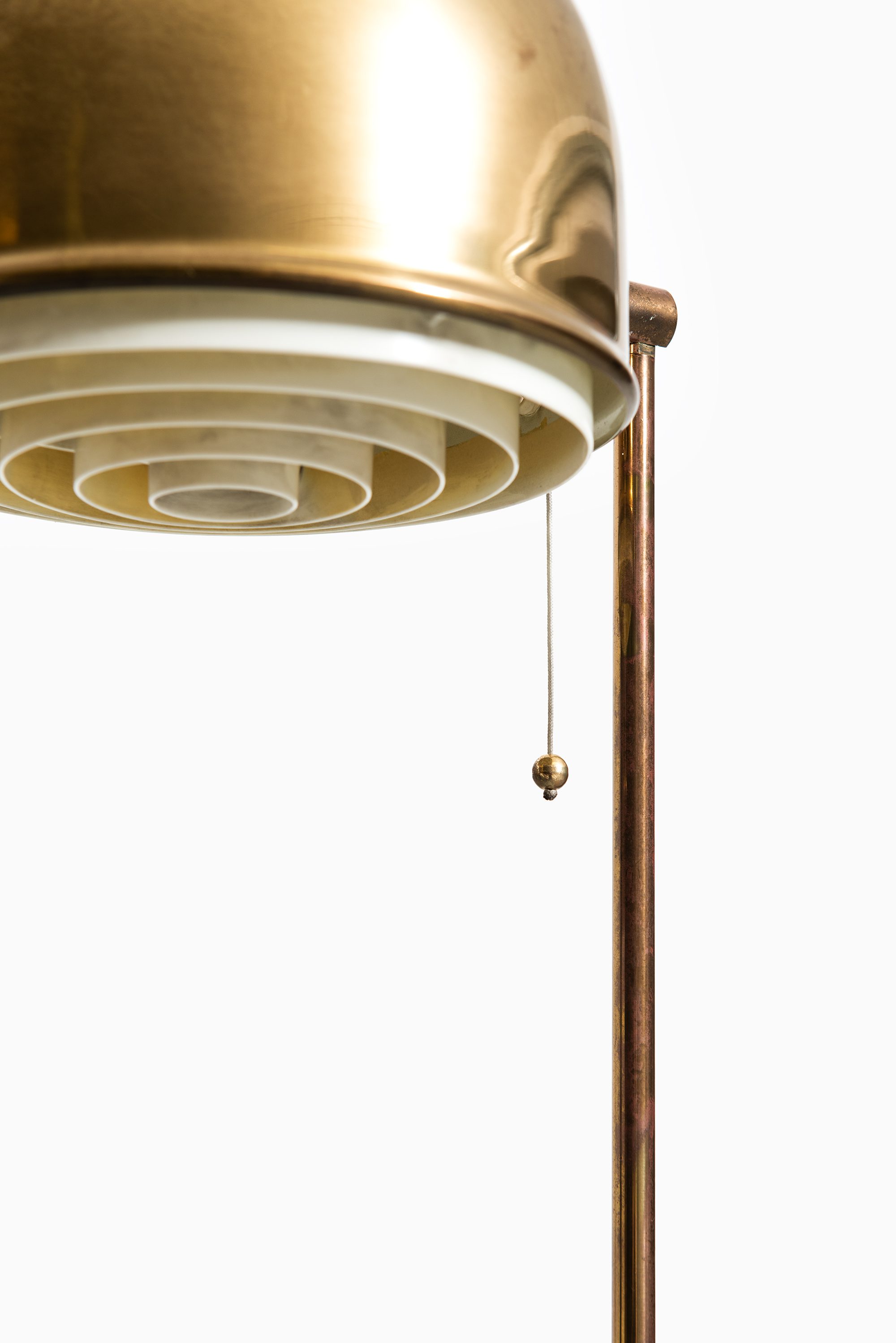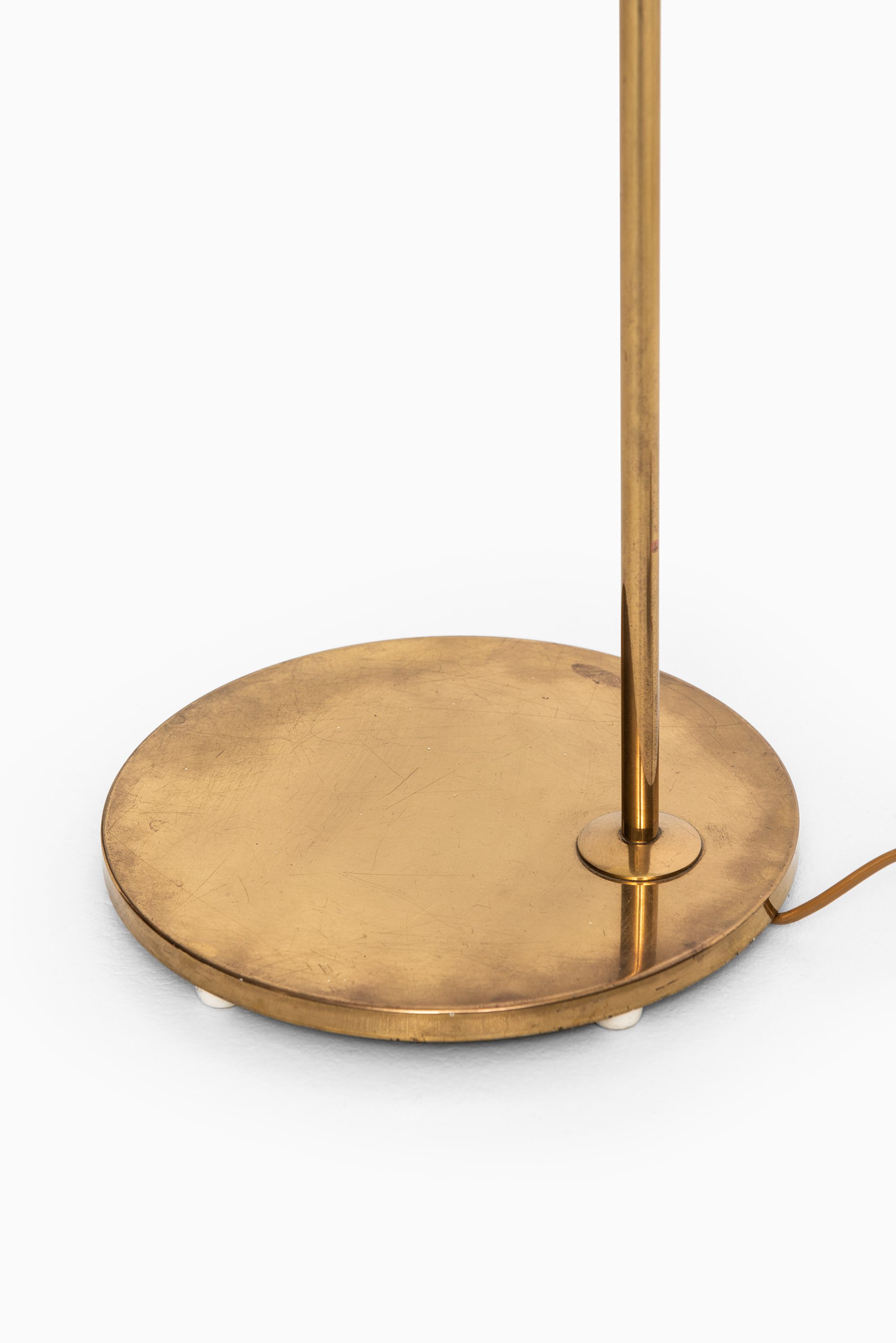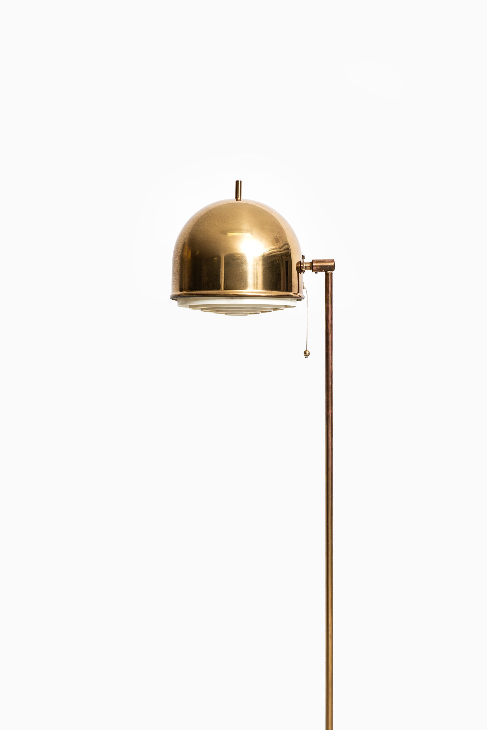 This rare floor lamp, model G-075, was produced by the Swedish lighting manufacturer Bergboms during the 1950s, a period when Scandinavian design was defined by its minimalist forms, refined materials, and functional elegance. Executed entirely in brass, the lamp embodies mid-century modern sensibilities, combining timeless geometry with a focus on material expression. The hemispherical shade, balanced atop a slender vertical stem and circular base, gives the piece a distinctive architectural presence.